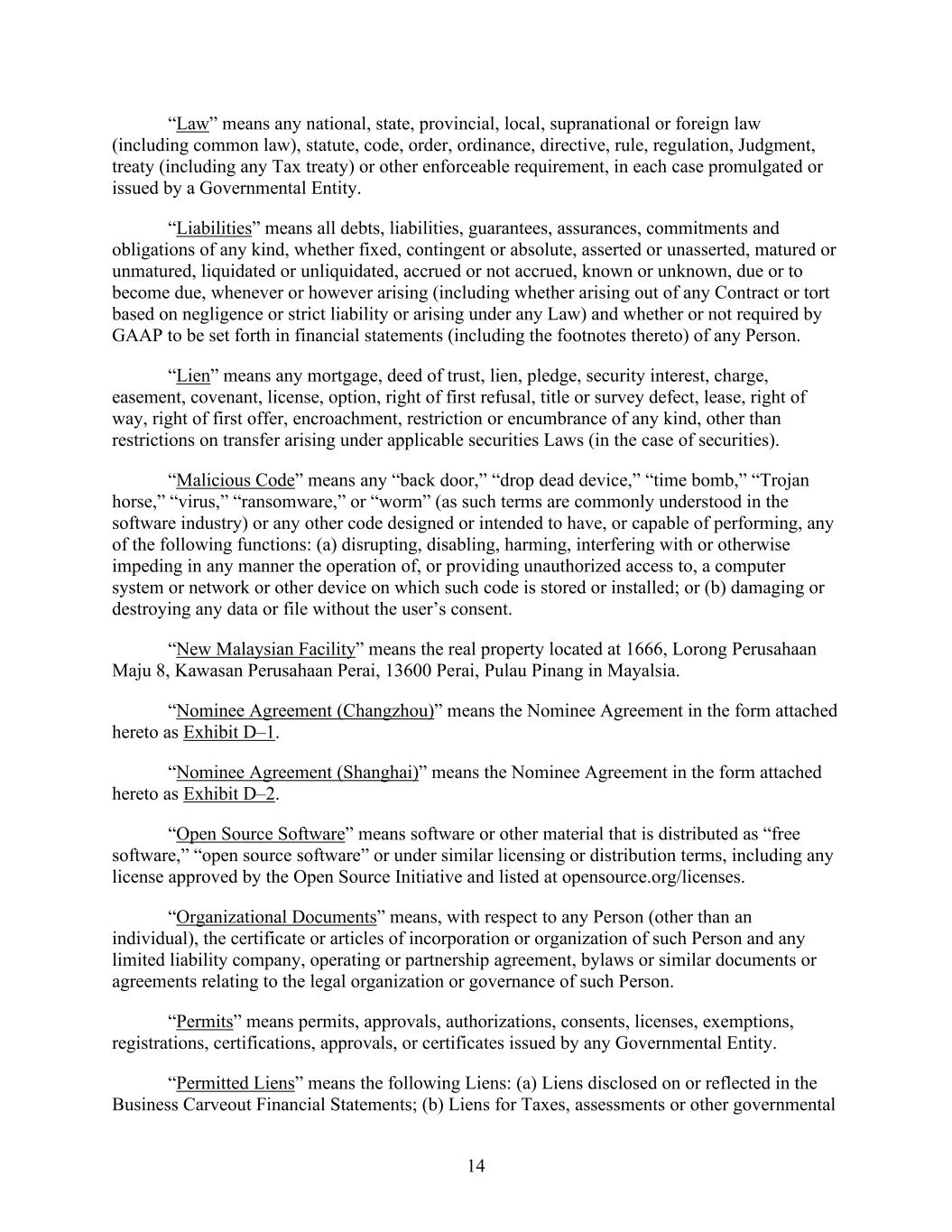 14 “Law” means any national, state, provincial, local, supranational or foreign law (including common law), statute, code, order, ordinance, directive, rule, regulation, Judgment, treaty (including any Tax treaty) or other enforceable requirement, in each case promulgated or issued by a Governmental Entity. “Liabilities” means all debts, liabilities, guarantees, assurances, commitments and obligations of any kind, whether fixed, contingent or absolute, asserted or unasserted, matured or unmatured, liquidated or unliquidated, accrued or not accrued, known or unknown, due or to become due, whenever or however arising (including whether arising out of any Contract or tort based on negligence or strict liability or arising under any Law) and whether or not required by GAAP to be set forth in financial statements (including the footnotes thereto) of any Person. “Lien” means any mortgage, deed of trust, lien, pledge, security interest, charge, easement, covenant, license, option, right of first refusal, title or survey defect, lease, right of way, right of first offer, encroachment, restriction or encumbrance of any kind, other than restrictions on transfer arising under applicable securities Laws (in the case of securities). “Malicious Code” means any “back door,” “drop dead device,” “time bomb,” “Trojan horse,” “virus,” “ransomware,” or “worm” (as such terms are commonly understood in the software industry) or any other code designed or intended to have, or capable of performing, any of the following functions: (a) disrupting, disabling, harming, interfering with or otherwise impeding in any manner the operation of, or providing unauthorized access to, a computer system or network or other device on which such code is stored or installed; or (b) damaging or destroying any data or file without the user’s consent. “New Malaysian Facility” means the real property located at 1666, Lorong Perusahaan Maju 8, Kawasan Perusahaan Perai, 13600 Perai, Pulau Pinang in Mayalsia. “Nominee Agreement (Changzhou)” means the Nominee Agreement in the form attached hereto as Exhibit D–1. “Nominee Agreement (Shanghai)” means the Nominee Agreement in the form attached hereto as Exhibit D–2. “Open Source Software” means software or other material that is distributed as “free software,” “open source software” or under similar licensing or distribution terms, including any license approved by the Open Source Initiative and listed at opensource.org/licenses. “Organizational Documents” means, with respect to any Person (other than an individual), the certificate or articles of incorporation or organization of such Person and any limited liability company, operating or partnership agreement, bylaws or similar documents or agreements relating to the legal organization or governance of such Person. “Permits” means permits, approvals, authorizations, consents, licenses, exemptions, registrations, certifications, approvals, or certificates issued by any Governmental Entity. “Permitted Liens” means the following Liens: (a) Liens disclosed on or reflected in the Business Carveout Financial Statements; (b) Liens for Taxes, assessments or other governmental