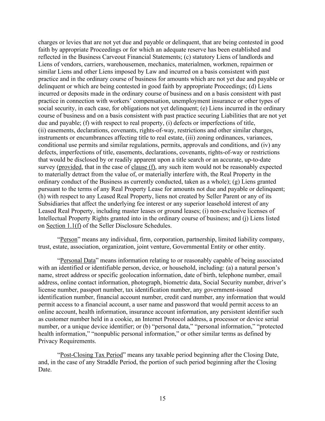 15 charges or levies that are not yet due and payable or delinquent, that are being contested in good faith by appropriate Proceedings or for which an adequate reserve has been established and reflected in the Business Carveout Financial Statements; (c) statutory Liens of landlords and Liens of vendors, carriers, warehousemen, mechanics, materialmen, workmen, repairmen or similar Liens and other Liens imposed by Law and incurred on a basis consistent with past practice and in the ordinary course of business for amounts which are not yet due and payable or delinquent or which are being contested in good faith by appropriate Proceedings; (d) Liens incurred or deposits made in the ordinary course of business and on a basis consistent with past practice in connection with workers’ compensation, unemployment insurance or other types of social security, in each case, for obligations not yet delinquent; (e) Liens incurred in the ordinary course of business and on a basis consistent with past practice securing Liabilities that are not yet due and payable; (f) with respect to real property, (i) defects or imperfections of title, (ii) easements, declarations, covenants, rights-of-way, restrictions and other similar charges, instruments or encumbrances affecting title to real estate, (iii) zoning ordinances, variances, conditional use permits and similar regulations, permits, approvals and conditions, and (iv) any defects, imperfections of title, easements, declarations, covenants, rights-of-way or restrictions that would be disclosed by or readily apparent upon a title search or an accurate, up-to-date survey (provided, that in the case of clause (f), any such item would not be reasonably expected to materially detract from the value of, or materially interfere with, the Real Property in the ordinary conduct of the Business as currently conducted, taken as a whole); (g) Liens granted pursuant to the terms of any Real Property Lease for amounts not due and payable or delinquent; (h) with respect to any Leased Real Property, liens not created by Seller Parent or any of its Subsidiaries that affect the underlying fee interest or any superior leasehold interest of any Leased Real Property, including master leases or ground leases; (i) non-exclusive licenses of Intellectual Property Rights granted into in the ordinary course of business; and (j) Liens listed on Section 1.1(f) of the Seller Disclosure Schedules. “Person” means any individual, firm, corporation, partnership, limited liability company, trust, estate, association, organization, joint venture, Governmental Entity or other entity. “Personal Data” means information relating to or reasonably capable of being associated with an identified or identifiable person, device, or household, including: (a) a natural person’s name, street address or specific geolocation information, date of birth, telephone number, email address, online contact information, photograph, biometric data, Social Security number, driver’s license number, passport number, tax identification number, any government-issued identification number, financial account number, credit card number, any information that would permit access to a financial account, a user name and password that would permit access to an online account, health information, insurance account information, any persistent identifier such as customer number held in a cookie, an Internet Protocol address, a processor or device serial number, or a unique device identifier; or (b) “personal data,” “personal information,” “protected health information,” “nonpublic personal information,” or other similar terms as defined by Privacy Requirements. “Post-Closing Tax Period” means any taxable period beginning after the Closing Date, and, in the case of any Straddle Period, the portion of such period beginning after the Closing Date.