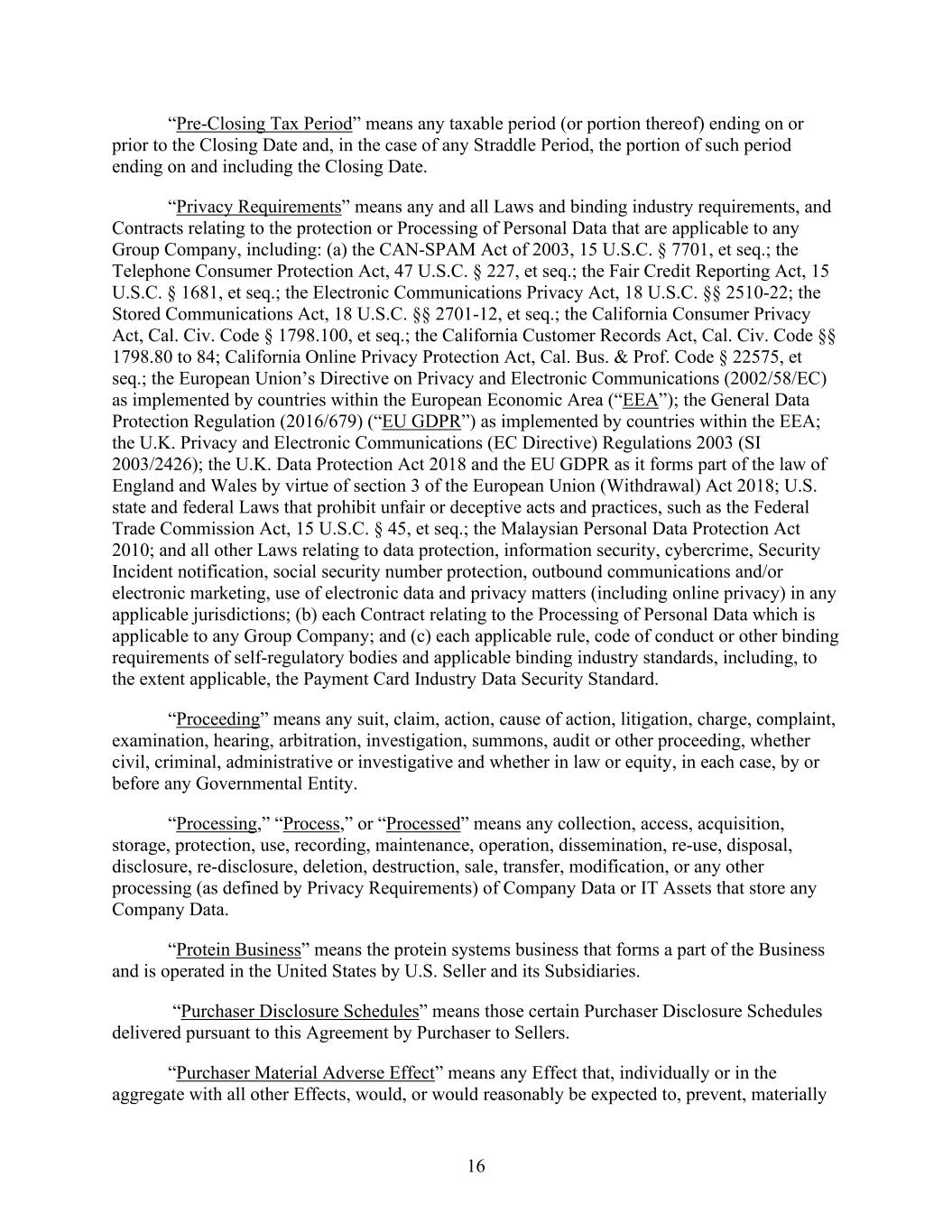 16 “Pre-Closing Tax Period” means any taxable period (or portion thereof) ending on or prior to the Closing Date and, in the case of any Straddle Period, the portion of such period ending on and including the Closing Date. “Privacy Requirements” means any and all Laws and binding industry requirements, and Contracts relating to the protection or Processing of Personal Data that are applicable to any Group Company, including: (a) the CAN-SPAM Act of 2003, 15 U.S.C. § 7701, et seq.; the Telephone Consumer Protection Act, 47 U.S.C. § 227, et seq.; the Fair Credit Reporting Act, 15 U.S.C. § 1681, et seq.; the Electronic Communications Privacy Act, 18 U.S.C. §§ 2510-22; the Stored Communications Act, 18 U.S.C. §§ 2701-12, et seq.; the California Consumer Privacy Act, Cal. Civ. Code § 1798.100, et seq.; the California Customer Records Act, Cal. Civ. Code §§ 1798.80 to 84; California Online Privacy Protection Act, Cal. Bus. & Prof. Code § 22575, et seq.; the European Union’s Directive on Privacy and Electronic Communications (2002/58/EC) as implemented by countries within the European Economic Area (“EEA”); the General Data Protection Regulation (2016/679) (“EU GDPR”) as implemented by countries within the EEA; the U.K. Privacy and Electronic Communications (EC Directive) Regulations 2003 (SI 2003/2426); the U.K. Data Protection Act 2018 and the EU GDPR as it forms part of the law of England and Wales by virtue of section 3 of the European Union (Withdrawal) Act 2018; U.S. state and federal Laws that prohibit unfair or deceptive acts and practices, such as the Federal Trade Commission Act, 15 U.S.C. § 45, et seq.; the Malaysian Personal Data Protection Act 2010; and all other Laws relating to data protection, information security, cybercrime, Security Incident notification, social security number protection, outbound communications and/or electronic marketing, use of electronic data and privacy matters (including online privacy) in any applicable jurisdictions; (b) each Contract relating to the Processing of Personal Data which is applicable to any Group Company; and (c) each applicable rule, code of conduct or other binding requirements of self-regulatory bodies and applicable binding industry standards, including, to the extent applicable, the Payment Card Industry Data Security Standard. “Proceeding” means any suit, claim, action, cause of action, litigation, charge, complaint, examination, hearing, arbitration, investigation, summons, audit or other proceeding, whether civil, criminal, administrative or investigative and whether in law or equity, in each case, by or before any Governmental Entity. “Processing,” “Process,” or “Processed” means any collection, access, acquisition, storage, protection, use, recording, maintenance, operation, dissemination, re-use, disposal, disclosure, re-disclosure, deletion, destruction, sale, transfer, modification, or any other processing (as defined by Privacy Requirements) of Company Data or IT Assets that store any Company Data. “Protein Business” means the protein systems business that forms a part of the Business and is operated in the United States by U.S. Seller and its Subsidiaries. “Purchaser Disclosure Schedules” means those certain Purchaser Disclosure Schedules delivered pursuant to this Agreement by Purchaser to Sellers. “Purchaser Material Adverse Effect” means any Effect that, individually or in the aggregate with all other Effects, would, or would reasonably be expected to, prevent, materially