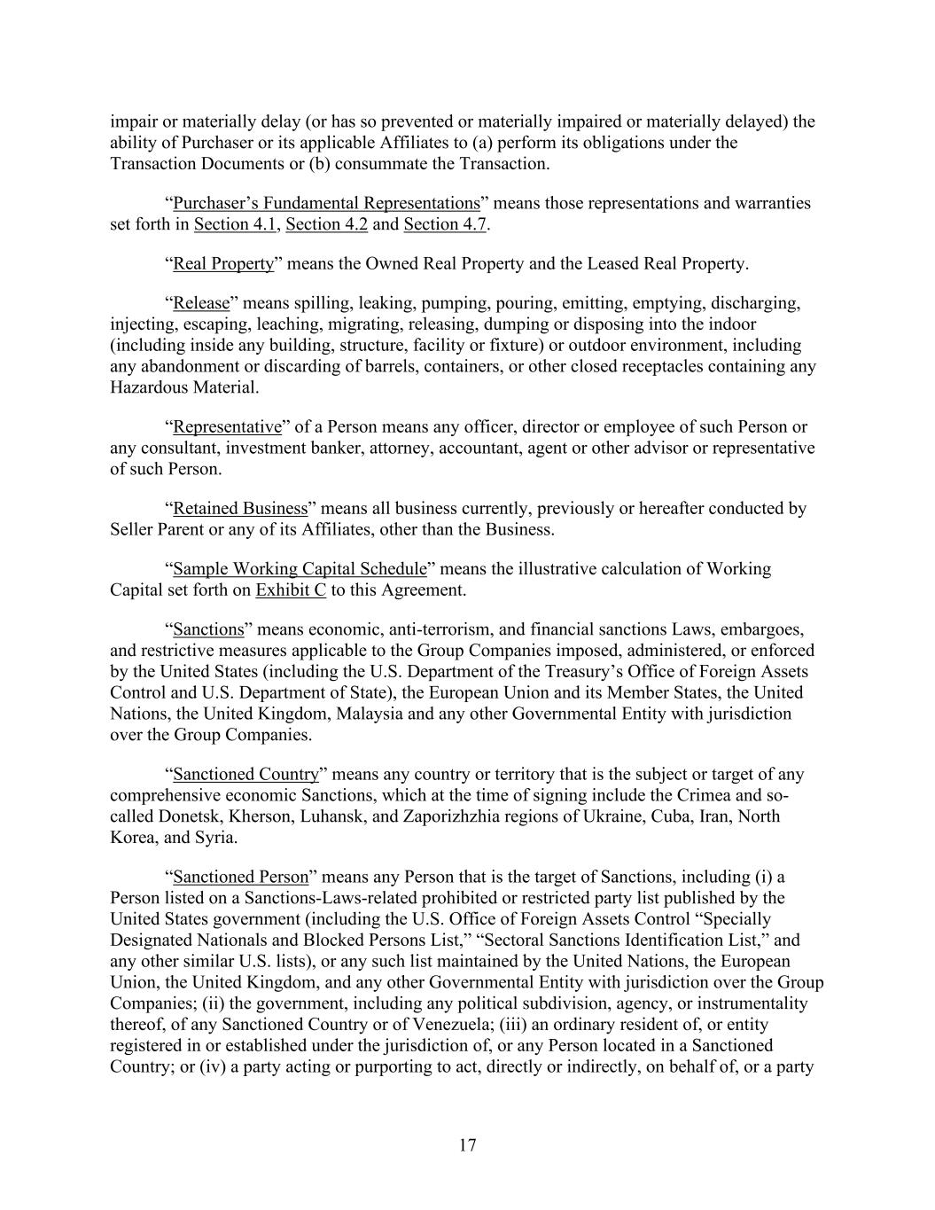 17 impair or materially delay (or has so prevented or materially impaired or materially delayed) the ability of Purchaser or its applicable Affiliates to (a) perform its obligations under the Transaction Documents or (b) consummate the Transaction. “Purchaser’s Fundamental Representations” means those representations and warranties set forth in Section 4.1, Section 4.2 and Section 4.7. “Real Property” means the Owned Real Property and the Leased Real Property. “Release” means spilling, leaking, pumping, pouring, emitting, emptying, discharging, injecting, escaping, leaching, migrating, releasing, dumping or disposing into the indoor (including inside any building, structure, facility or fixture) or outdoor environment, including any abandonment or discarding of barrels, containers, or other closed receptacles containing any Hazardous Material. “Representative” of a Person means any officer, director or employee of such Person or any consultant, investment banker, attorney, accountant, agent or other advisor or representative of such Person. “Retained Business” means all business currently, previously or hereafter conducted by Seller Parent or any of its Affiliates, other than the Business. “Sample Working Capital Schedule” means the illustrative calculation of Working Capital set forth on Exhibit C to this Agreement. “Sanctions” means economic, anti-terrorism, and financial sanctions Laws, embargoes, and restrictive measures applicable to the Group Companies imposed, administered, or enforced by the United States (including the U.S. Department of the Treasury’s Office of Foreign Assets Control and U.S. Department of State), the European Union and its Member States, the United Nations, the United Kingdom, Malaysia and any other Governmental Entity with jurisdiction over the Group Companies. “Sanctioned Country” means any country or territory that is the subject or target of any comprehensive economic Sanctions, which at the time of signing include the Crimea and so- called Donetsk, Kherson, Luhansk, and Zaporizhzhia regions of Ukraine, Cuba, Iran, North Korea, and Syria. “Sanctioned Person” means any Person that is the target of Sanctions, including (i) a Person listed on a Sanctions-Laws-related prohibited or restricted party list published by the United States government (including the U.S. Office of Foreign Assets Control “Specially Designated Nationals and Blocked Persons List,” “Sectoral Sanctions Identification List,” and any other similar U.S. lists), or any such list maintained by the United Nations, the European Union, the United Kingdom, and any other Governmental Entity with jurisdiction over the Group Companies; (ii) the government, including any political subdivision, agency, or instrumentality thereof, of any Sanctioned Country or of Venezuela; (iii) an ordinary resident of, or entity registered in or established under the jurisdiction of, or any Person located in a Sanctioned Country; or (iv) a party acting or purporting to act, directly or indirectly, on behalf of, or a party
