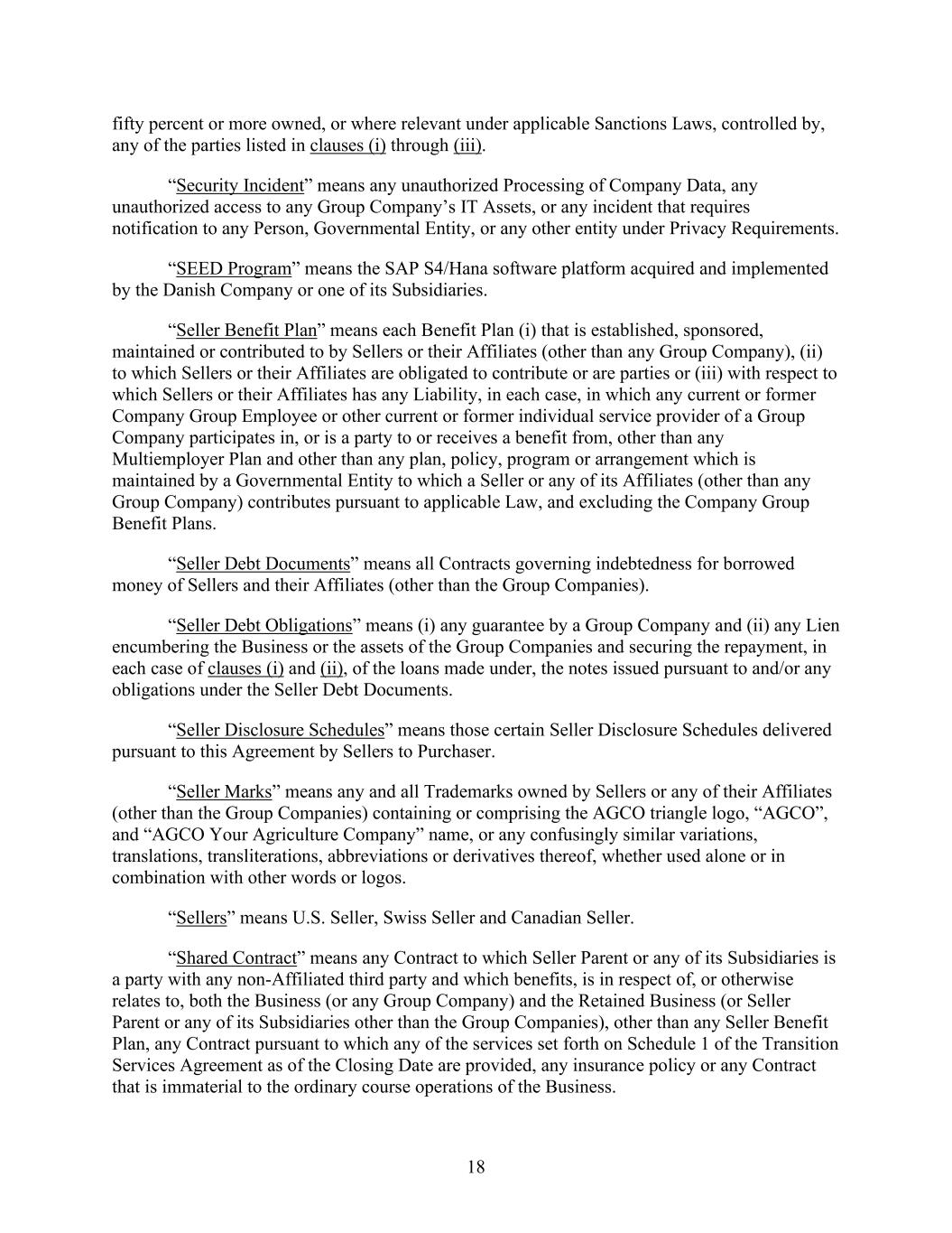 18 fifty percent or more owned, or where relevant under applicable Sanctions Laws, controlled by, any of the parties listed in clauses (i) through (iii). “Security Incident” means any unauthorized Processing of Company Data, any unauthorized access to any Group Company’s IT Assets, or any incident that requires notification to any Person, Governmental Entity, or any other entity under Privacy Requirements. “SEED Program” means the SAP S4/Hana software platform acquired and implemented by the Danish Company or one of its Subsidiaries. “Seller Benefit Plan” means each Benefit Plan (i) that is established, sponsored, maintained or contributed to by Sellers or their Affiliates (other than any Group Company), (ii) to which Sellers or their Affiliates are obligated to contribute or are parties or (iii) with respect to which Sellers or their Affiliates has any Liability, in each case, in which any current or former Company Group Employee or other current or former individual service provider of a Group Company participates in, or is a party to or receives a benefit from, other than any Multiemployer Plan and other than any plan, policy, program or arrangement which is maintained by a Governmental Entity to which a Seller or any of its Affiliates (other than any Group Company) contributes pursuant to applicable Law, and excluding the Company Group Benefit Plans. “Seller Debt Documents” means all Contracts governing indebtedness for borrowed money of Sellers and their Affiliates (other than the Group Companies). “Seller Debt Obligations” means (i) any guarantee by a Group Company and (ii) any Lien encumbering the Business or the assets of the Group Companies and securing the repayment, in each case of clauses (i) and (ii), of the loans made under, the notes issued pursuant to and/or any obligations under the Seller Debt Documents. “Seller Disclosure Schedules” means those certain Seller Disclosure Schedules delivered pursuant to this Agreement by Sellers to Purchaser. “Seller Marks” means any and all Trademarks owned by Sellers or any of their Affiliates (other than the Group Companies) containing or comprising the AGCO triangle logo, “AGCO”, and “AGCO Your Agriculture Company” name, or any confusingly similar variations, translations, transliterations, abbreviations or derivatives thereof, whether used alone or in combination with other words or logos. “Sellers” means U.S. Seller, Swiss Seller and Canadian Seller. “Shared Contract” means any Contract to which Seller Parent or any of its Subsidiaries is a party with any non-Affiliated third party and which benefits, is in respect of, or otherwise relates to, both the Business (or any Group Company) and the Retained Business (or Seller Parent or any of its Subsidiaries other than the Group Companies), other than any Seller Benefit Plan, any Contract pursuant to which any of the services set forth on Schedule 1 of the Transition Services Agreement as of the Closing Date are provided, any insurance policy or any Contract that is immaterial to the ordinary course operations of the Business.