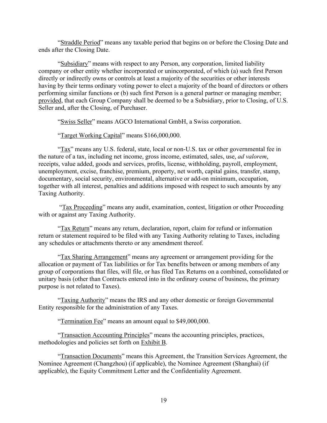 19 “Straddle Period” means any taxable period that begins on or before the Closing Date and ends after the Closing Date. “Subsidiary” means with respect to any Person, any corporation, limited liability company or other entity whether incorporated or unincorporated, of which (a) such first Person directly or indirectly owns or controls at least a majority of the securities or other interests having by their terms ordinary voting power to elect a majority of the board of directors or others performing similar functions or (b) such first Person is a general partner or managing member; provided, that each Group Company shall be deemed to be a Subsidiary, prior to Closing, of U.S. Seller and, after the Closing, of Purchaser. “Swiss Seller” means AGCO International GmbH, a Swiss corporation. “Target Working Capital” means $166,000,000. “Tax” means any U.S. federal, state, local or non-U.S. tax or other governmental fee in the nature of a tax, including net income, gross income, estimated, sales, use, ad valorem, receipts, value added, goods and services, profits, license, withholding, payroll, employment, unemployment, excise, franchise, premium, property, net worth, capital gains, transfer, stamp, documentary, social security, environmental, alternative or add-on minimum, occupation, together with all interest, penalties and additions imposed with respect to such amounts by any Taxing Authority. “Tax Proceeding” means any audit, examination, contest, litigation or other Proceeding with or against any Taxing Authority. “Tax Return” means any return, declaration, report, claim for refund or information return or statement required to be filed with any Taxing Authority relating to Taxes, including any schedules or attachments thereto or any amendment thereof. “Tax Sharing Arrangement” means any agreement or arrangement providing for the allocation or payment of Tax liabilities or for Tax benefits between or among members of any group of corporations that files, will file, or has filed Tax Returns on a combined, consolidated or unitary basis (other than Contracts entered into in the ordinary course of business, the primary purpose is not related to Taxes). “Taxing Authority” means the IRS and any other domestic or foreign Governmental Entity responsible for the administration of any Taxes. “Termination Fee” means an amount equal to $49,000,000. “Transaction Accounting Principles” means the accounting principles, practices, methodologies and policies set forth on Exhibit B. “Transaction Documents” means this Agreement, the Transition Services Agreement, the Nominee Agreement (Changzhou) (if applicable), the Nominee Agreement (Shanghai) (if applicable), the Equity Commitment Letter and the Confidentiality Agreement.