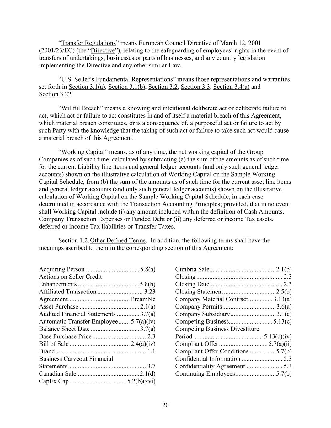 20 “Transfer Regulations” means European Council Directive of March 12, 2001 (2001/23/EC) (the “Directive”), relating to the safeguarding of employees’ rights in the event of transfers of undertakings, businesses or parts of businesses, and any country legislation implementing the Directive and any other similar Law. “U.S. Seller’s Fundamental Representations” means those representations and warranties set forth in Section 3.1(a), Section 3.1(b), Section 3.2, Section 3.3, Section 3.4(a) and Section 3.22. “Willful Breach” means a knowing and intentional deliberate act or deliberate failure to act, which act or failure to act constitutes in and of itself a material breach of this Agreement, which material breach constitutes, or is a consequence of, a purposeful act or failure to act by such Party with the knowledge that the taking of such act or failure to take such act would cause a material breach of this Agreement. “Working Capital” means, as of any time, the net working capital of the Group Companies as of such time, calculated by subtracting (a) the sum of the amounts as of such time for the current Liability line items and general ledger accounts (and only such general ledger accounts) shown on the illustrative calculation of Working Capital on the Sample Working Capital Schedule, from (b) the sum of the amounts as of such time for the current asset line items and general ledger accounts (and only such general ledger accounts) shown on the illustrative calculation of Working Capital on the Sample Working Capital Schedule, in each case determined in accordance with the Transaction Accounting Principles; provided, that in no event shall Working Capital include (i) any amount included within the definition of Cash Amounts, Company Transaction Expenses or Funded Debt or (ii) any deferred or income Tax assets, deferred or income Tax liabilities or Transfer Taxes. Section 1.2. Other Defined Terms. In addition, the following terms shall have the meanings ascribed to them in the corresponding section of this Agreement: Acquiring Person ................................. 5.8(a) Actions on Seller Credit Enhancements ...................................... 5.8(b) Affiliated Transaction ............................ 3.23 Agreement ...................................... Preamble Asset Purchase ..................................... 2.1(a) Audited Financial Statements .............. 3.7(a) Automatic Transfer Employee ....... 5.7(a)(iv) Balance Sheet Date .............................. 3.7(a) Base Purchase Price ................................. 2.3 Bill of Sale ..................................... 2.4(a)(iv) Brand ........................................................ 1.1 Business Carveout Financial Statements ................................................ 3.7 Canadian Sale....................................... 2.1(d) CapEx Cap ................................... 5.2(b)(xvi) Cimbria Sale......................................... 2.1(b) Closing ..................................................... 2.3 Closing Date............................................. 2.3 Closing Statement ................................ 2.5(b) Company Material Contract ............... 3.13(a) Company Permits ................................. 3.6(a) Company Subsidiary ............................ 3.1(c) Competing Business........................... 5.13(c) Competing Business Divestiture Period ........................................... 5.13(c)(iv) Compliant Offer .............................. 5.7(a)(ii) Compliant Offer Conditions ................ 5.7(b) Confidential Information ......................... 5.3 Confidentiality Agreement....................... 5.3 Continuing Employees ......................... 5.7(b)