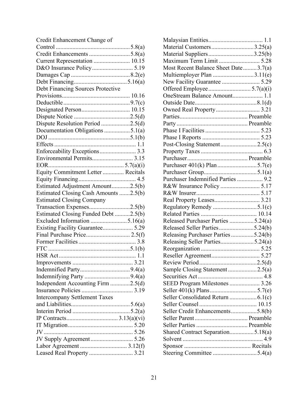 21 Credit Enhancement Change of Control ................................................. 5.8(a) Credit Enhancements ........................... 5.8(a) Current Representation ........................ 10.15 D&O Insurance Policy ........................... 5.19 Damages Cap ....................................... 8.2(e) Debt Financing ................................... 5.16(a) Debt Financing Sources Protective Provisions ............................................. 10.16 Deductible ............................................ 9.7(c) Designated Person ................................ 10.15 Dispute Notice ..................................... 2.5(d) Dispute Resolution Period ................... 2.5(d) Documentation Obligations ................. 5.1(a) DOJ ...................................................... 5.1(b) Effects ...................................................... 1.1 Enforceability Exceptions ........................ 3.3 Environmental Permits........................... 3.15 EOR.................................................. 5.7(a)(i) Equity Commitment Letter .............. Recitals Equity Financing ...................................... 4.5 Estimated Adjustment Amount ............ 2.5(b) Estimated Closing Cash Amounts ....... 2.5(b) Estimated Closing Company Transaction Expenses........................... 2.5(b) Estimated Closing Funded Debt .......... 2.5(b) Excluded Information ........................ 5.16(a) Existing Facility Guarantee.................... 5.29 Final Purchase Price ............................. 2.5(f) Former Facilities ...................................... 3.8 FTC ...................................................... 5.1(b) HSR Act ................................................... 1.1 Improvements ........................................ 3.21 Indemnified Party................................. 9.4(a) Indemnifying Party .............................. 9.4(a) Independent Accounting Firm ............. 2.5(d) Insurance Policies .................................. 3.19 Intercompany Settlement Taxes and Liabilities....................................... 5.6(a) Interim Period ...................................... 5.2(a) IP Contracts .................................. 3.13(a)(vi) IT Migration ........................................... 5.20 JV ........................................................... 5.26 JV Supply Agreement ............................ 5.26 Labor Agreement ............................... 3.12(f) Leased Real Property ............................. 3.21 Malaysian Entities .................................... 1.1 Material Customers ............................ 3.25(a) Material Suppliers .............................. 3.25(b) Maximum Term Limit ........................... 5.28 Most Recent Balance Sheet Date ......... 3.7(a) Multiemployer Plan ........................... 3.11(e) New Facility Guarantee ......................... 5.29 Offered Employee ............................ 5.7(a)(i) OneStream Balance Amount.................... 1.1 Outside Date......................................... 8.1(d) Owned Real Property ............................. 3.21 Parties ............................................. Preamble Party ............................................... Preamble Phase I Facilities .................................... 5.23 Phase I Reports ...................................... 5.23 Post-Closing Statement ........................ 2.5(c) Property Taxes ......................................... 6.3 Purchaser ........................................ Preamble Purchaser 401(k) Plan .......................... 5.7(e) Purchaser Group................................... 5.1(a) Purchaser Indemnified Parties ................. 9.2 R&W Insurance Policy .......................... 5.17 R&W Insurer .......................................... 5.17 Real Property Leases.............................. 3.21 Regulatory Remedy ............................. 5.1(c) Related Parties ..................................... 10.14 Released Purchaser Parties ................ 5.24(a) Released Seller Parties ....................... 5.24(b) Releasing Purchaser Parties ............... 5.24(b) Releasing Seller Parties...................... 5.24(a) Reorganization ....................................... 5.25 Reseller Agreement ................................ 5.27 Review Period ...................................... 2.5(d) Sample Closing Statement ................... 2.5(a) Securities Act ........................................... 4.8 SEED Program Milestones .................... 3.26 Seller 401(k) Plans ............................... 5.7(e) Seller Consolidated Return .................. 6.1(c) Seller Counsel ...................................... 10.15 Seller Credit Enhancements ................. 5.8(b) Seller Parent ................................... Preamble Seller Parties .................................. Preamble Shared Contract Separation................ 5.18(a) Solvent ..................................................... 4.9 Sponsor ............................................ Recitals Steering Committee ............................. 5.4(a)