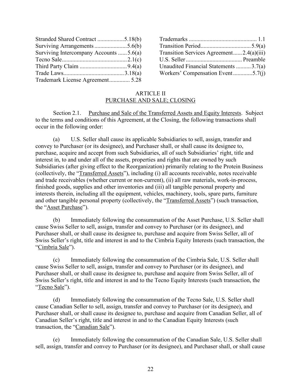 22 Stranded Shared Contract .................. 5.18(b) Surviving Arrangements ...................... 5.6(b) Surviving Intercompany Accounts ...... 5.6(a) Tecno Sale ............................................ 2.1(c) Third Party Claim ................................ 9.4(a) Trade Laws......................................... 3.18(a) Trademark License Agreement .............. 5.28 Trademarks .............................................. 1.1 Transition Period .................................. 5.9(a) Transition Services Agreement ...... 2.4(a)(iii) U.S. Seller ...................................... Preamble Unaudited Financial Statements .......... 3.7(a) Workers’ Compensation Event ............. 5.7(j) ARTICLE II PURCHASE AND SALE; CLOSING Section 2.1. Purchase and Sale of the Transferred Assets and Equity Interests. Subject to the terms and conditions of this Agreement, at the Closing, the following transactions shall occur in the following order: (a) U.S. Seller shall cause its applicable Subsidiaries to sell, assign, transfer and convey to Purchaser (or its designee), and Purchaser shall, or shall cause its designee to, purchase, acquire and accept from such Subsidiaries, all of such Subsidiaries’ right, title and interest in, to and under all of the assets, properties and rights that are owned by such Subsidiaries (after giving effect to the Reorganization) primarily relating to the Protein Business (collectively, the “Transferred Assets”), including (i) all accounts receivable, notes receivable and trade receivables (whether current or non-current), (ii) all raw materials, work-in-process, finished goods, supplies and other inventories and (iii) all tangible personal property and interests therein, including all the equipment, vehicles, machinery, tools, spare parts, furniture and other tangible personal property (collectively, the “Transferred Assets”) (such transaction, the “Asset Purchase”). (b) Immediately following the consummation of the Asset Purchase, U.S. Seller shall cause Swiss Seller to sell, assign, transfer and convey to Purchaser (or its designee), and Purchaser shall, or shall cause its designee to, purchase and acquire from Swiss Seller, all of Swiss Seller’s right, title and interest in and to the Cimbria Equity Interests (such transaction, the “Cimbria Sale”). (c) Immediately following the consummation of the Cimbria Sale, U.S. Seller shall cause Swiss Seller to sell, assign, transfer and convey to Purchaser (or its designee), and Purchaser shall, or shall cause its designee to, purchase and acquire from Swiss Seller, all of Swiss Seller’s right, title and interest in and to the Tecno Equity Interests (such transaction, the “Tecno Sale”). (d) Immediately following the consummation of the Tecno Sale, U.S. Seller shall cause Canadian Seller to sell, assign, transfer and convey to Purchaser (or its designee), and Purchaser shall, or shall cause its designee to, purchase and acquire from Canadian Seller, all of Canadian Seller’s right, title and interest in and to the Canadian Equity Interests (such transaction, the “Canadian Sale”). (e) Immediately following the consummation of the Canadian Sale, U.S. Seller shall sell, assign, transfer and convey to Purchaser (or its designee), and Purchaser shall, or shall cause