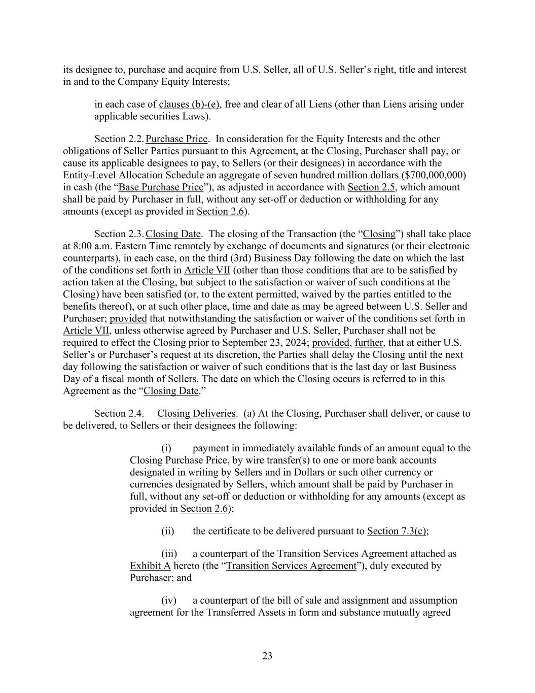 23 its designee to, purchase and acquire from U.S. Seller, all of U.S. Seller’s right, title and interest in and to the Company Equity Interests; in each case of clauses (b)-(e), free and clear of all Liens (other than Liens arising under applicable securities Laws). Section 2.2. Purchase Price. In consideration for the Equity Interests and the other obligations of Seller Parties pursuant to this Agreement, at the Closing, Purchaser shall pay, or cause its applicable designees to pay, to Sellers (or their designees) in accordance with the Entity-Level Allocation Schedule an aggregate of seven hundred million dollars ($700,000,000) in cash (the “Base Purchase Price”), as adjusted in accordance with Section 2.5, which amount shall be paid by Purchaser in full, without any set-off or deduction or withholding for any amounts (except as provided in Section 2.6). Section 2.3. Closing Date. The closing of the Transaction (the “Closing”) shall take place at 8:00 a.m. Eastern Time remotely by exchange of documents and signatures (or their electronic counterparts), in each case, on the third (3rd) Business Day following the date on which the last of the conditions set forth in Article VII (other than those conditions that are to be satisfied by action taken at the Closing, but subject to the satisfaction or waiver of such conditions at the Closing) have been satisfied (or, to the extent permitted, waived by the parties entitled to the benefits thereof), or at such other place, time and date as may be agreed between U.S. Seller and Purchaser; provided that notwithstanding the satisfaction or waiver of the conditions set forth in Article VII, unless otherwise agreed by Purchaser and U.S. Seller, Purchaser shall not be required to effect the Closing prior to September 23, 2024; provided, further, that at either U.S. Seller’s or Purchaser’s request at its discretion, the Parties shall delay the Closing until the next day following the satisfaction or waiver of such conditions that is the last day or last Business Day of a fiscal month of Sellers. The date on which the Closing occurs is referred to in this Agreement as the “Closing Date.” Section 2.4. Closing Deliveries. (a) At the Closing, Purchaser shall deliver, or cause to be delivered, to Sellers or their designees the following: (i) payment in immediately available funds of an amount equal to the Closing Purchase Price, by wire transfer(s) to one or more bank accounts designated in writing by Sellers and in Dollars or such other currency or currencies designated by Sellers, which amount shall be paid by Purchaser in full, without any set-off or deduction or withholding for any amounts (except as provided in Section 2.6); (ii) the certificate to be delivered pursuant to Section 7.3(c); (iii) a counterpart of the Transition Services Agreement attached as Exhibit A hereto (the “Transition Services Agreement”), duly executed by Purchaser; and (iv) a counterpart of the bill of sale and assignment and assumption agreement for the Transferred Assets in form and substance mutually agreed