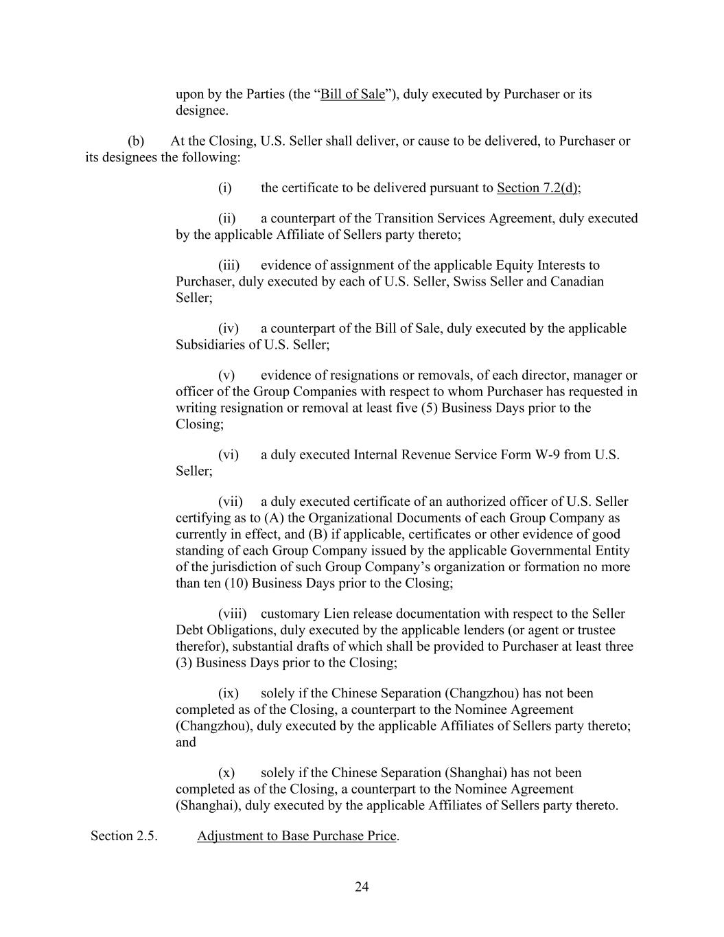 24 upon by the Parties (the “Bill of Sale”), duly executed by Purchaser or its designee. (b) At the Closing, U.S. Seller shall deliver, or cause to be delivered, to Purchaser or its designees the following: (i) the certificate to be delivered pursuant to Section 7.2(d); (ii) a counterpart of the Transition Services Agreement, duly executed by the applicable Affiliate of Sellers party thereto; (iii) evidence of assignment of the applicable Equity Interests to Purchaser, duly executed by each of U.S. Seller, Swiss Seller and Canadian Seller; (iv) a counterpart of the Bill of Sale, duly executed by the applicable Subsidiaries of U.S. Seller; (v) evidence of resignations or removals, of each director, manager or officer of the Group Companies with respect to whom Purchaser has requested in writing resignation or removal at least five (5) Business Days prior to the Closing; (vi) a duly executed Internal Revenue Service Form W-9 from U.S. Seller; (vii) a duly executed certificate of an authorized officer of U.S. Seller certifying as to (A) the Organizational Documents of each Group Company as currently in effect, and (B) if applicable, certificates or other evidence of good standing of each Group Company issued by the applicable Governmental Entity of the jurisdiction of such Group Company’s organization or formation no more than ten (10) Business Days prior to the Closing; (viii) customary Lien release documentation with respect to the Seller Debt Obligations, duly executed by the applicable lenders (or agent or trustee therefor), substantial drafts of which shall be provided to Purchaser at least three (3) Business Days prior to the Closing; (ix) solely if the Chinese Separation (Changzhou) has not been completed as of the Closing, a counterpart to the Nominee Agreement (Changzhou), duly executed by the applicable Affiliates of Sellers party thereto; and (x) solely if the Chinese Separation (Shanghai) has not been completed as of the Closing, a counterpart to the Nominee Agreement (Shanghai), duly executed by the applicable Affiliates of Sellers party thereto. Section 2.5. Adjustment to Base Purchase Price.