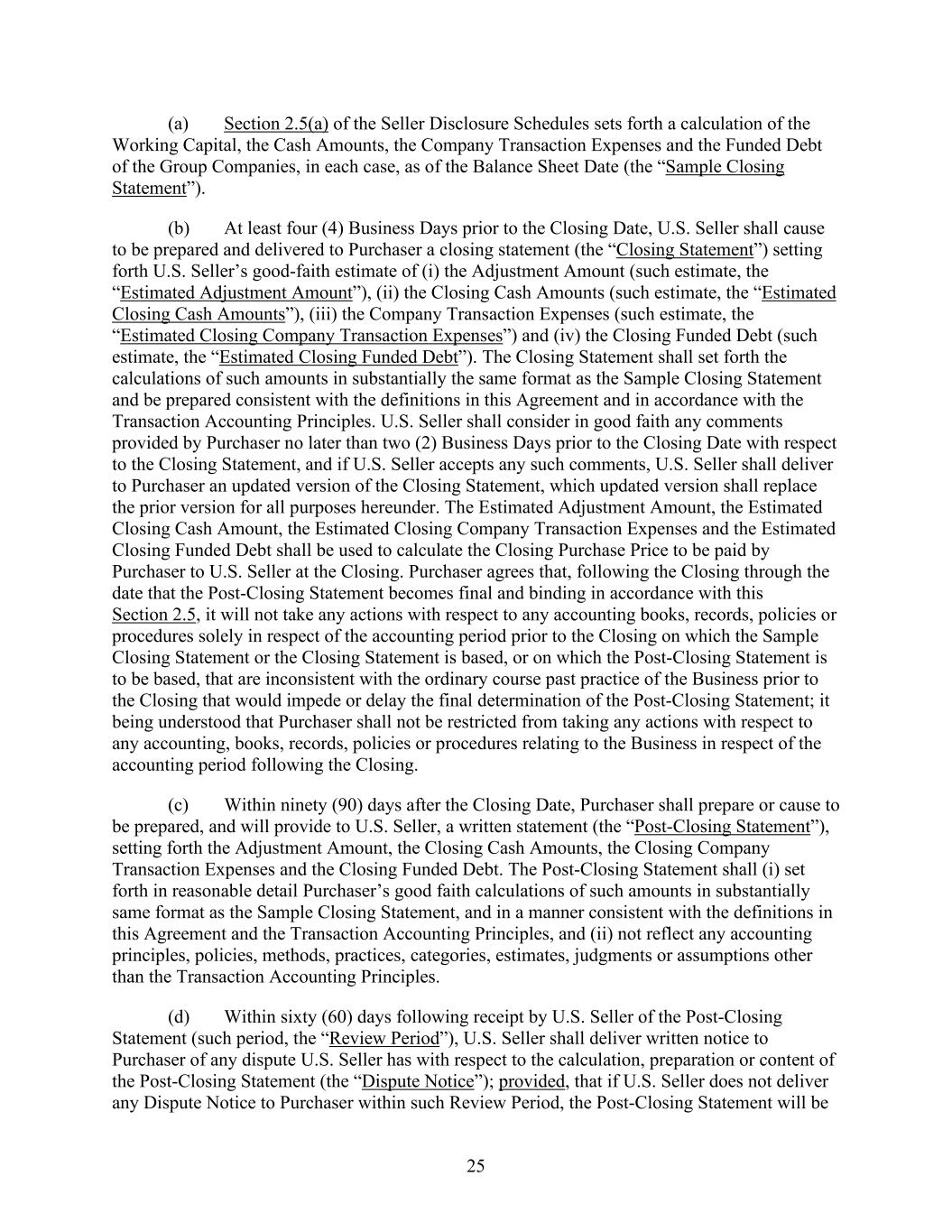 25 (a) Section 2.5(a) of the Seller Disclosure Schedules sets forth a calculation of the Working Capital, the Cash Amounts, the Company Transaction Expenses and the Funded Debt of the Group Companies, in each case, as of the Balance Sheet Date (the “Sample Closing Statement”). (b) At least four (4) Business Days prior to the Closing Date, U.S. Seller shall cause to be prepared and delivered to Purchaser a closing statement (the “Closing Statement”) setting forth U.S. Seller’s good-faith estimate of (i) the Adjustment Amount (such estimate, the “Estimated Adjustment Amount”), (ii) the Closing Cash Amounts (such estimate, the “Estimated Closing Cash Amounts”), (iii) the Company Transaction Expenses (such estimate, the “Estimated Closing Company Transaction Expenses”) and (iv) the Closing Funded Debt (such estimate, the “Estimated Closing Funded Debt”). The Closing Statement shall set forth the calculations of such amounts in substantially the same format as the Sample Closing Statement and be prepared consistent with the definitions in this Agreement and in accordance with the Transaction Accounting Principles. U.S. Seller shall consider in good faith any comments provided by Purchaser no later than two (2) Business Days prior to the Closing Date with respect to the Closing Statement, and if U.S. Seller accepts any such comments, U.S. Seller shall deliver to Purchaser an updated version of the Closing Statement, which updated version shall replace the prior version for all purposes hereunder. The Estimated Adjustment Amount, the Estimated Closing Cash Amount, the Estimated Closing Company Transaction Expenses and the Estimated Closing Funded Debt shall be used to calculate the Closing Purchase Price to be paid by Purchaser to U.S. Seller at the Closing. Purchaser agrees that, following the Closing through the date that the Post-Closing Statement becomes final and binding in accordance with this Section 2.5, it will not take any actions with respect to any accounting books, records, policies or procedures solely in respect of the accounting period prior to the Closing on which the Sample Closing Statement or the Closing Statement is based, or on which the Post-Closing Statement is to be based, that are inconsistent with the ordinary course past practice of the Business prior to the Closing that would impede or delay the final determination of the Post-Closing Statement; it being understood that Purchaser shall not be restricted from taking any actions with respect to any accounting, books, records, policies or procedures relating to the Business in respect of the accounting period following the Closing. (c) Within ninety (90) days after the Closing Date, Purchaser shall prepare or cause to be prepared, and will provide to U.S. Seller, a written statement (the “Post-Closing Statement”), setting forth the Adjustment Amount, the Closing Cash Amounts, the Closing Company Transaction Expenses and the Closing Funded Debt. The Post-Closing Statement shall (i) set forth in reasonable detail Purchaser’s good faith calculations of such amounts in substantially same format as the Sample Closing Statement, and in a manner consistent with the definitions in this Agreement and the Transaction Accounting Principles, and (ii) not reflect any accounting principles, policies, methods, practices, categories, estimates, judgments or assumptions other than the Transaction Accounting Principles. (d) Within sixty (60) days following receipt by U.S. Seller of the Post-Closing Statement (such period, the “Review Period”), U.S. Seller shall deliver written notice to Purchaser of any dispute U.S. Seller has with respect to the calculation, preparation or content of the Post-Closing Statement (the “Dispute Notice”); provided, that if U.S. Seller does not deliver any Dispute Notice to Purchaser within such Review Period, the Post-Closing Statement will be