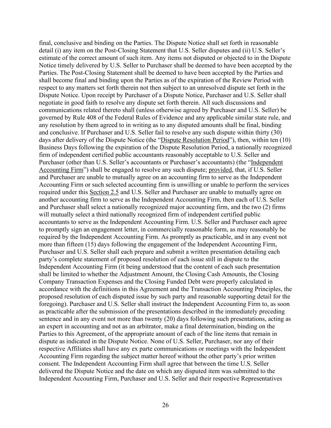 26 final, conclusive and binding on the Parties. The Dispute Notice shall set forth in reasonable detail (i) any item on the Post-Closing Statement that U.S. Seller disputes and (ii) U.S. Seller’s estimate of the correct amount of such item. Any items not disputed or objected to in the Dispute Notice timely delivered by U.S. Seller to Purchaser shall be deemed to have been accepted by the Parties. The Post-Closing Statement shall be deemed to have been accepted by the Parties and shall become final and binding upon the Parties as of the expiration of the Review Period with respect to any matters set forth therein not then subject to an unresolved dispute set forth in the Dispute Notice. Upon receipt by Purchaser of a Dispute Notice, Purchaser and U.S. Seller shall negotiate in good faith to resolve any dispute set forth therein. All such discussions and communications related thereto shall (unless otherwise agreed by Purchaser and U.S. Seller) be governed by Rule 408 of the Federal Rules of Evidence and any applicable similar state rule, and any resolution by them agreed to in writing as to any disputed amounts shall be final, binding and conclusive. If Purchaser and U.S. Seller fail to resolve any such dispute within thirty (30) days after delivery of the Dispute Notice (the “Dispute Resolution Period”), then, within ten (10) Business Days following the expiration of the Dispute Resolution Period, a nationally recognized firm of independent certified public accountants reasonably acceptable to U.S. Seller and Purchaser (other than U.S. Seller’s accountants or Purchaser’s accountants) (the “Independent Accounting Firm”) shall be engaged to resolve any such dispute; provided, that, if U.S. Seller and Purchaser are unable to mutually agree on an accounting firm to serve as the Independent Accounting Firm or such selected accounting firm is unwilling or unable to perform the services required under this Section 2.5 and U.S. Seller and Purchaser are unable to mutually agree on another accounting firm to serve as the Independent Accounting Firm, then each of U.S. Seller and Purchaser shall select a nationally recognized major accounting firm, and the two (2) firms will mutually select a third nationally recognized firm of independent certified public accountants to serve as the Independent Accounting Firm. U.S. Seller and Purchaser each agree to promptly sign an engagement letter, in commercially reasonable form, as may reasonably be required by the Independent Accounting Firm. As promptly as practicable, and in any event not more than fifteen (15) days following the engagement of the Independent Accounting Firm, Purchaser and U.S. Seller shall each prepare and submit a written presentation detailing each party’s complete statement of proposed resolution of each issue still in dispute to the Independent Accounting Firm (it being understood that the content of each such presentation shall be limited to whether the Adjustment Amount, the Closing Cash Amounts, the Closing Company Transaction Expenses and the Closing Funded Debt were properly calculated in accordance with the definitions in this Agreement and the Transaction Accounting Principles, the proposed resolution of each disputed issue by such party and reasonable supporting detail for the foregoing). Purchaser and U.S. Seller shall instruct the Independent Accounting Firm to, as soon as practicable after the submission of the presentations described in the immediately preceding sentence and in any event not more than twenty (20) days following such presentations, acting as an expert in accounting and not as an arbitrator, make a final determination, binding on the Parties to this Agreement, of the appropriate amount of each of the line items that remain in dispute as indicated in the Dispute Notice. None of U.S. Seller, Purchaser, nor any of their respective Affiliates shall have any ex parte communications or meetings with the Independent Accounting Firm regarding the subject matter hereof without the other party’s prior written consent. The Independent Accounting Firm shall agree that between the time U.S. Seller delivered the Dispute Notice and the date on which any disputed item was submitted to the Independent Accounting Firm, Purchaser and U.S. Seller and their respective Representatives