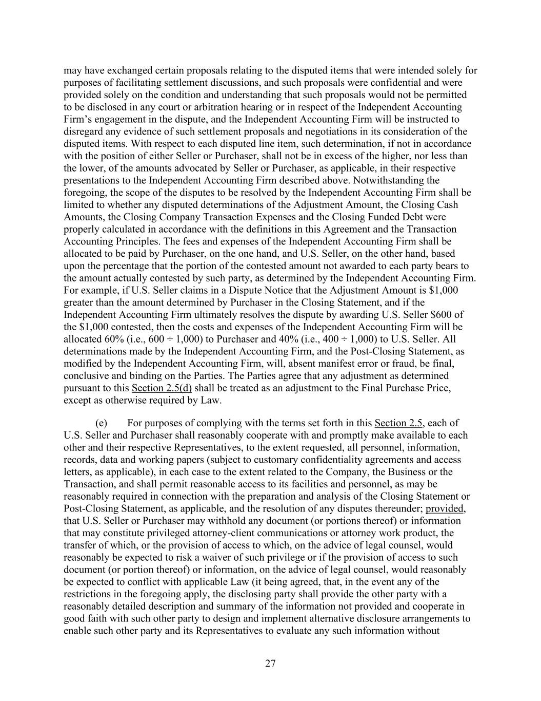 27 may have exchanged certain proposals relating to the disputed items that were intended solely for purposes of facilitating settlement discussions, and such proposals were confidential and were provided solely on the condition and understanding that such proposals would not be permitted to be disclosed in any court or arbitration hearing or in respect of the Independent Accounting Firm’s engagement in the dispute, and the Independent Accounting Firm will be instructed to disregard any evidence of such settlement proposals and negotiations in its consideration of the disputed items. With respect to each disputed line item, such determination, if not in accordance with the position of either Seller or Purchaser, shall not be in excess of the higher, nor less than the lower, of the amounts advocated by Seller or Purchaser, as applicable, in their respective presentations to the Independent Accounting Firm described above. Notwithstanding the foregoing, the scope of the disputes to be resolved by the Independent Accounting Firm shall be limited to whether any disputed determinations of the Adjustment Amount, the Closing Cash Amounts, the Closing Company Transaction Expenses and the Closing Funded Debt were properly calculated in accordance with the definitions in this Agreement and the Transaction Accounting Principles. The fees and expenses of the Independent Accounting Firm shall be allocated to be paid by Purchaser, on the one hand, and U.S. Seller, on the other hand, based upon the percentage that the portion of the contested amount not awarded to each party bears to the amount actually contested by such party, as determined by the Independent Accounting Firm. For example, if U.S. Seller claims in a Dispute Notice that the Adjustment Amount is $1,000 greater than the amount determined by Purchaser in the Closing Statement, and if the Independent Accounting Firm ultimately resolves the dispute by awarding U.S. Seller $600 of the $1,000 contested, then the costs and expenses of the Independent Accounting Firm will be allocated 60% (i.e., 600 ÷ 1,000) to Purchaser and 40% (i.e., 400 ÷ 1,000) to U.S. Seller. All determinations made by the Independent Accounting Firm, and the Post-Closing Statement, as modified by the Independent Accounting Firm, will, absent manifest error or fraud, be final, conclusive and binding on the Parties. The Parties agree that any adjustment as determined pursuant to this Section 2.5(d) shall be treated as an adjustment to the Final Purchase Price, except as otherwise required by Law. (e) For purposes of complying with the terms set forth in this Section 2.5, each of U.S. Seller and Purchaser shall reasonably cooperate with and promptly make available to each other and their respective Representatives, to the extent requested, all personnel, information, records, data and working papers (subject to customary confidentiality agreements and access letters, as applicable), in each case to the extent related to the Company, the Business or the Transaction, and shall permit reasonable access to its facilities and personnel, as may be reasonably required in connection with the preparation and analysis of the Closing Statement or Post-Closing Statement, as applicable, and the resolution of any disputes thereunder; provided, that U.S. Seller or Purchaser may withhold any document (or portions thereof) or information that may constitute privileged attorney-client communications or attorney work product, the transfer of which, or the provision of access to which, on the advice of legal counsel, would reasonably be expected to risk a waiver of such privilege or if the provision of access to such document (or portion thereof) or information, on the advice of legal counsel, would reasonably be expected to conflict with applicable Law (it being agreed, that, in the event any of the restrictions in the foregoing apply, the disclosing party shall provide the other party with a reasonably detailed description and summary of the information not provided and cooperate in good faith with such other party to design and implement alternative disclosure arrangements to enable such other party and its Representatives to evaluate any such information without