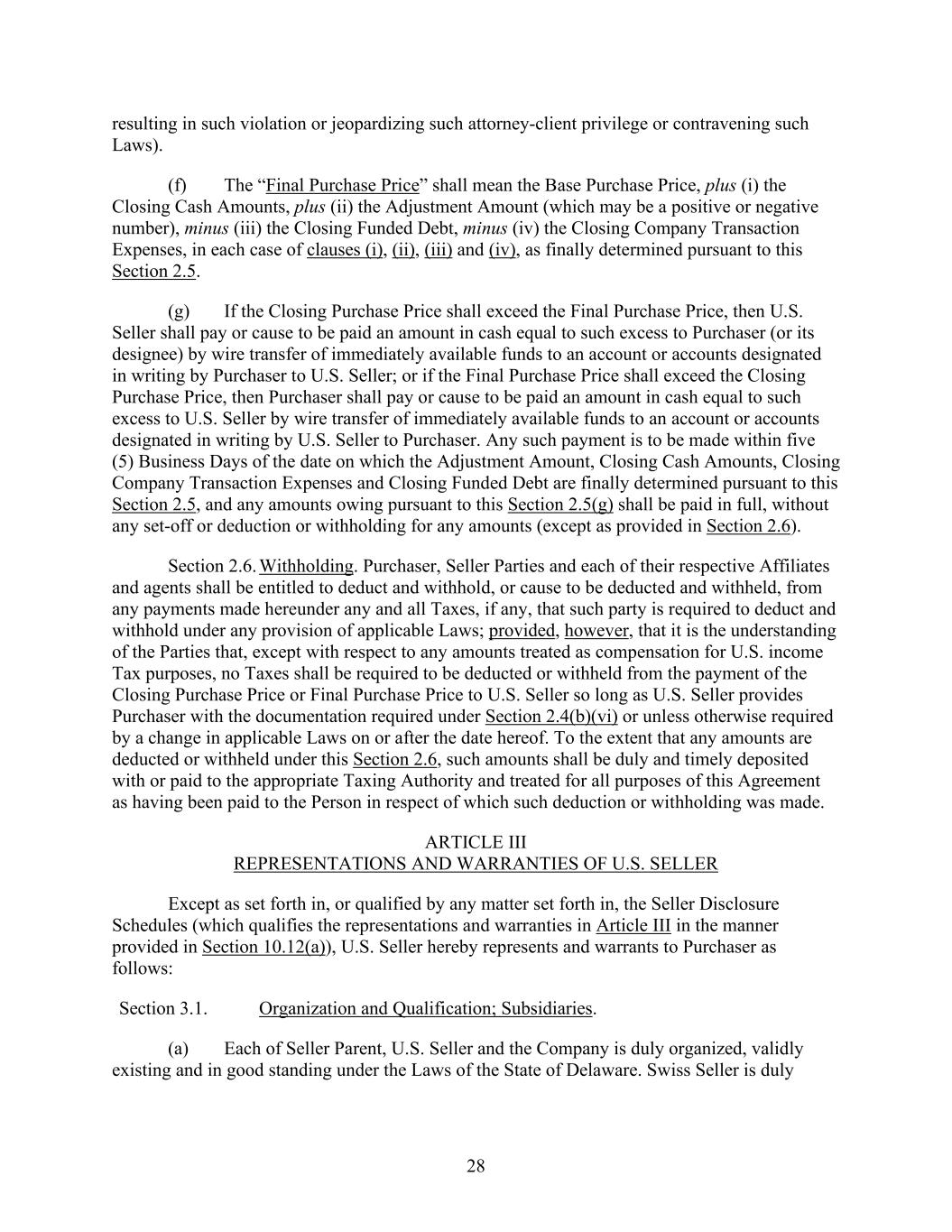 28 resulting in such violation or jeopardizing such attorney-client privilege or contravening such Laws). (f) The “Final Purchase Price” shall mean the Base Purchase Price, plus (i) the Closing Cash Amounts, plus (ii) the Adjustment Amount (which may be a positive or negative number), minus (iii) the Closing Funded Debt, minus (iv) the Closing Company Transaction Expenses, in each case of clauses (i), (ii), (iii) and (iv), as finally determined pursuant to this Section 2.5. (g) If the Closing Purchase Price shall exceed the Final Purchase Price, then U.S. Seller shall pay or cause to be paid an amount in cash equal to such excess to Purchaser (or its designee) by wire transfer of immediately available funds to an account or accounts designated in writing by Purchaser to U.S. Seller; or if the Final Purchase Price shall exceed the Closing Purchase Price, then Purchaser shall pay or cause to be paid an amount in cash equal to such excess to U.S. Seller by wire transfer of immediately available funds to an account or accounts designated in writing by U.S. Seller to Purchaser. Any such payment is to be made within five (5) Business Days of the date on which the Adjustment Amount, Closing Cash Amounts, Closing Company Transaction Expenses and Closing Funded Debt are finally determined pursuant to this Section 2.5, and any amounts owing pursuant to this Section 2.5(g) shall be paid in full, without any set-off or deduction or withholding for any amounts (except as provided in Section 2.6). Section 2.6. Withholding. Purchaser, Seller Parties and each of their respective Affiliates and agents shall be entitled to deduct and withhold, or cause to be deducted and withheld, from any payments made hereunder any and all Taxes, if any, that such party is required to deduct and withhold under any provision of applicable Laws; provided, however, that it is the understanding of the Parties that, except with respect to any amounts treated as compensation for U.S. income Tax purposes, no Taxes shall be required to be deducted or withheld from the payment of the Closing Purchase Price or Final Purchase Price to U.S. Seller so long as U.S. Seller provides Purchaser with the documentation required under Section 2.4(b)(vi) or unless otherwise required by a change in applicable Laws on or after the date hereof. To the extent that any amounts are deducted or withheld under this Section 2.6, such amounts shall be duly and timely deposited with or paid to the appropriate Taxing Authority and treated for all purposes of this Agreement as having been paid to the Person in respect of which such deduction or withholding was made. ARTICLE III REPRESENTATIONS AND WARRANTIES OF U.S. SELLER Except as set forth in, or qualified by any matter set forth in, the Seller Disclosure Schedules (which qualifies the representations and warranties in Article III in the manner provided in Section 10.12(a)), U.S. Seller hereby represents and warrants to Purchaser as follows: Section 3.1. Organization and Qualification; Subsidiaries. (a) Each of Seller Parent, U.S. Seller and the Company is duly organized, validly existing and in good standing under the Laws of the State of Delaware. Swiss Seller is duly