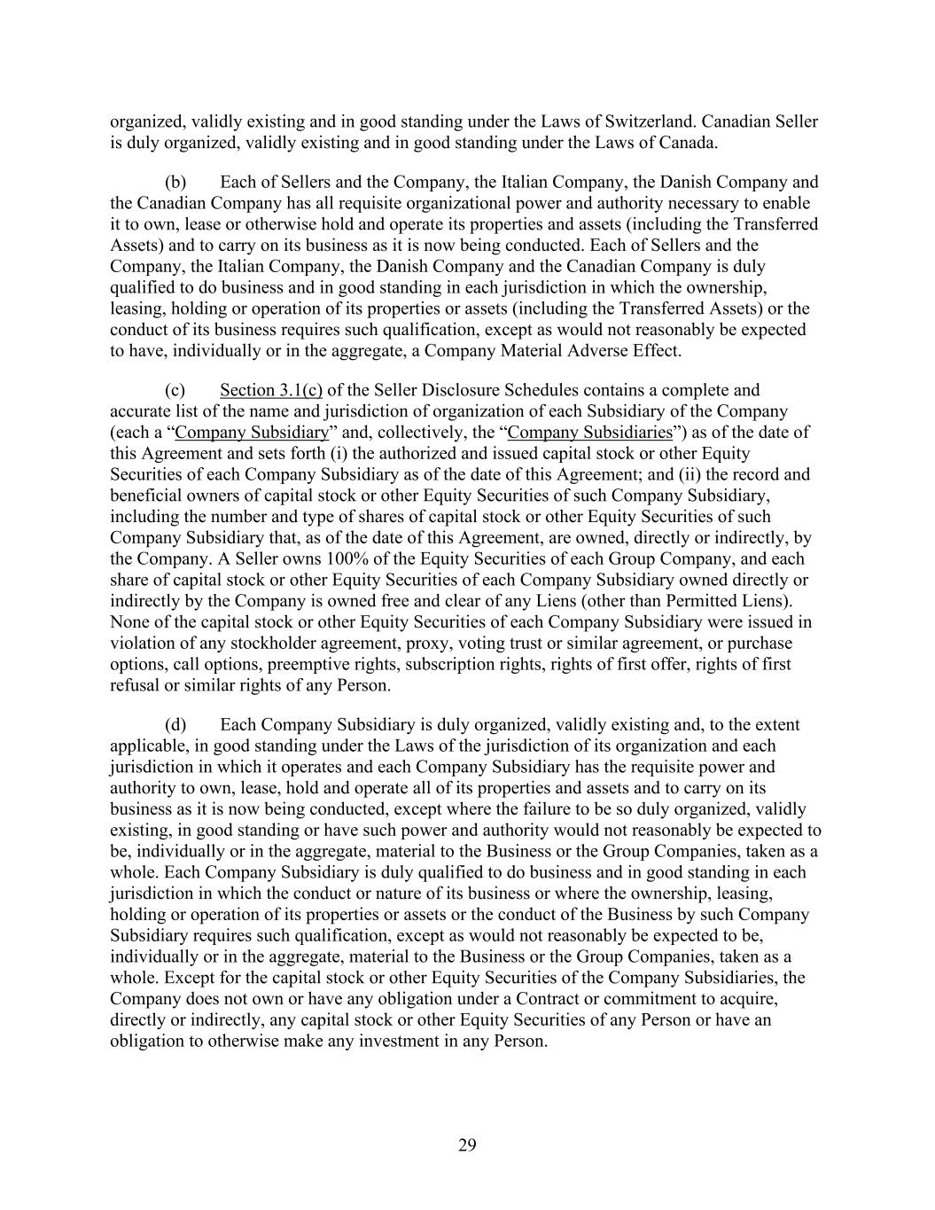 29 organized, validly existing and in good standing under the Laws of Switzerland. Canadian Seller is duly organized, validly existing and in good standing under the Laws of Canada. (b) Each of Sellers and the Company, the Italian Company, the Danish Company and the Canadian Company has all requisite organizational power and authority necessary to enable it to own, lease or otherwise hold and operate its properties and assets (including the Transferred Assets) and to carry on its business as it is now being conducted. Each of Sellers and the Company, the Italian Company, the Danish Company and the Canadian Company is duly qualified to do business and in good standing in each jurisdiction in which the ownership, leasing, holding or operation of its properties or assets (including the Transferred Assets) or the conduct of its business requires such qualification, except as would not reasonably be expected to have, individually or in the aggregate, a Company Material Adverse Effect. (c) Section 3.1(c) of the Seller Disclosure Schedules contains a complete and accurate list of the name and jurisdiction of organization of each Subsidiary of the Company (each a “Company Subsidiary” and, collectively, the “Company Subsidiaries”) as of the date of this Agreement and sets forth (i) the authorized and issued capital stock or other Equity Securities of each Company Subsidiary as of the date of this Agreement; and (ii) the record and beneficial owners of capital stock or other Equity Securities of such Company Subsidiary, including the number and type of shares of capital stock or other Equity Securities of such Company Subsidiary that, as of the date of this Agreement, are owned, directly or indirectly, by the Company. A Seller owns 100% of the Equity Securities of each Group Company, and each share of capital stock or other Equity Securities of each Company Subsidiary owned directly or indirectly by the Company is owned free and clear of any Liens (other than Permitted Liens). None of the capital stock or other Equity Securities of each Company Subsidiary were issued in violation of any stockholder agreement, proxy, voting trust or similar agreement, or purchase options, call options, preemptive rights, subscription rights, rights of first offer, rights of first refusal or similar rights of any Person. (d) Each Company Subsidiary is duly organized, validly existing and, to the extent applicable, in good standing under the Laws of the jurisdiction of its organization and each jurisdiction in which it operates and each Company Subsidiary has the requisite power and authority to own, lease, hold and operate all of its properties and assets and to carry on its business as it is now being conducted, except where the failure to be so duly organized, validly existing, in good standing or have such power and authority would not reasonably be expected to be, individually or in the aggregate, material to the Business or the Group Companies, taken as a whole. Each Company Subsidiary is duly qualified to do business and in good standing in each jurisdiction in which the conduct or nature of its business or where the ownership, leasing, holding or operation of its properties or assets or the conduct of the Business by such Company Subsidiary requires such qualification, except as would not reasonably be expected to be, individually or in the aggregate, material to the Business or the Group Companies, taken as a whole. Except for the capital stock or other Equity Securities of the Company Subsidiaries, the Company does not own or have any obligation under a Contract or commitment to acquire, directly or indirectly, any capital stock or other Equity Securities of any Person or have an obligation to otherwise make any investment in any Person.