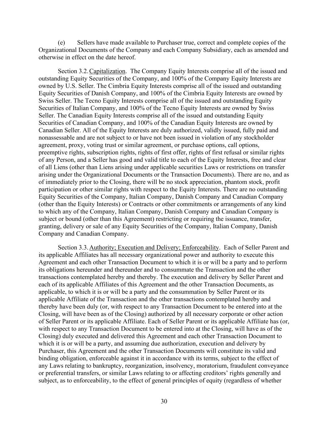 30 (e) Sellers have made available to Purchaser true, correct and complete copies of the Organizational Documents of the Company and each Company Subsidiary, each as amended and otherwise in effect on the date hereof. Section 3.2. Capitalization. The Company Equity Interests comprise all of the issued and outstanding Equity Securities of the Company, and 100% of the Company Equity Interests are owned by U.S. Seller. The Cimbria Equity Interests comprise all of the issued and outstanding Equity Securities of Danish Company, and 100% of the Cimbria Equity Interests are owned by Swiss Seller. The Tecno Equity Interests comprise all of the issued and outstanding Equity Securities of Italian Company, and 100% of the Tecno Equity Interests are owned by Swiss Seller. The Canadian Equity Interests comprise all of the issued and outstanding Equity Securities of Canadian Company, and 100% of the Canadian Equity Interests are owned by Canadian Seller. All of the Equity Interests are duly authorized, validly issued, fully paid and nonassessable and are not subject to or have not been issued in violation of any stockholder agreement, proxy, voting trust or similar agreement, or purchase options, call options, preemptive rights, subscription rights, rights of first offer, rights of first refusal or similar rights of any Person, and a Seller has good and valid title to each of the Equity Interests, free and clear of all Liens (other than Liens arising under applicable securities Laws or restrictions on transfer arising under the Organizational Documents or the Transaction Documents). There are no, and as of immediately prior to the Closing, there will be no stock appreciation, phantom stock, profit participation or other similar rights with respect to the Equity Interests. There are no outstanding Equity Securities of the Company, Italian Company, Danish Company and Canadian Company (other than the Equity Interests) or Contracts or other commitments or arrangements of any kind to which any of the Company, Italian Company, Danish Company and Canadian Company is subject or bound (other than this Agreement) restricting or requiring the issuance, transfer, granting, delivery or sale of any Equity Securities of the Company, Italian Company, Danish Company and Canadian Company. Section 3.3. Authority; Execution and Delivery; Enforceability. Each of Seller Parent and its applicable Affiliates has all necessary organizational power and authority to execute this Agreement and each other Transaction Document to which it is or will be a party and to perform its obligations hereunder and thereunder and to consummate the Transaction and the other transactions contemplated hereby and thereby. The execution and delivery by Seller Parent and each of its applicable Affiliates of this Agreement and the other Transaction Documents, as applicable, to which it is or will be a party and the consummation by Seller Parent or its applicable Affiliate of the Transaction and the other transactions contemplated hereby and thereby have been duly (or, with respect to any Transaction Document to be entered into at the Closing, will have been as of the Closing) authorized by all necessary corporate or other action of Seller Parent or its applicable Affiliate. Each of Seller Parent or its applicable Affiliate has (or, with respect to any Transaction Document to be entered into at the Closing, will have as of the Closing) duly executed and delivered this Agreement and each other Transaction Document to which it is or will be a party, and assuming due authorization, execution and delivery by Purchaser, this Agreement and the other Transaction Documents will constitute its valid and binding obligation, enforceable against it in accordance with its terms, subject to the effect of any Laws relating to bankruptcy, reorganization, insolvency, moratorium, fraudulent conveyance or preferential transfers, or similar Laws relating to or affecting creditors’ rights generally and subject, as to enforceability, to the effect of general principles of equity (regardless of whether