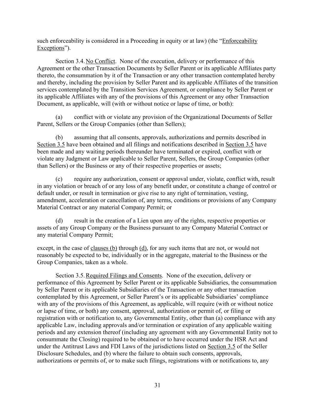 31 such enforceability is considered in a Proceeding in equity or at law) (the “Enforceability Exceptions”). Section 3.4. No Conflict. None of the execution, delivery or performance of this Agreement or the other Transaction Documents by Seller Parent or its applicable Affiliates party thereto, the consummation by it of the Transaction or any other transaction contemplated hereby and thereby, including the provision by Seller Parent and its applicable Affiliates of the transition services contemplated by the Transition Services Agreement, or compliance by Seller Parent or its applicable Affiliates with any of the provisions of this Agreement or any other Transaction Document, as applicable, will (with or without notice or lapse of time, or both): (a) conflict with or violate any provision of the Organizational Documents of Seller Parent, Sellers or the Group Companies (other than Sellers); (b) assuming that all consents, approvals, authorizations and permits described in Section 3.5 have been obtained and all filings and notifications described in Section 3.5 have been made and any waiting periods thereunder have terminated or expired, conflict with or violate any Judgment or Law applicable to Seller Parent, Sellers, the Group Companies (other than Sellers) or the Business or any of their respective properties or assets; (c) require any authorization, consent or approval under, violate, conflict with, result in any violation or breach of or any loss of any benefit under, or constitute a change of control or default under, or result in termination or give rise to any right of termination, vesting, amendment, acceleration or cancellation of, any terms, conditions or provisions of any Company Material Contract or any material Company Permit; or (d) result in the creation of a Lien upon any of the rights, respective properties or assets of any Group Company or the Business pursuant to any Company Material Contract or any material Company Permit; except, in the case of clauses (b) through (d), for any such items that are not, or would not reasonably be expected to be, individually or in the aggregate, material to the Business or the Group Companies, taken as a whole. Section 3.5. Required Filings and Consents. None of the execution, delivery or performance of this Agreement by Seller Parent or its applicable Subsidiaries, the consummation by Seller Parent or its applicable Subsidiaries of the Transaction or any other transaction contemplated by this Agreement, or Seller Parent’s or its applicable Subsidiaries’ compliance with any of the provisions of this Agreement, as applicable, will require (with or without notice or lapse of time, or both) any consent, approval, authorization or permit of, or filing or registration with or notification to, any Governmental Entity, other than (a) compliance with any applicable Law, including approvals and/or termination or expiration of any applicable waiting periods and any extension thereof (including any agreement with any Governmental Entity not to consummate the Closing) required to be obtained or to have occurred under the HSR Act and under the Antitrust Laws and FDI Laws of the jurisdictions listed on Section 3.5 of the Seller Disclosure Schedules, and (b) where the failure to obtain such consents, approvals, authorizations or permits of, or to make such filings, registrations with or notifications to, any
