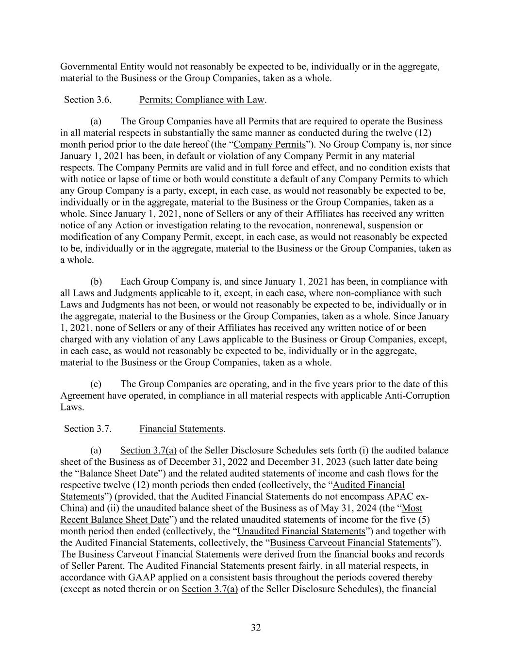 32 Governmental Entity would not reasonably be expected to be, individually or in the aggregate, material to the Business or the Group Companies, taken as a whole. Section 3.6. Permits; Compliance with Law. (a) The Group Companies have all Permits that are required to operate the Business in all material respects in substantially the same manner as conducted during the twelve (12) month period prior to the date hereof (the “Company Permits”). No Group Company is, nor since January 1, 2021 has been, in default or violation of any Company Permit in any material respects. The Company Permits are valid and in full force and effect, and no condition exists that with notice or lapse of time or both would constitute a default of any Company Permits to which any Group Company is a party, except, in each case, as would not reasonably be expected to be, individually or in the aggregate, material to the Business or the Group Companies, taken as a whole. Since January 1, 2021, none of Sellers or any of their Affiliates has received any written notice of any Action or investigation relating to the revocation, nonrenewal, suspension or modification of any Company Permit, except, in each case, as would not reasonably be expected to be, individually or in the aggregate, material to the Business or the Group Companies, taken as a whole. (b) Each Group Company is, and since January 1, 2021 has been, in compliance with all Laws and Judgments applicable to it, except, in each case, where non-compliance with such Laws and Judgments has not been, or would not reasonably be expected to be, individually or in the aggregate, material to the Business or the Group Companies, taken as a whole. Since January 1, 2021, none of Sellers or any of their Affiliates has received any written notice of or been charged with any violation of any Laws applicable to the Business or Group Companies, except, in each case, as would not reasonably be expected to be, individually or in the aggregate, material to the Business or the Group Companies, taken as a whole. (c) The Group Companies are operating, and in the five years prior to the date of this Agreement have operated, in compliance in all material respects with applicable Anti-Corruption Laws. Section 3.7. Financial Statements. (a) Section 3.7(a) of the Seller Disclosure Schedules sets forth (i) the audited balance sheet of the Business as of December 31, 2022 and December 31, 2023 (such latter date being the “Balance Sheet Date”) and the related audited statements of income and cash flows for the respective twelve (12) month periods then ended (collectively, the “Audited Financial Statements”) (provided, that the Audited Financial Statements do not encompass APAC ex- China) and (ii) the unaudited balance sheet of the Business as of May 31, 2024 (the “Most Recent Balance Sheet Date”) and the related unaudited statements of income for the five (5) month period then ended (collectively, the “Unaudited Financial Statements”) and together with the Audited Financial Statements, collectively, the “Business Carveout Financial Statements”). The Business Carveout Financial Statements were derived from the financial books and records of Seller Parent. The Audited Financial Statements present fairly, in all material respects, in accordance with GAAP applied on a consistent basis throughout the periods covered thereby (except as noted therein or on Section 3.7(a) of the Seller Disclosure Schedules), the financial