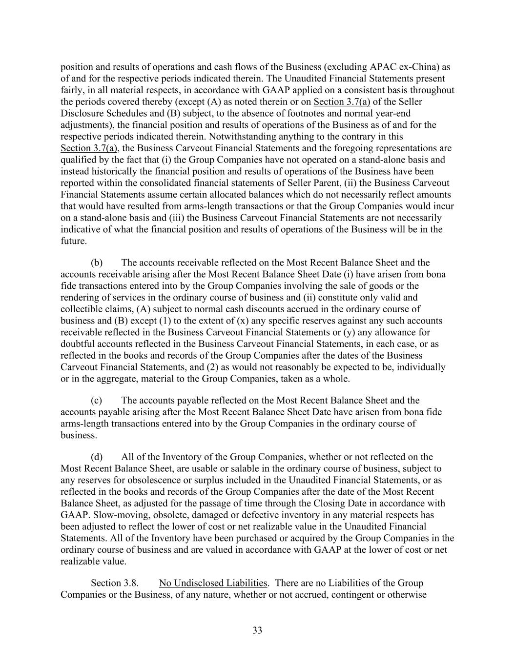 33 position and results of operations and cash flows of the Business (excluding APAC ex-China) as of and for the respective periods indicated therein. The Unaudited Financial Statements present fairly, in all material respects, in accordance with GAAP applied on a consistent basis throughout the periods covered thereby (except (A) as noted therein or on Section 3.7(a) of the Seller Disclosure Schedules and (B) subject, to the absence of footnotes and normal year-end adjustments), the financial position and results of operations of the Business as of and for the respective periods indicated therein. Notwithstanding anything to the contrary in this Section 3.7(a), the Business Carveout Financial Statements and the foregoing representations are qualified by the fact that (i) the Group Companies have not operated on a stand-alone basis and instead historically the financial position and results of operations of the Business have been reported within the consolidated financial statements of Seller Parent, (ii) the Business Carveout Financial Statements assume certain allocated balances which do not necessarily reflect amounts that would have resulted from arms-length transactions or that the Group Companies would incur on a stand-alone basis and (iii) the Business Carveout Financial Statements are not necessarily indicative of what the financial position and results of operations of the Business will be in the future. (b) The accounts receivable reflected on the Most Recent Balance Sheet and the accounts receivable arising after the Most Recent Balance Sheet Date (i) have arisen from bona fide transactions entered into by the Group Companies involving the sale of goods or the rendering of services in the ordinary course of business and (ii) constitute only valid and collectible claims, (A) subject to normal cash discounts accrued in the ordinary course of business and (B) except (1) to the extent of (x) any specific reserves against any such accounts receivable reflected in the Business Carveout Financial Statements or (y) any allowance for doubtful accounts reflected in the Business Carveout Financial Statements, in each case, or as reflected in the books and records of the Group Companies after the dates of the Business Carveout Financial Statements, and (2) as would not reasonably be expected to be, individually or in the aggregate, material to the Group Companies, taken as a whole. (c) The accounts payable reflected on the Most Recent Balance Sheet and the accounts payable arising after the Most Recent Balance Sheet Date have arisen from bona fide arms-length transactions entered into by the Group Companies in the ordinary course of business. (d) All of the Inventory of the Group Companies, whether or not reflected on the Most Recent Balance Sheet, are usable or salable in the ordinary course of business, subject to any reserves for obsolescence or surplus included in the Unaudited Financial Statements, or as reflected in the books and records of the Group Companies after the date of the Most Recent Balance Sheet, as adjusted for the passage of time through the Closing Date in accordance with GAAP. Slow-moving, obsolete, damaged or defective inventory in any material respects has been adjusted to reflect the lower of cost or net realizable value in the Unaudited Financial Statements. All of the Inventory have been purchased or acquired by the Group Companies in the ordinary course of business and are valued in accordance with GAAP at the lower of cost or net realizable value. Section 3.8. No Undisclosed Liabilities. There are no Liabilities of the Group Companies or the Business, of any nature, whether or not accrued, contingent or otherwise
