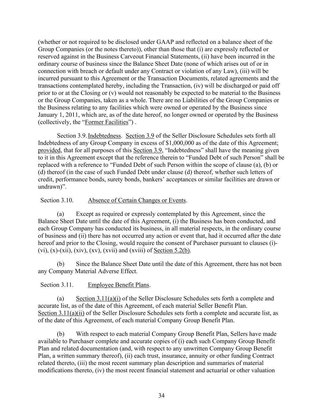 34 (whether or not required to be disclosed under GAAP and reflected on a balance sheet of the Group Companies (or the notes thereto)), other than those that (i) are expressly reflected or reserved against in the Business Carveout Financial Statements, (ii) have been incurred in the ordinary course of business since the Balance Sheet Date (none of which arises out of or in connection with breach or default under any Contract or violation of any Law), (iii) will be incurred pursuant to this Agreement or the Transaction Documents, related agreements and the transactions contemplated hereby, including the Transaction, (iv) will be discharged or paid off prior to or at the Closing or (v) would not reasonably be expected to be material to the Business or the Group Companies, taken as a whole. There are no Liabilities of the Group Companies or the Business relating to any facilities which were owned or operated by the Business since January 1, 2011, which are, as of the date hereof, no longer owned or operated by the Business (collectively, the “Former Facilities”) . Section 3.9. Indebtedness. Section 3.9 of the Seller Disclosure Schedules sets forth all Indebtedness of any Group Company in excess of $1,000,000 as of the date of this Agreement; provided, that for all purposes of this Section 3.9, “Indebtedness” shall have the meaning given to it in this Agreement except that the reference therein to “Funded Debt of such Person” shall be replaced with a reference to “Funded Debt of such Person within the scope of clause (a), (b) or (d) thereof (in the case of such Funded Debt under clause (d) thereof, whether such letters of credit, performance bonds, surety bonds, bankers’ acceptances or similar facilities are drawn or undrawn)”. Section 3.10. Absence of Certain Changes or Events. (a) Except as required or expressly contemplated by this Agreement, since the Balance Sheet Date until the date of this Agreement, (i) the Business has been conducted, and each Group Company has conducted its business, in all material respects, in the ordinary course of business and (ii) there has not occurred any action or event that, had it occurred after the date hereof and prior to the Closing, would require the consent of Purchaser pursuant to clauses (i)- (vi), (x)-(xii), (xiv), (xv), (xvii) and (xviii) of Section 5.2(b). (b) Since the Balance Sheet Date until the date of this Agreement, there has not been any Company Material Adverse Effect. Section 3.11. Employee Benefit Plans. (a) Section 3.11(a)(i) of the Seller Disclosure Schedules sets forth a complete and accurate list, as of the date of this Agreement, of each material Seller Benefit Plan. Section 3.11(a)(ii) of the Seller Disclosure Schedules sets forth a complete and accurate list, as of the date of this Agreement, of each material Company Group Benefit Plan. (b) With respect to each material Company Group Benefit Plan, Sellers have made available to Purchaser complete and accurate copies of (i) each such Company Group Benefit Plan and related documentation (and, with respect to any unwritten Company Group Benefit Plan, a written summary thereof), (ii) each trust, insurance, annuity or other funding Contract related thereto, (iii) the most recent summary plan description and summaries of material modifications thereto, (iv) the most recent financial statement and actuarial or other valuation