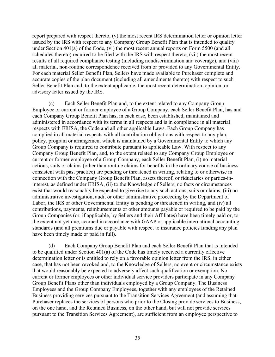 35 report prepared with respect thereto, (v) the most recent IRS determination letter or opinion letter issued by the IRS with respect to any Company Group Benefit Plan that is intended to qualify under Section 401(a) of the Code, (vi) the most recent annual reports on Form 5500 (and all schedules thereto) required to be filed with the IRS with respect thereto, (vii) the most recent results of all required compliance testing (including nondiscrimination and coverage), and (viii) all material, non-routine correspondence received from or provided to any Governmental Entity. For each material Seller Benefit Plan, Sellers have made available to Purchaser complete and accurate copies of the plan document (including all amendments thereto) with respect to such Seller Benefit Plan and, to the extent applicable, the most recent determination, opinion, or advisory letter issued by the IRS. (c) Each Seller Benefit Plan and, to the extent related to any Company Group Employee or current or former employee of a Group Company, each Seller Benefit Plan, has and each Company Group Benefit Plan has, in each case, been established, maintained and administered in accordance with its terms in all respects and is in compliance in all material respects with ERISA, the Code and all other applicable Laws. Each Group Company has complied in all material respects with all contribution obligations with respect to any plan, policy, program or arrangement which is maintained by a Governmental Entity to which any Group Company is required to contribute pursuant to applicable Law. With respect to any Company Group Benefit Plan, and, to the extent related to any Company Group Employee or current or former employee of a Group Company, each Seller Benefit Plan, (i) no material actions, suits or claims (other than routine claims for benefits in the ordinary course of business consistent with past practice) are pending or threatened in writing, relating to or otherwise in connection with the Company Group Benefit Plan, assets thereof, or fiduciaries or parties-in- interest, as defined under ERISA, (ii) to the Knowledge of Sellers, no facts or circumstances exist that would reasonably be expected to give rise to any such actions, suits or claims, (iii) no administrative investigation, audit or other administrative proceeding by the Department of Labor, the IRS or other Governmental Entity is pending or threatened in writing, and (iv) all contributions, payments, reimbursements or other amounts payable or required to be paid by the Group Companies (or, if applicable, by Sellers and their Affiliates) have been timely paid or, to the extent not yet due, accrued in accordance with GAAP or applicable international accounting standards (and all premiums due or payable with respect to insurance policies funding any plan have been timely made or paid in full). (d) Each Company Group Benefit Plan and each Seller Benefit Plan that is intended to be qualified under Section 401(a) of the Code has timely received a currently effective determination letter or is entitled to rely on a favorable opinion letter from the IRS, in either case, that has not been revoked and, to the Knowledge of Sellers, no event or circumstance exists that would reasonably be expected to adversely affect such qualification or exemption. No current or former employees or other individual service providers participate in any Company Group Benefit Plans other than individuals employed by a Group Company. The Business Employees and the Group Company Employees, together with any employees of the Retained Business providing services pursuant to the Transition Services Agreement (and assuming that Purchaser replaces the services of persons who prior to the Closing provide services to Business, on the one hand, and the Retained Business, on the other hand, but will not provide services pursuant to the Transition Services Agreement), are sufficient from an employee perspective to