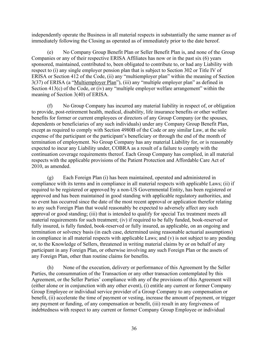 36 independently operate the Business in all material respects in substantially the same manner as of immediately following the Closing as operated as of immediately prior to the date hereof. (e) No Company Group Benefit Plan or Seller Benefit Plan is, and none of the Group Companies or any of their respective ERISA Affiliates has now or in the past six (6) years sponsored, maintained, contributed to, been obligated to contribute to, or had any Liability with respect to (i) any single employer pension plan that is subject to Section 302 or Title IV of ERISA or Section 412 of the Code, (ii) any “multiemployer plan” within the meaning of Section 3(37) of ERISA (a “Multiemployer Plan”), (iii) any “multiple employer plan” as defined in Section 413(c) of the Code, or (iv) any “multiple employer welfare arrangement” within the meaning of Section 3(40) of ERISA. (f) No Group Company has incurred any material liability in respect of, or obligation to provide, post-retirement health, medical, disability, life insurance benefits or other welfare benefits for former or current employees or directors of any Group Company (or the spouses, dependents or beneficiaries of any such individuals) under any Company Group Benefit Plan, except as required to comply with Section 4980B of the Code or any similar Law, at the sole expense of the participant or the participant’s beneficiary or through the end of the month of termination of employment. No Group Company has any material Liability for, or is reasonably expected to incur any Liability under, COBRA as a result of a failure to comply with the continuation coverage requirements thereof. Each Group Company has complied, in all material respects with the applicable provisions of the Patient Protection and Affordable Care Act of 2010, as amended. (g) Each Foreign Plan (i) has been maintained, operated and administered in compliance with its terms and in compliance in all material respects with applicable Laws; (ii) if required to be registered or approved by a non-US Governmental Entity, has been registered or approved and has been maintained in good standing with applicable regulatory authorities, and no event has occurred since the date of the most recent approval or application therefor relating to any such Foreign Plan that would reasonably be expected to adversely affect any such approval or good standing; (iii) that is intended to qualify for special Tax treatment meets all material requirements for such treatment; (iv) if required to be fully funded, book-reserved or fully insured, is fully funded, book-reserved or fully insured, as applicable, on an ongoing and termination or solvency basis (in each case, determined using reasonable actuarial assumptions) in compliance in all material respects with applicable Laws; and (v) is not subject to any pending or, to the Knowledge of Sellers, threatened in writing material claims by or on behalf of any participant in any Foreign Plan, or otherwise involving any such Foreign Plan or the assets of any Foreign Plan, other than routine claims for benefits. (h) None of the execution, delivery or performance of this Agreement by the Seller Parties, the consummation of the Transaction or any other transaction contemplated by this Agreement, or the Seller Parties’ compliance with any of the provisions of this Agreement will (either alone or in conjunction with any other event), (i) entitle any current or former Company Group Employee or individual service provider of a Group Company to any compensation or benefit, (ii) accelerate the time of payment or vesting, increase the amount of payment, or trigger any payment or funding, of any compensation or benefit, (iii) result in any forgiveness of indebtedness with respect to any current or former Company Group Employee or individual