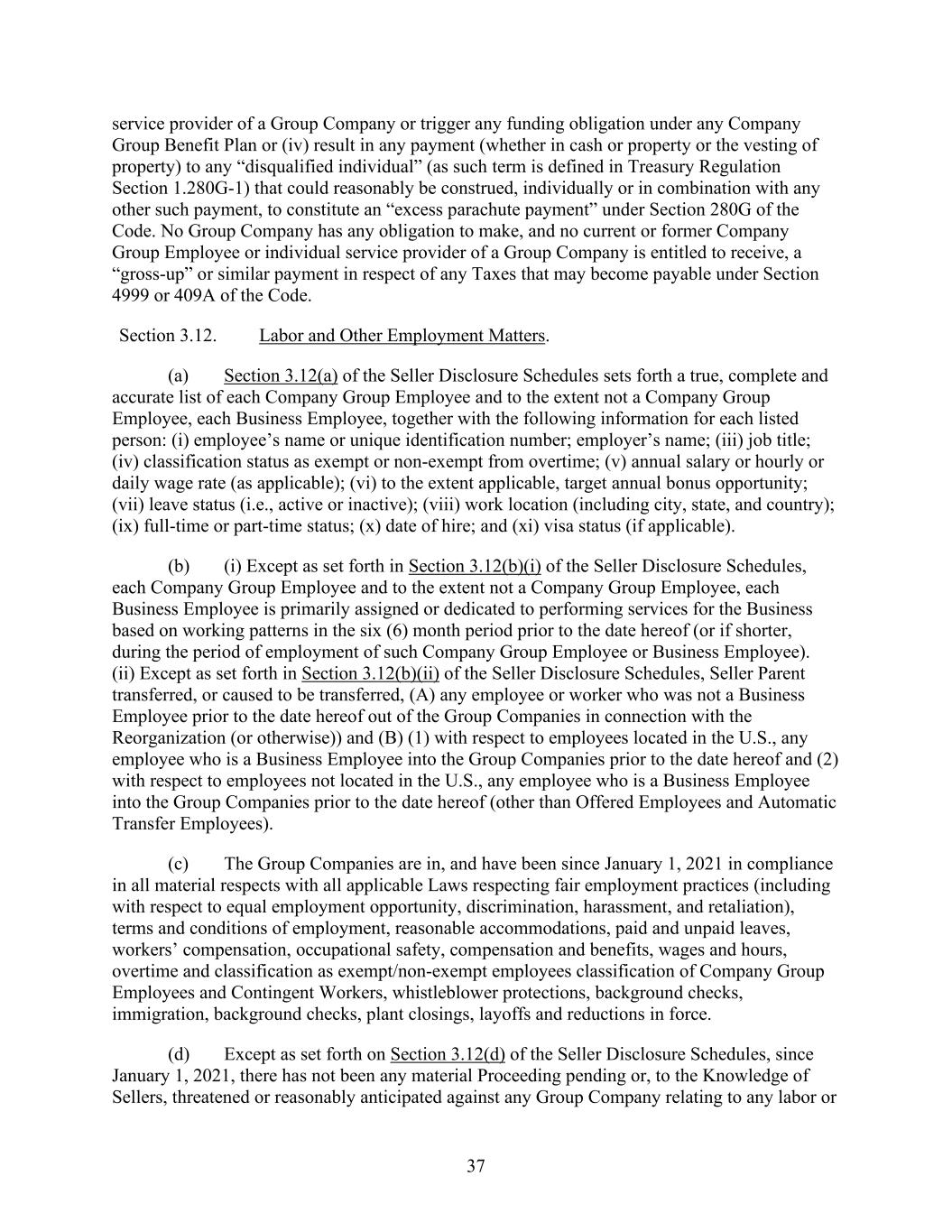 37 service provider of a Group Company or trigger any funding obligation under any Company Group Benefit Plan or (iv) result in any payment (whether in cash or property or the vesting of property) to any “disqualified individual” (as such term is defined in Treasury Regulation Section 1.280G-1) that could reasonably be construed, individually or in combination with any other such payment, to constitute an “excess parachute payment” under Section 280G of the Code. No Group Company has any obligation to make, and no current or former Company Group Employee or individual service provider of a Group Company is entitled to receive, a “gross-up” or similar payment in respect of any Taxes that may become payable under Section 4999 or 409A of the Code. Section 3.12. Labor and Other Employment Matters. (a) Section 3.12(a) of the Seller Disclosure Schedules sets forth a true, complete and accurate list of each Company Group Employee and to the extent not a Company Group Employee, each Business Employee, together with the following information for each listed person: (i) employee’s name or unique identification number; employer’s name; (iii) job title; (iv) classification status as exempt or non-exempt from overtime; (v) annual salary or hourly or daily wage rate (as applicable); (vi) to the extent applicable, target annual bonus opportunity; (vii) leave status (i.e., active or inactive); (viii) work location (including city, state, and country); (ix) full-time or part-time status; (x) date of hire; and (xi) visa status (if applicable). (b) (i) Except as set forth in Section 3.12(b)(i) of the Seller Disclosure Schedules, each Company Group Employee and to the extent not a Company Group Employee, each Business Employee is primarily assigned or dedicated to performing services for the Business based on working patterns in the six (6) month period prior to the date hereof (or if shorter, during the period of employment of such Company Group Employee or Business Employee). (ii) Except as set forth in Section 3.12(b)(ii) of the Seller Disclosure Schedules, Seller Parent transferred, or caused to be transferred, (A) any employee or worker who was not a Business Employee prior to the date hereof out of the Group Companies in connection with the Reorganization (or otherwise)) and (B) (1) with respect to employees located in the U.S., any employee who is a Business Employee into the Group Companies prior to the date hereof and (2) with respect to employees not located in the U.S., any employee who is a Business Employee into the Group Companies prior to the date hereof (other than Offered Employees and Automatic Transfer Employees). (c) The Group Companies are in, and have been since January 1, 2021 in compliance in all material respects with all applicable Laws respecting fair employment practices (including with respect to equal employment opportunity, discrimination, harassment, and retaliation), terms and conditions of employment, reasonable accommodations, paid and unpaid leaves, workers’ compensation, occupational safety, compensation and benefits, wages and hours, overtime and classification as exempt/non-exempt employees classification of Company Group Employees and Contingent Workers, whistleblower protections, background checks, immigration, background checks, plant closings, layoffs and reductions in force. (d) Except as set forth on Section 3.12(d) of the Seller Disclosure Schedules, since January 1, 2021, there has not been any material Proceeding pending or, to the Knowledge of Sellers, threatened or reasonably anticipated against any Group Company relating to any labor or
