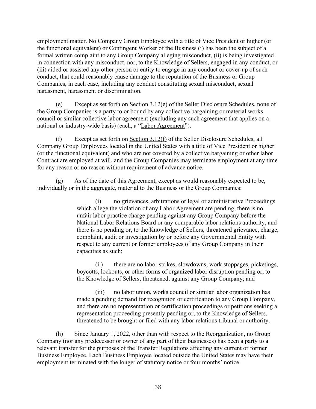 38 employment matter. No Company Group Employee with a title of Vice President or higher (or the functional equivalent) or Contingent Worker of the Business (i) has been the subject of a formal written complaint to any Group Company alleging misconduct, (ii) is being investigated in connection with any misconduct, nor, to the Knowledge of Sellers, engaged in any conduct, or (iii) aided or assisted any other person or entity to engage in any conduct or cover-up of such conduct, that could reasonably cause damage to the reputation of the Business or Group Companies, in each case, including any conduct constituting sexual misconduct, sexual harassment, harassment or discrimination. (e) Except as set forth on Section 3.12(e) of the Seller Disclosure Schedules, none of the Group Companies is a party to or bound by any collective bargaining or material works council or similar collective labor agreement (excluding any such agreement that applies on a national or industry-wide basis) (each, a “Labor Agreement”). (f) Except as set forth on Section 3.12(f) of the Seller Disclosure Schedules, all Company Group Employees located in the United States with a title of Vice President or higher (or the functional equivalent) and who are not covered by a collective bargaining or other labor Contract are employed at will, and the Group Companies may terminate employment at any time for any reason or no reason without requirement of advance notice. (g) As of the date of this Agreement, except as would reasonably expected to be, individually or in the aggregate, material to the Business or the Group Companies: (i) no grievances, arbitrations or legal or administrative Proceedings which allege the violation of any Labor Agreement are pending, there is no unfair labor practice charge pending against any Group Company before the National Labor Relations Board or any comparable labor relations authority, and there is no pending or, to the Knowledge of Sellers, threatened grievance, charge, complaint, audit or investigation by or before any Governmental Entity with respect to any current or former employees of any Group Company in their capacities as such; (ii) there are no labor strikes, slowdowns, work stoppages, picketings, boycotts, lockouts, or other forms of organized labor disruption pending or, to the Knowledge of Sellers, threatened, against any Group Company; and (iii) no labor union, works council or similar labor organization has made a pending demand for recognition or certification to any Group Company, and there are no representation or certification proceedings or petitions seeking a representation proceeding presently pending or, to the Knowledge of Sellers, threatened to be brought or filed with any labor relations tribunal or authority. (h) Since January 1, 2022, other than with respect to the Reorganization, no Group Company (nor any predecessor or owner of any part of their businesses) has been a party to a relevant transfer for the purposes of the Transfer Regulations affecting any current or former Business Employee. Each Business Employee located outside the United States may have their employment terminated with the longer of statutory notice or four months’ notice.