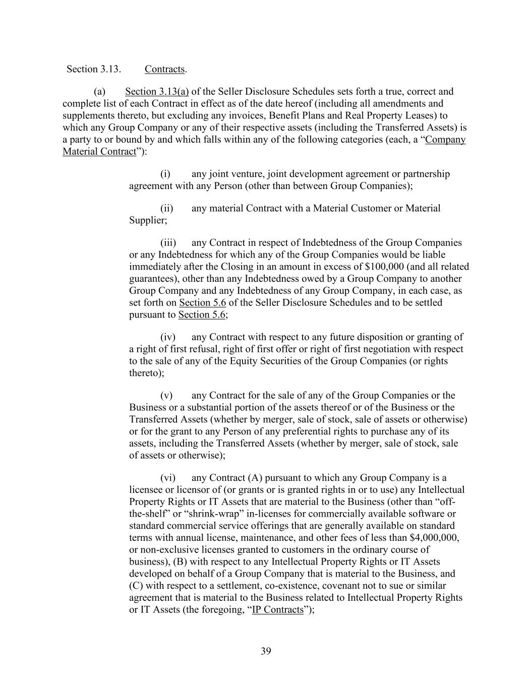 39 Section 3.13. Contracts. (a) Section 3.13(a) of the Seller Disclosure Schedules sets forth a true, correct and complete list of each Contract in effect as of the date hereof (including all amendments and supplements thereto, but excluding any invoices, Benefit Plans and Real Property Leases) to which any Group Company or any of their respective assets (including the Transferred Assets) is a party to or bound by and which falls within any of the following categories (each, a “Company Material Contract”): (i) any joint venture, joint development agreement or partnership agreement with any Person (other than between Group Companies); (ii) any material Contract with a Material Customer or Material Supplier; (iii) any Contract in respect of Indebtedness of the Group Companies or any Indebtedness for which any of the Group Companies would be liable immediately after the Closing in an amount in excess of $100,000 (and all related guarantees), other than any Indebtedness owed by a Group Company to another Group Company and any Indebtedness of any Group Company, in each case, as set forth on Section 5.6 of the Seller Disclosure Schedules and to be settled pursuant to Section 5.6; (iv) any Contract with respect to any future disposition or granting of a right of first refusal, right of first offer or right of first negotiation with respect to the sale of any of the Equity Securities of the Group Companies (or rights thereto); (v) any Contract for the sale of any of the Group Companies or the Business or a substantial portion of the assets thereof or of the Business or the Transferred Assets (whether by merger, sale of stock, sale of assets or otherwise) or for the grant to any Person of any preferential rights to purchase any of its assets, including the Transferred Assets (whether by merger, sale of stock, sale of assets or otherwise); (vi) any Contract (A) pursuant to which any Group Company is a licensee or licensor of (or grants or is granted rights in or to use) any Intellectual Property Rights or IT Assets that are material to the Business (other than “off- the-shelf” or “shrink-wrap” in-licenses for commercially available software or standard commercial service offerings that are generally available on standard terms with annual license, maintenance, and other fees of less than $4,000,000, or non-exclusive licenses granted to customers in the ordinary course of business), (B) with respect to any Intellectual Property Rights or IT Assets developed on behalf of a Group Company that is material to the Business, and (C) with respect to a settlement, co-existence, covenant not to sue or similar agreement that is material to the Business related to Intellectual Property Rights or IT Assets (the foregoing, “IP Contracts”);