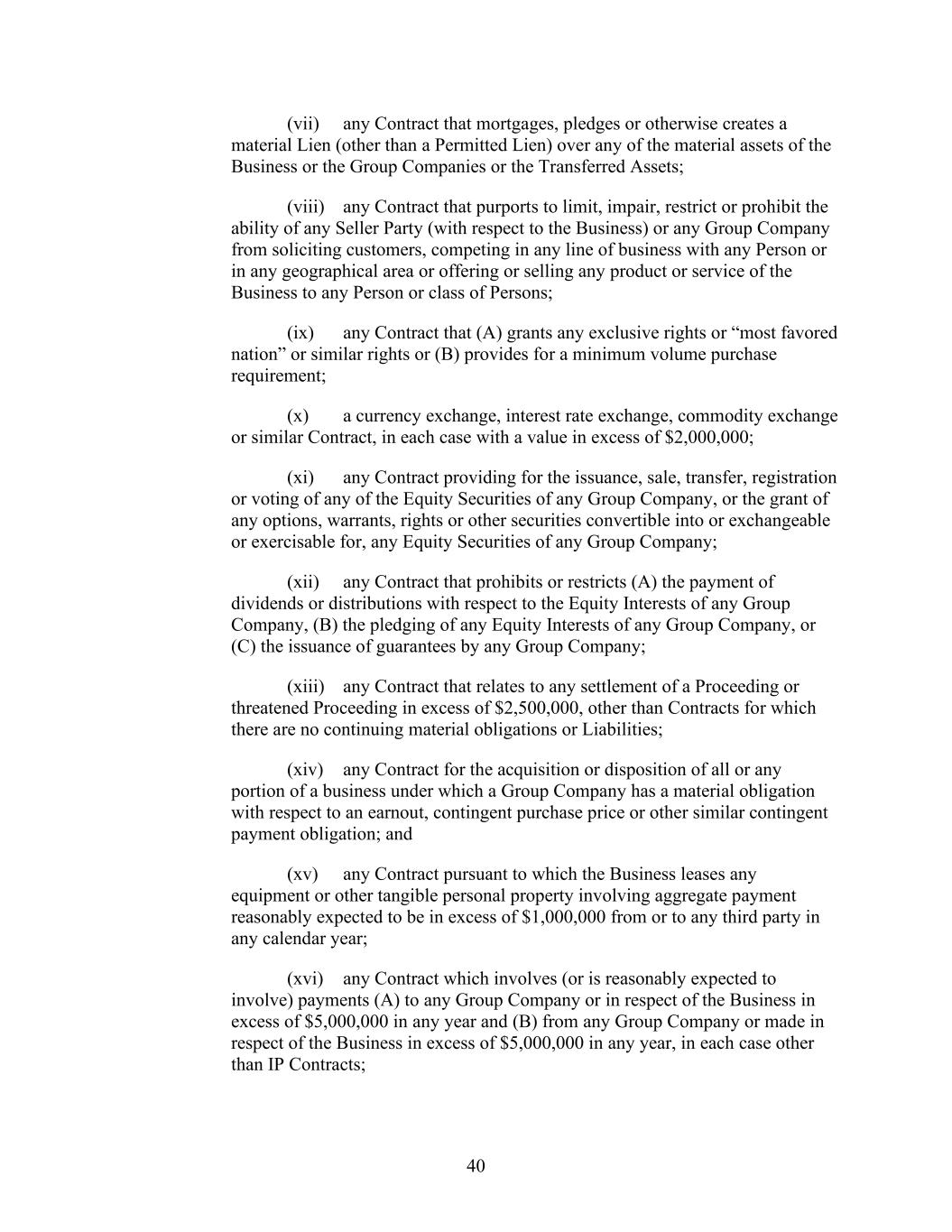 40 (vii) any Contract that mortgages, pledges or otherwise creates a material Lien (other than a Permitted Lien) over any of the material assets of the Business or the Group Companies or the Transferred Assets; (viii) any Contract that purports to limit, impair, restrict or prohibit the ability of any Seller Party (with respect to the Business) or any Group Company from soliciting customers, competing in any line of business with any Person or in any geographical area or offering or selling any product or service of the Business to any Person or class of Persons; (ix) any Contract that (A) grants any exclusive rights or “most favored nation” or similar rights or (B) provides for a minimum volume purchase requirement; (x) a currency exchange, interest rate exchange, commodity exchange or similar Contract, in each case with a value in excess of $2,000,000; (xi) any Contract providing for the issuance, sale, transfer, registration or voting of any of the Equity Securities of any Group Company, or the grant of any options, warrants, rights or other securities convertible into or exchangeable or exercisable for, any Equity Securities of any Group Company; (xii) any Contract that prohibits or restricts (A) the payment of dividends or distributions with respect to the Equity Interests of any Group Company, (B) the pledging of any Equity Interests of any Group Company, or (C) the issuance of guarantees by any Group Company; (xiii) any Contract that relates to any settlement of a Proceeding or threatened Proceeding in excess of $2,500,000, other than Contracts for which there are no continuing material obligations or Liabilities; (xiv) any Contract for the acquisition or disposition of all or any portion of a business under which a Group Company has a material obligation with respect to an earnout, contingent purchase price or other similar contingent payment obligation; and (xv) any Contract pursuant to which the Business leases any equipment or other tangible personal property involving aggregate payment reasonably expected to be in excess of $1,000,000 from or to any third party in any calendar year; (xvi) any Contract which involves (or is reasonably expected to involve) payments (A) to any Group Company or in respect of the Business in excess of $5,000,000 in any year and (B) from any Group Company or made in respect of the Business in excess of $5,000,000 in any year, in each case other than IP Contracts;