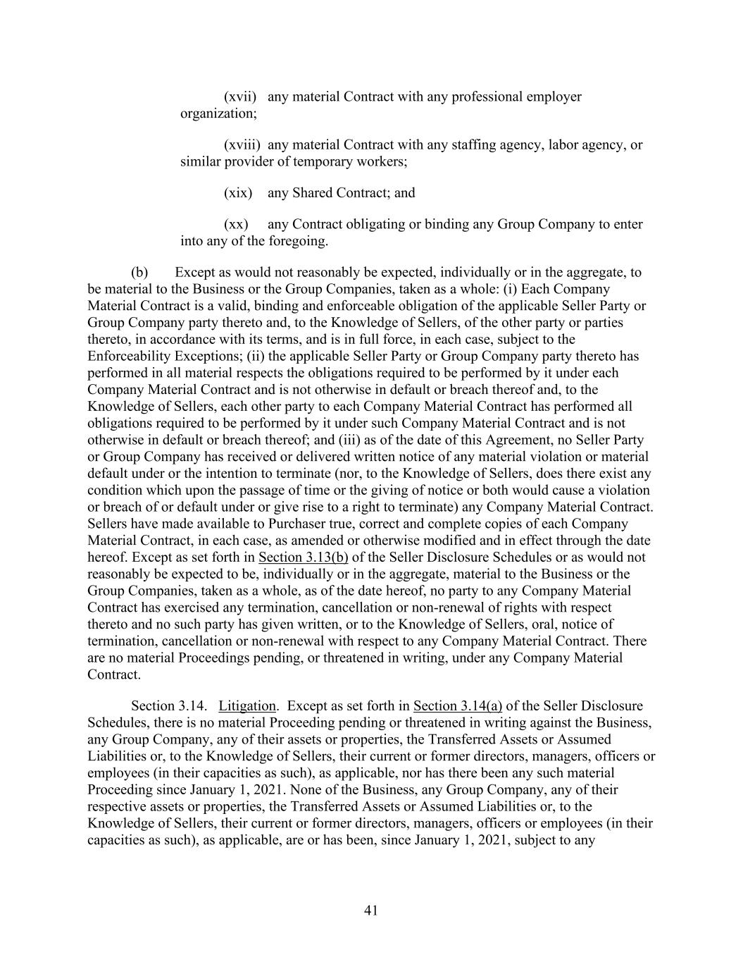 41 (xvii) any material Contract with any professional employer organization; (xviii) any material Contract with any staffing agency, labor agency, or similar provider of temporary workers; (xix) any Shared Contract; and (xx) any Contract obligating or binding any Group Company to enter into any of the foregoing. (b) Except as would not reasonably be expected, individually or in the aggregate, to be material to the Business or the Group Companies, taken as a whole: (i) Each Company Material Contract is a valid, binding and enforceable obligation of the applicable Seller Party or Group Company party thereto and, to the Knowledge of Sellers, of the other party or parties thereto, in accordance with its terms, and is in full force, in each case, subject to the Enforceability Exceptions; (ii) the applicable Seller Party or Group Company party thereto has performed in all material respects the obligations required to be performed by it under each Company Material Contract and is not otherwise in default or breach thereof and, to the Knowledge of Sellers, each other party to each Company Material Contract has performed all obligations required to be performed by it under such Company Material Contract and is not otherwise in default or breach thereof; and (iii) as of the date of this Agreement, no Seller Party or Group Company has received or delivered written notice of any material violation or material default under or the intention to terminate (nor, to the Knowledge of Sellers, does there exist any condition which upon the passage of time or the giving of notice or both would cause a violation or breach of or default under or give rise to a right to terminate) any Company Material Contract. Sellers have made available to Purchaser true, correct and complete copies of each Company Material Contract, in each case, as amended or otherwise modified and in effect through the date hereof. Except as set forth in Section 3.13(b) of the Seller Disclosure Schedules or as would not reasonably be expected to be, individually or in the aggregate, material to the Business or the Group Companies, taken as a whole, as of the date hereof, no party to any Company Material Contract has exercised any termination, cancellation or non-renewal of rights with respect thereto and no such party has given written, or to the Knowledge of Sellers, oral, notice of termination, cancellation or non-renewal with respect to any Company Material Contract. There are no material Proceedings pending, or threatened in writing, under any Company Material Contract. Section 3.14. Litigation. Except as set forth in Section 3.14(a) of the Seller Disclosure Schedules, there is no material Proceeding pending or threatened in writing against the Business, any Group Company, any of their assets or properties, the Transferred Assets or Assumed Liabilities or, to the Knowledge of Sellers, their current or former directors, managers, officers or employees (in their capacities as such), as applicable, nor has there been any such material Proceeding since January 1, 2021. None of the Business, any Group Company, any of their respective assets or properties, the Transferred Assets or Assumed Liabilities or, to the Knowledge of Sellers, their current or former directors, managers, officers or employees (in their capacities as such), as applicable, are or has been, since January 1, 2021, subject to any