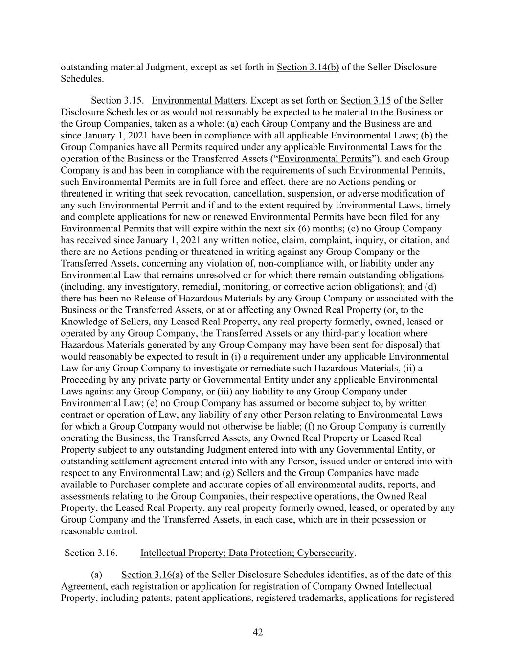 42 outstanding material Judgment, except as set forth in Section 3.14(b) of the Seller Disclosure Schedules. Section 3.15. Environmental Matters. Except as set forth on Section 3.15 of the Seller Disclosure Schedules or as would not reasonably be expected to be material to the Business or the Group Companies, taken as a whole: (a) each Group Company and the Business are and since January 1, 2021 have been in compliance with all applicable Environmental Laws; (b) the Group Companies have all Permits required under any applicable Environmental Laws for the operation of the Business or the Transferred Assets (“Environmental Permits”), and each Group Company is and has been in compliance with the requirements of such Environmental Permits, such Environmental Permits are in full force and effect, there are no Actions pending or threatened in writing that seek revocation, cancellation, suspension, or adverse modification of any such Environmental Permit and if and to the extent required by Environmental Laws, timely and complete applications for new or renewed Environmental Permits have been filed for any Environmental Permits that will expire within the next six (6) months; (c) no Group Company has received since January 1, 2021 any written notice, claim, complaint, inquiry, or citation, and there are no Actions pending or threatened in writing against any Group Company or the Transferred Assets, concerning any violation of, non-compliance with, or liability under any Environmental Law that remains unresolved or for which there remain outstanding obligations (including, any investigatory, remedial, monitoring, or corrective action obligations); and (d) there has been no Release of Hazardous Materials by any Group Company or associated with the Business or the Transferred Assets, or at or affecting any Owned Real Property (or, to the Knowledge of Sellers, any Leased Real Property, any real property formerly, owned, leased or operated by any Group Company, the Transferred Assets or any third-party location where Hazardous Materials generated by any Group Company may have been sent for disposal) that would reasonably be expected to result in (i) a requirement under any applicable Environmental Law for any Group Company to investigate or remediate such Hazardous Materials, (ii) a Proceeding by any private party or Governmental Entity under any applicable Environmental Laws against any Group Company, or (iii) any liability to any Group Company under Environmental Law; (e) no Group Company has assumed or become subject to, by written contract or operation of Law, any liability of any other Person relating to Environmental Laws for which a Group Company would not otherwise be liable; (f) no Group Company is currently operating the Business, the Transferred Assets, any Owned Real Property or Leased Real Property subject to any outstanding Judgment entered into with any Governmental Entity, or outstanding settlement agreement entered into with any Person, issued under or entered into with respect to any Environmental Law; and (g) Sellers and the Group Companies have made available to Purchaser complete and accurate copies of all environmental audits, reports, and assessments relating to the Group Companies, their respective operations, the Owned Real Property, the Leased Real Property, any real property formerly owned, leased, or operated by any Group Company and the Transferred Assets, in each case, which are in their possession or reasonable control. Section 3.16. Intellectual Property; Data Protection; Cybersecurity. (a) Section 3.16(a) of the Seller Disclosure Schedules identifies, as of the date of this Agreement, each registration or application for registration of Company Owned Intellectual Property, including patents, patent applications, registered trademarks, applications for registered