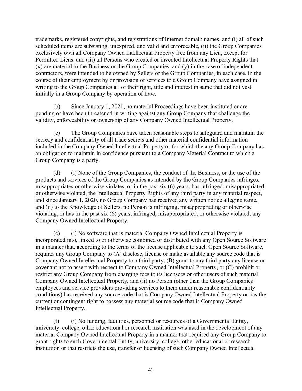 43 trademarks, registered copyrights, and registrations of Internet domain names, and (i) all of such scheduled items are subsisting, unexpired, and valid and enforceable, (ii) the Group Companies exclusively own all Company Owned Intellectual Property free from any Lien, except for Permitted Liens, and (iii) all Persons who created or invented Intellectual Property Rights that (x) are material to the Business or the Group Companies, and (y) in the case of independent contractors, were intended to be owned by Sellers or the Group Companies, in each case, in the course of their employment by or provision of services to a Group Company have assigned in writing to the Group Companies all of their right, title and interest in same that did not vest initially in a Group Company by operation of Law. (b) Since January 1, 2021, no material Proceedings have been instituted or are pending or have been threatened in writing against any Group Company that challenge the validity, enforceability or ownership of any Company Owned Intellectual Property. (c) The Group Companies have taken reasonable steps to safeguard and maintain the secrecy and confidentiality of all trade secrets and other material confidential information included in the Company Owned Intellectual Property or for which the any Group Company has an obligation to maintain in confidence pursuant to a Company Material Contract to which a Group Company is a party. (d) (i) None of the Group Companies, the conduct of the Business, or the use of the products and services of the Group Companies as intended by the Group Companies infringes, misappropriates or otherwise violates, or in the past six (6) years, has infringed, misappropriated, or otherwise violated, the Intellectual Property Rights of any third party in any material respect, and since January 1, 2020, no Group Company has received any written notice alleging same, and (ii) to the Knowledge of Sellers, no Person is infringing, misappropriating or otherwise violating, or has in the past six (6) years, infringed, misappropriated, or otherwise violated, any Company Owned Intellectual Property. (e) (i) No software that is material Company Owned Intellectual Property is incorporated into, linked to or otherwise combined or distributed with any Open Source Software in a manner that, according to the terms of the license applicable to such Open Source Software, requires any Group Company to (A) disclose, license or make available any source code that is Company Owned Intellectual Property to a third party, (B) grant to any third party any license or covenant not to assert with respect to Company Owned Intellectual Property, or (C) prohibit or restrict any Group Company from charging fees to its licensees or other users of such material Company Owned Intellectual Property, and (ii) no Person (other than the Group Companies’ employees and service providers providing services to them under reasonable confidentiality conditions) has received any source code that is Company Owned Intellectual Property or has the current or contingent right to possess any material source code that is Company Owned Intellectual Property. (f) (i) No funding, facilities, personnel or resources of a Governmental Entity, university, college, other educational or research institution was used in the development of any material Company Owned Intellectual Property in a manner that required any Group Company to grant rights to such Governmental Entity, university, college, other educational or research institution or that restricts the use, transfer or licensing of such Company Owned Intellectual
