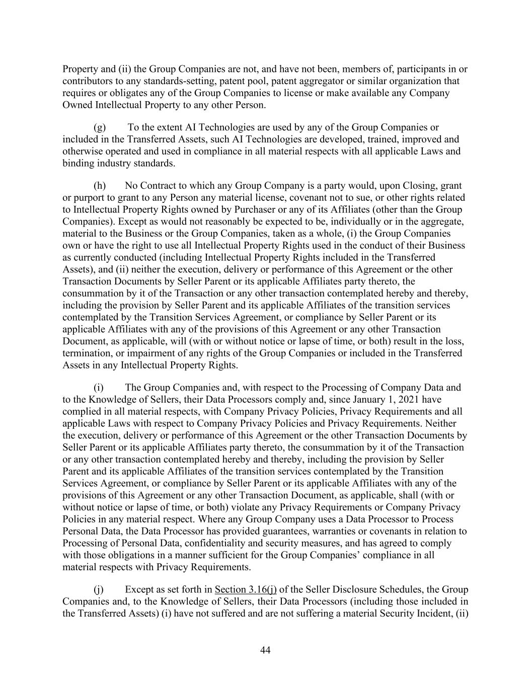 44 Property and (ii) the Group Companies are not, and have not been, members of, participants in or contributors to any standards-setting, patent pool, patent aggregator or similar organization that requires or obligates any of the Group Companies to license or make available any Company Owned Intellectual Property to any other Person. (g) To the extent AI Technologies are used by any of the Group Companies or included in the Transferred Assets, such AI Technologies are developed, trained, improved and otherwise operated and used in compliance in all material respects with all applicable Laws and binding industry standards. (h) No Contract to which any Group Company is a party would, upon Closing, grant or purport to grant to any Person any material license, covenant not to sue, or other rights related to Intellectual Property Rights owned by Purchaser or any of its Affiliates (other than the Group Companies). Except as would not reasonably be expected to be, individually or in the aggregate, material to the Business or the Group Companies, taken as a whole, (i) the Group Companies own or have the right to use all Intellectual Property Rights used in the conduct of their Business as currently conducted (including Intellectual Property Rights included in the Transferred Assets), and (ii) neither the execution, delivery or performance of this Agreement or the other Transaction Documents by Seller Parent or its applicable Affiliates party thereto, the consummation by it of the Transaction or any other transaction contemplated hereby and thereby, including the provision by Seller Parent and its applicable Affiliates of the transition services contemplated by the Transition Services Agreement, or compliance by Seller Parent or its applicable Affiliates with any of the provisions of this Agreement or any other Transaction Document, as applicable, will (with or without notice or lapse of time, or both) result in the loss, termination, or impairment of any rights of the Group Companies or included in the Transferred Assets in any Intellectual Property Rights. (i) The Group Companies and, with respect to the Processing of Company Data and to the Knowledge of Sellers, their Data Processors comply and, since January 1, 2021 have complied in all material respects, with Company Privacy Policies, Privacy Requirements and all applicable Laws with respect to Company Privacy Policies and Privacy Requirements. Neither the execution, delivery or performance of this Agreement or the other Transaction Documents by Seller Parent or its applicable Affiliates party thereto, the consummation by it of the Transaction or any other transaction contemplated hereby and thereby, including the provision by Seller Parent and its applicable Affiliates of the transition services contemplated by the Transition Services Agreement, or compliance by Seller Parent or its applicable Affiliates with any of the provisions of this Agreement or any other Transaction Document, as applicable, shall (with or without notice or lapse of time, or both) violate any Privacy Requirements or Company Privacy Policies in any material respect. Where any Group Company uses a Data Processor to Process Personal Data, the Data Processor has provided guarantees, warranties or covenants in relation to Processing of Personal Data, confidentiality and security measures, and has agreed to comply with those obligations in a manner sufficient for the Group Companies’ compliance in all material respects with Privacy Requirements. (j) Except as set forth in Section 3.16(j) of the Seller Disclosure Schedules, the Group Companies and, to the Knowledge of Sellers, their Data Processors (including those included in the Transferred Assets) (i) have not suffered and are not suffering a material Security Incident, (ii)