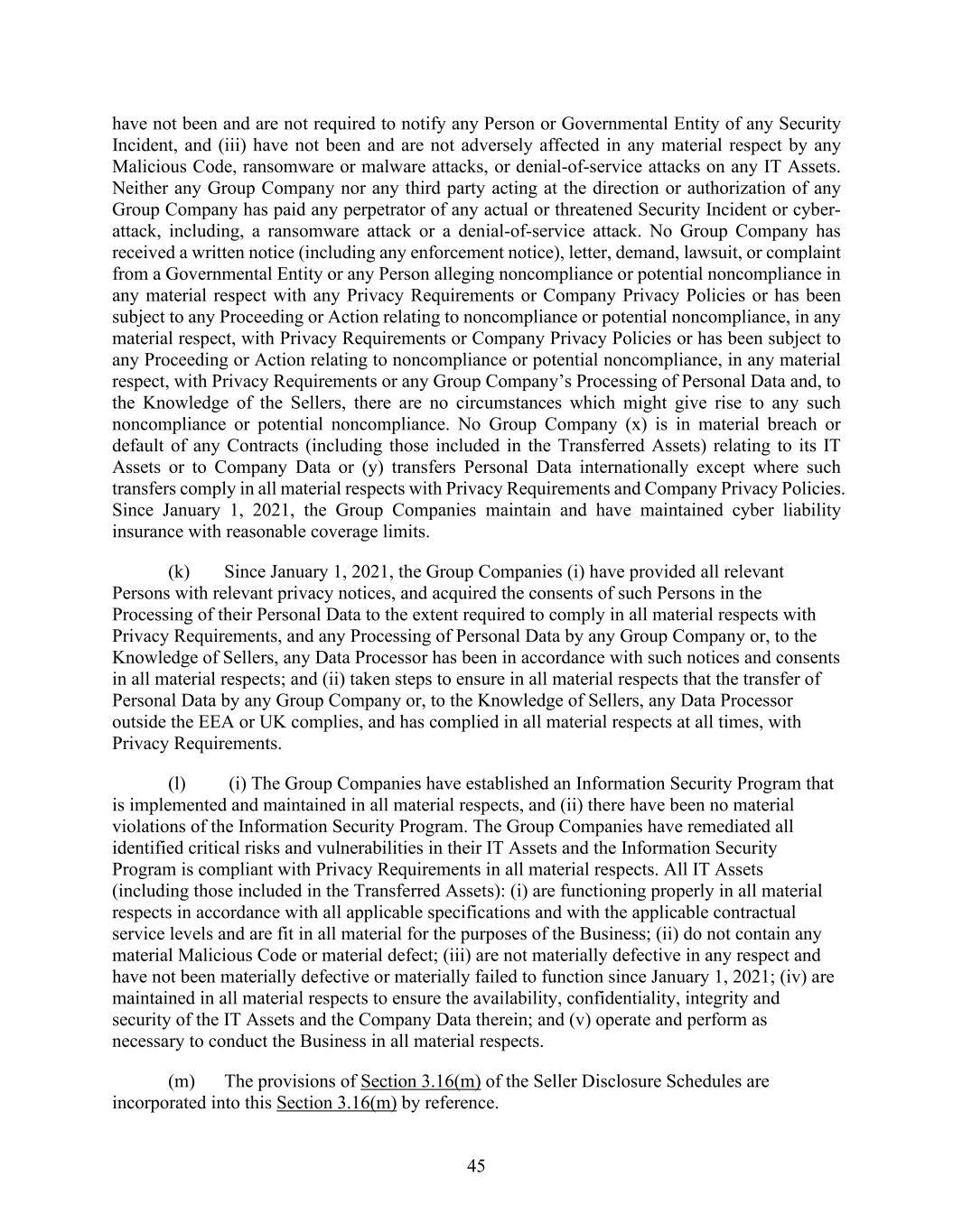 45 have not been and are not required to notify any Person or Governmental Entity of any Security Incident, and (iii) have not been and are not adversely affected in any material respect by any Malicious Code, ransomware or malware attacks, or denial-of-service attacks on any IT Assets. Neither any Group Company nor any third party acting at the direction or authorization of any Group Company has paid any perpetrator of any actual or threatened Security Incident or cyber- attack, including, a ransomware attack or a denial-of-service attack. No Group Company has received a written notice (including any enforcement notice), letter, demand, lawsuit, or complaint from a Governmental Entity or any Person alleging noncompliance or potential noncompliance in any material respect with any Privacy Requirements or Company Privacy Policies or has been subject to any Proceeding or Action relating to noncompliance or potential noncompliance, in any material respect, with Privacy Requirements or Company Privacy Policies or has been subject to any Proceeding or Action relating to noncompliance or potential noncompliance, in any material respect, with Privacy Requirements or any Group Company’s Processing of Personal Data and, to the Knowledge of the Sellers, there are no circumstances which might give rise to any such noncompliance or potential noncompliance. No Group Company (x) is in material breach or default of any Contracts (including those included in the Transferred Assets) relating to its IT Assets or to Company Data or (y) transfers Personal Data internationally except where such transfers comply in all material respects with Privacy Requirements and Company Privacy Policies. Since January 1, 2021, the Group Companies maintain and have maintained cyber liability insurance with reasonable coverage limits. (k) Since January 1, 2021, the Group Companies (i) have provided all relevant Persons with relevant privacy notices, and acquired the consents of such Persons in the Processing of their Personal Data to the extent required to comply in all material respects with Privacy Requirements, and any Processing of Personal Data by any Group Company or, to the Knowledge of Sellers, any Data Processor has been in accordance with such notices and consents in all material respects; and (ii) taken steps to ensure in all material respects that the transfer of Personal Data by any Group Company or, to the Knowledge of Sellers, any Data Processor outside the EEA or UK complies, and has complied in all material respects at all times, with Privacy Requirements. (l) (i) The Group Companies have established an Information Security Program that is implemented and maintained in all material respects, and (ii) there have been no material violations of the Information Security Program. The Group Companies have remediated all identified critical risks and vulnerabilities in their IT Assets and the Information Security Program is compliant with Privacy Requirements in all material respects. All IT Assets (including those included in the Transferred Assets): (i) are functioning properly in all material respects in accordance with all applicable specifications and with the applicable contractual service levels and are fit in all material for the purposes of the Business; (ii) do not contain any material Malicious Code or material defect; (iii) are not materially defective in any respect and have not been materially defective or materially failed to function since January 1, 2021; (iv) are maintained in all material respects to ensure the availability, confidentiality, integrity and security of the IT Assets and the Company Data therein; and (v) operate and perform as necessary to conduct the Business in all material respects. (m) The provisions of Section 3.16(m) of the Seller Disclosure Schedules are incorporated into this Section 3.16(m) by reference.