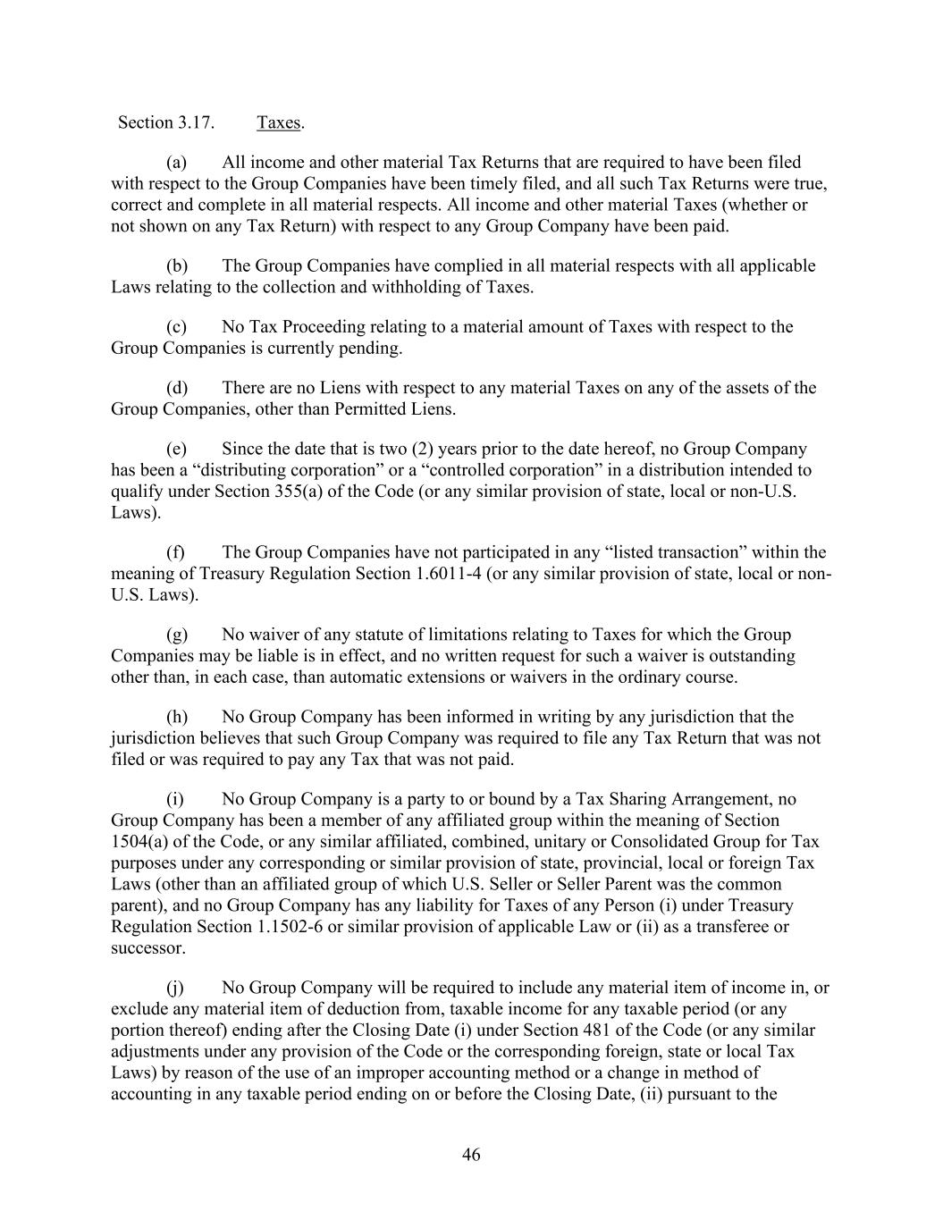 46 Section 3.17. Taxes. (a) All income and other material Tax Returns that are required to have been filed with respect to the Group Companies have been timely filed, and all such Tax Returns were true, correct and complete in all material respects. All income and other material Taxes (whether or not shown on any Tax Return) with respect to any Group Company have been paid. (b) The Group Companies have complied in all material respects with all applicable Laws relating to the collection and withholding of Taxes. (c) No Tax Proceeding relating to a material amount of Taxes with respect to the Group Companies is currently pending. (d) There are no Liens with respect to any material Taxes on any of the assets of the Group Companies, other than Permitted Liens. (e) Since the date that is two (2) years prior to the date hereof, no Group Company has been a “distributing corporation” or a “controlled corporation” in a distribution intended to qualify under Section 355(a) of the Code (or any similar provision of state, local or non-U.S. Laws). (f) The Group Companies have not participated in any “listed transaction” within the meaning of Treasury Regulation Section 1.6011-4 (or any similar provision of state, local or non- U.S. Laws). (g) No waiver of any statute of limitations relating to Taxes for which the Group Companies may be liable is in effect, and no written request for such a waiver is outstanding other than, in each case, than automatic extensions or waivers in the ordinary course. (h) No Group Company has been informed in writing by any jurisdiction that the jurisdiction believes that such Group Company was required to file any Tax Return that was not filed or was required to pay any Tax that was not paid. (i) No Group Company is a party to or bound by a Tax Sharing Arrangement, no Group Company has been a member of any affiliated group within the meaning of Section 1504(a) of the Code, or any similar affiliated, combined, unitary or Consolidated Group for Tax purposes under any corresponding or similar provision of state, provincial, local or foreign Tax Laws (other than an affiliated group of which U.S. Seller or Seller Parent was the common parent), and no Group Company has any liability for Taxes of any Person (i) under Treasury Regulation Section 1.1502-6 or similar provision of applicable Law or (ii) as a transferee or successor. (j) No Group Company will be required to include any material item of income in, or exclude any material item of deduction from, taxable income for any taxable period (or any portion thereof) ending after the Closing Date (i) under Section 481 of the Code (or any similar adjustments under any provision of the Code or the corresponding foreign, state or local Tax Laws) by reason of the use of an improper accounting method or a change in method of accounting in any taxable period ending on or before the Closing Date, (ii) pursuant to the