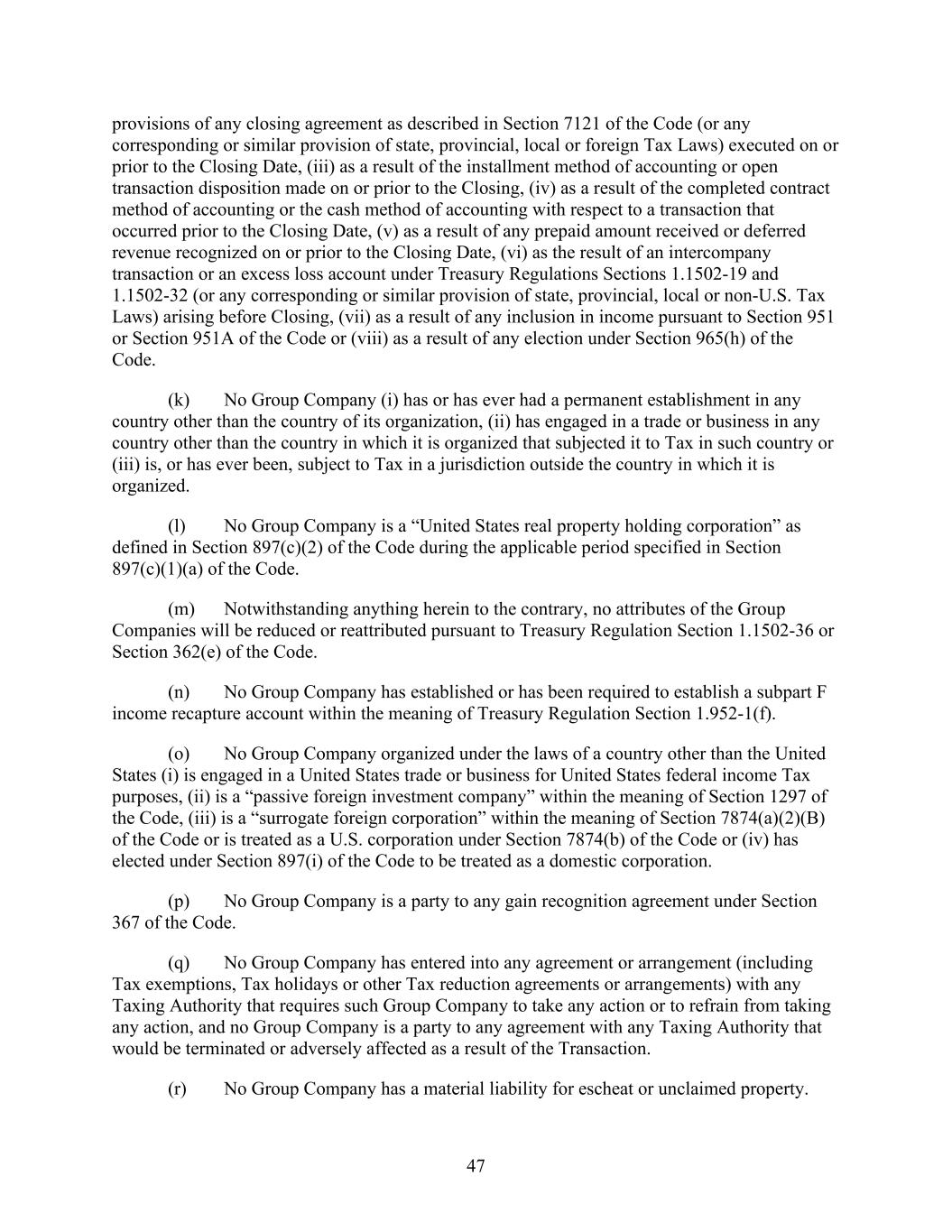 47 provisions of any closing agreement as described in Section 7121 of the Code (or any corresponding or similar provision of state, provincial, local or foreign Tax Laws) executed on or prior to the Closing Date, (iii) as a result of the installment method of accounting or open transaction disposition made on or prior to the Closing, (iv) as a result of the completed contract method of accounting or the cash method of accounting with respect to a transaction that occurred prior to the Closing Date, (v) as a result of any prepaid amount received or deferred revenue recognized on or prior to the Closing Date, (vi) as the result of an intercompany transaction or an excess loss account under Treasury Regulations Sections 1.1502-19 and 1.1502-32 (or any corresponding or similar provision of state, provincial, local or non-U.S. Tax Laws) arising before Closing, (vii) as a result of any inclusion in income pursuant to Section 951 or Section 951A of the Code or (viii) as a result of any election under Section 965(h) of the Code. (k) No Group Company (i) has or has ever had a permanent establishment in any country other than the country of its organization, (ii) has engaged in a trade or business in any country other than the country in which it is organized that subjected it to Tax in such country or (iii) is, or has ever been, subject to Tax in a jurisdiction outside the country in which it is organized. (l) No Group Company is a “United States real property holding corporation” as defined in Section 897(c)(2) of the Code during the applicable period specified in Section 897(c)(1)(a) of the Code. (m) Notwithstanding anything herein to the contrary, no attributes of the Group Companies will be reduced or reattributed pursuant to Treasury Regulation Section 1.1502-36 or Section 362(e) of the Code. (n) No Group Company has established or has been required to establish a subpart F income recapture account within the meaning of Treasury Regulation Section 1.952-1(f). (o) No Group Company organized under the laws of a country other than the United States (i) is engaged in a United States trade or business for United States federal income Tax purposes, (ii) is a “passive foreign investment company” within the meaning of Section 1297 of the Code, (iii) is a “surrogate foreign corporation” within the meaning of Section 7874(a)(2)(B) of the Code or is treated as a U.S. corporation under Section 7874(b) of the Code or (iv) has elected under Section 897(i) of the Code to be treated as a domestic corporation. (p) No Group Company is a party to any gain recognition agreement under Section 367 of the Code. (q) No Group Company has entered into any agreement or arrangement (including Tax exemptions, Tax holidays or other Tax reduction agreements or arrangements) with any Taxing Authority that requires such Group Company to take any action or to refrain from taking any action, and no Group Company is a party to any agreement with any Taxing Authority that would be terminated or adversely affected as a result of the Transaction. (r) No Group Company has a material liability for escheat or unclaimed property.