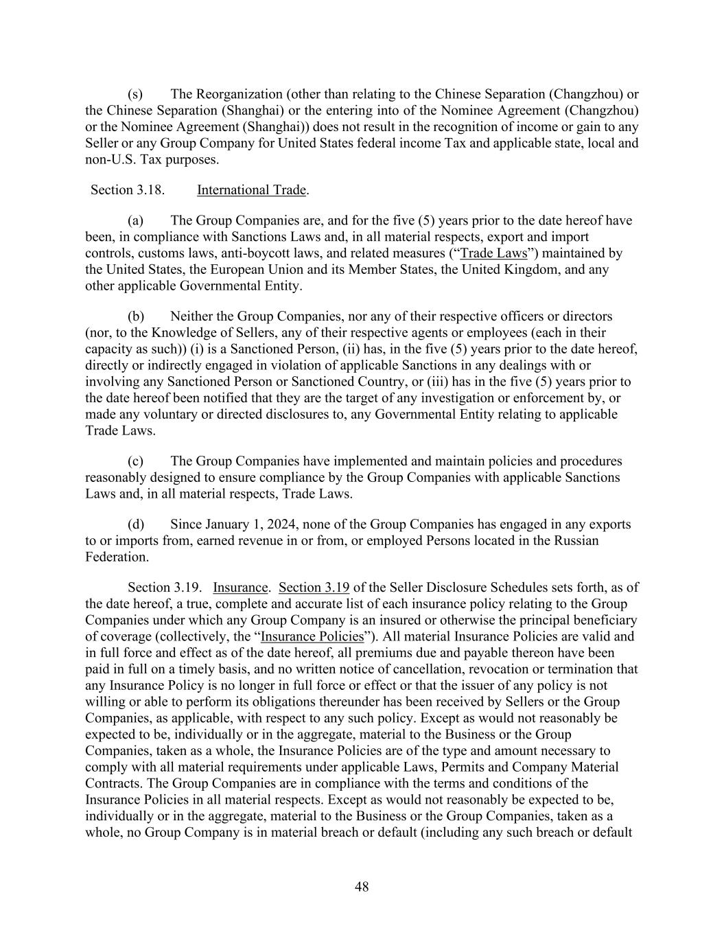 48 (s) The Reorganization (other than relating to the Chinese Separation (Changzhou) or the Chinese Separation (Shanghai) or the entering into of the Nominee Agreement (Changzhou) or the Nominee Agreement (Shanghai)) does not result in the recognition of income or gain to any Seller or any Group Company for United States federal income Tax and applicable state, local and non-U.S. Tax purposes. Section 3.18. International Trade. (a) The Group Companies are, and for the five (5) years prior to the date hereof have been, in compliance with Sanctions Laws and, in all material respects, export and import controls, customs laws, anti-boycott laws, and related measures (“Trade Laws”) maintained by the United States, the European Union and its Member States, the United Kingdom, and any other applicable Governmental Entity. (b) Neither the Group Companies, nor any of their respective officers or directors (nor, to the Knowledge of Sellers, any of their respective agents or employees (each in their capacity as such)) (i) is a Sanctioned Person, (ii) has, in the five (5) years prior to the date hereof, directly or indirectly engaged in violation of applicable Sanctions in any dealings with or involving any Sanctioned Person or Sanctioned Country, or (iii) has in the five (5) years prior to the date hereof been notified that they are the target of any investigation or enforcement by, or made any voluntary or directed disclosures to, any Governmental Entity relating to applicable Trade Laws. (c) The Group Companies have implemented and maintain policies and procedures reasonably designed to ensure compliance by the Group Companies with applicable Sanctions Laws and, in all material respects, Trade Laws. (d) Since January 1, 2024, none of the Group Companies has engaged in any exports to or imports from, earned revenue in or from, or employed Persons located in the Russian Federation. Section 3.19. Insurance. Section 3.19 of the Seller Disclosure Schedules sets forth, as of the date hereof, a true, complete and accurate list of each insurance policy relating to the Group Companies under which any Group Company is an insured or otherwise the principal beneficiary of coverage (collectively, the “Insurance Policies”). All material Insurance Policies are valid and in full force and effect as of the date hereof, all premiums due and payable thereon have been paid in full on a timely basis, and no written notice of cancellation, revocation or termination that any Insurance Policy is no longer in full force or effect or that the issuer of any policy is not willing or able to perform its obligations thereunder has been received by Sellers or the Group Companies, as applicable, with respect to any such policy. Except as would not reasonably be expected to be, individually or in the aggregate, material to the Business or the Group Companies, taken as a whole, the Insurance Policies are of the type and amount necessary to comply with all material requirements under applicable Laws, Permits and Company Material Contracts. The Group Companies are in compliance with the terms and conditions of the Insurance Policies in all material respects. Except as would not reasonably be expected to be, individually or in the aggregate, material to the Business or the Group Companies, taken as a whole, no Group Company is in material breach or default (including any such breach or default