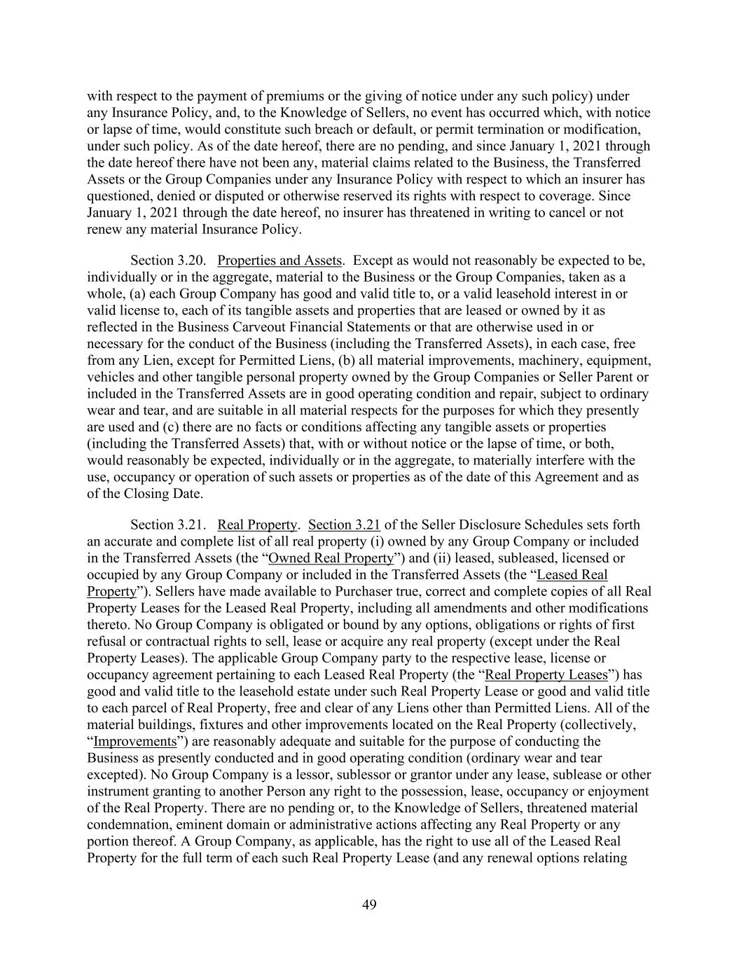 49 with respect to the payment of premiums or the giving of notice under any such policy) under any Insurance Policy, and, to the Knowledge of Sellers, no event has occurred which, with notice or lapse of time, would constitute such breach or default, or permit termination or modification, under such policy. As of the date hereof, there are no pending, and since January 1, 2021 through the date hereof there have not been any, material claims related to the Business, the Transferred Assets or the Group Companies under any Insurance Policy with respect to which an insurer has questioned, denied or disputed or otherwise reserved its rights with respect to coverage. Since January 1, 2021 through the date hereof, no insurer has threatened in writing to cancel or not renew any material Insurance Policy. Section 3.20. Properties and Assets. Except as would not reasonably be expected to be, individually or in the aggregate, material to the Business or the Group Companies, taken as a whole, (a) each Group Company has good and valid title to, or a valid leasehold interest in or valid license to, each of its tangible assets and properties that are leased or owned by it as reflected in the Business Carveout Financial Statements or that are otherwise used in or necessary for the conduct of the Business (including the Transferred Assets), in each case, free from any Lien, except for Permitted Liens, (b) all material improvements, machinery, equipment, vehicles and other tangible personal property owned by the Group Companies or Seller Parent or included in the Transferred Assets are in good operating condition and repair, subject to ordinary wear and tear, and are suitable in all material respects for the purposes for which they presently are used and (c) there are no facts or conditions affecting any tangible assets or properties (including the Transferred Assets) that, with or without notice or the lapse of time, or both, would reasonably be expected, individually or in the aggregate, to materially interfere with the use, occupancy or operation of such assets or properties as of the date of this Agreement and as of the Closing Date. Section 3.21. Real Property. Section 3.21 of the Seller Disclosure Schedules sets forth an accurate and complete list of all real property (i) owned by any Group Company or included in the Transferred Assets (the “Owned Real Property”) and (ii) leased, subleased, licensed or occupied by any Group Company or included in the Transferred Assets (the “Leased Real Property”). Sellers have made available to Purchaser true, correct and complete copies of all Real Property Leases for the Leased Real Property, including all amendments and other modifications thereto. No Group Company is obligated or bound by any options, obligations or rights of first refusal or contractual rights to sell, lease or acquire any real property (except under the Real Property Leases). The applicable Group Company party to the respective lease, license or occupancy agreement pertaining to each Leased Real Property (the “Real Property Leases”) has good and valid title to the leasehold estate under such Real Property Lease or good and valid title to each parcel of Real Property, free and clear of any Liens other than Permitted Liens. All of the material buildings, fixtures and other improvements located on the Real Property (collectively, “Improvements”) are reasonably adequate and suitable for the purpose of conducting the Business as presently conducted and in good operating condition (ordinary wear and tear excepted). No Group Company is a lessor, sublessor or grantor under any lease, sublease or other instrument granting to another Person any right to the possession, lease, occupancy or enjoyment of the Real Property. There are no pending or, to the Knowledge of Sellers, threatened material condemnation, eminent domain or administrative actions affecting any Real Property or any portion thereof. A Group Company, as applicable, has the right to use all of the Leased Real Property for the full term of each such Real Property Lease (and any renewal options relating