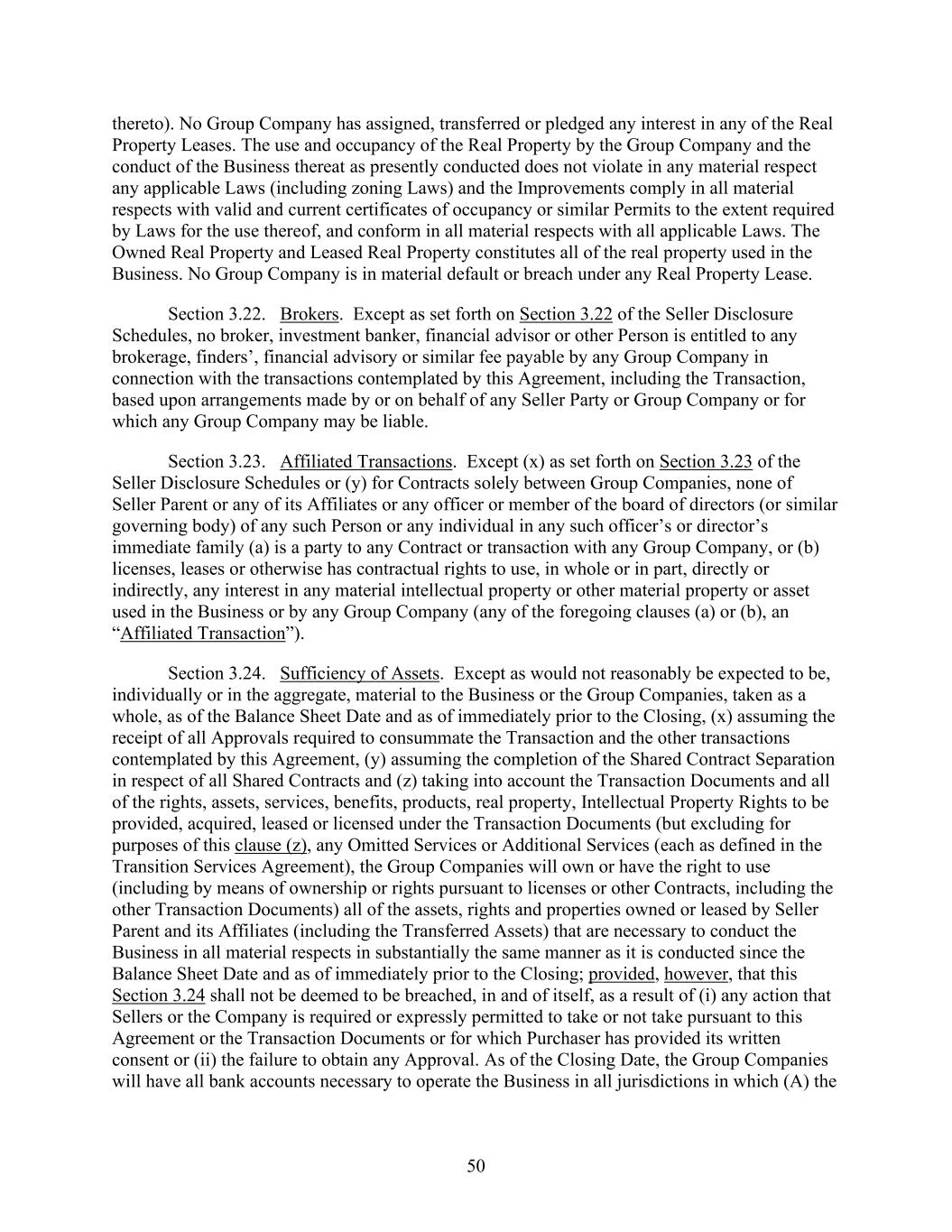 50 thereto). No Group Company has assigned, transferred or pledged any interest in any of the Real Property Leases. The use and occupancy of the Real Property by the Group Company and the conduct of the Business thereat as presently conducted does not violate in any material respect any applicable Laws (including zoning Laws) and the Improvements comply in all material respects with valid and current certificates of occupancy or similar Permits to the extent required by Laws for the use thereof, and conform in all material respects with all applicable Laws. The Owned Real Property and Leased Real Property constitutes all of the real property used in the Business. No Group Company is in material default or breach under any Real Property Lease. Section 3.22. Brokers. Except as set forth on Section 3.22 of the Seller Disclosure Schedules, no broker, investment banker, financial advisor or other Person is entitled to any brokerage, finders’, financial advisory or similar fee payable by any Group Company in connection with the transactions contemplated by this Agreement, including the Transaction, based upon arrangements made by or on behalf of any Seller Party or Group Company or for which any Group Company may be liable. Section 3.23. Affiliated Transactions. Except (x) as set forth on Section 3.23 of the Seller Disclosure Schedules or (y) for Contracts solely between Group Companies, none of Seller Parent or any of its Affiliates or any officer or member of the board of directors (or similar governing body) of any such Person or any individual in any such officer’s or director’s immediate family (a) is a party to any Contract or transaction with any Group Company, or (b) licenses, leases or otherwise has contractual rights to use, in whole or in part, directly or indirectly, any interest in any material intellectual property or other material property or asset used in the Business or by any Group Company (any of the foregoing clauses (a) or (b), an “Affiliated Transaction”). Section 3.24. Sufficiency of Assets. Except as would not reasonably be expected to be, individually or in the aggregate, material to the Business or the Group Companies, taken as a whole, as of the Balance Sheet Date and as of immediately prior to the Closing, (x) assuming the receipt of all Approvals required to consummate the Transaction and the other transactions contemplated by this Agreement, (y) assuming the completion of the Shared Contract Separation in respect of all Shared Contracts and (z) taking into account the Transaction Documents and all of the rights, assets, services, benefits, products, real property, Intellectual Property Rights to be provided, acquired, leased or licensed under the Transaction Documents (but excluding for purposes of this clause (z), any Omitted Services or Additional Services (each as defined in the Transition Services Agreement), the Group Companies will own or have the right to use (including by means of ownership or rights pursuant to licenses or other Contracts, including the other Transaction Documents) all of the assets, rights and properties owned or leased by Seller Parent and its Affiliates (including the Transferred Assets) that are necessary to conduct the Business in all material respects in substantially the same manner as it is conducted since the Balance Sheet Date and as of immediately prior to the Closing; provided, however, that this Section 3.24 shall not be deemed to be breached, in and of itself, as a result of (i) any action that Sellers or the Company is required or expressly permitted to take or not take pursuant to this Agreement or the Transaction Documents or for which Purchaser has provided its written consent or (ii) the failure to obtain any Approval. As of the Closing Date, the Group Companies will have all bank accounts necessary to operate the Business in all jurisdictions in which (A) the