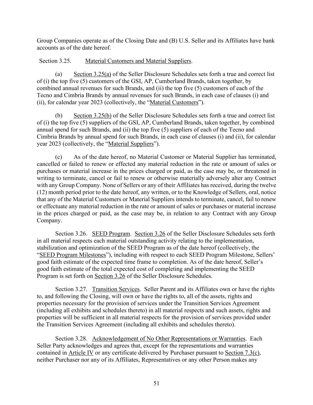 51 Group Companies operate as of the Closing Date and (B) U.S. Seller and its Affiliates have bank accounts as of the date hereof. Section 3.25. Material Customers and Material Suppliers. (a) Section 3.25(a) of the Seller Disclosure Schedules sets forth a true and correct list of (i) the top five (5) customers of the GSI, AP, Cumberland Brands, taken together, by combined annual revenues for such Brands, and (ii) the top five (5) customers of each of the Tecno and Cimbria Brands by annual revenues for such Brands, in each case of clauses (i) and (ii), for calendar year 2023 (collectively, the “Material Customers”). (b) Section 3.25(b) of the Seller Disclosure Schedules sets forth a true and correct list of (i) the top five (5) suppliers of the GSI, AP, Cumberland Brands, taken together, by combined annual spend for such Brands, and (ii) the top five (5) suppliers of each of the Tecno and Cimbria Brands by annual spend for such Brands, in each case of clauses (i) and (ii), for calendar year 2023 (collectively, the “Material Suppliers”). (c) As of the date hereof, no Material Customer or Material Supplier has terminated, cancelled or failed to renew or effected any material reduction in the rate or amount of sales or purchases or material increase in the prices charged or paid, as the case may be, or threatened in writing to terminate, cancel or fail to renew or otherwise materially adversely alter any Contract with any Group Company. None of Sellers or any of their Affiliates has received, during the twelve (12) month period prior to the date hereof, any written, or to the Knowledge of Sellers, oral, notice that any of the Material Customers or Material Suppliers intends to terminate, cancel, fail to renew or effectuate any material reduction in the rate or amount of sales or purchases or material increase in the prices charged or paid, as the case may be, in relation to any Contract with any Group Company. Section 3.26. SEED Program. Section 3.26 of the Seller Disclosure Schedules sets forth in all material respects each material outstanding activity relating to the implementation, stabilization and optimization of the SEED Program as of the date hereof (collectively, the “SEED Program Milestones”), including with respect to each SEED Program Milestone, Sellers’ good faith estimate of the expected time frame to completion. As of the date hereof, Seller’s good faith estimate of the total expected cost of completing and implementing the SEED Program is set forth on Section 3.26 of the Seller Disclosure Schedules. Section 3.27. Transition Services. Seller Parent and its Affiliates own or have the rights to, and following the Closing, will own or have the rights to, all of the assets, rights and properties necessary for the provision of services under the Transition Services Agreement (including all exhibits and schedules thereto) in all material respects and such assets, rights and properties will be sufficient in all material respects for the provision of services provided under the Transition Services Agreement (including all exhibits and schedules thereto). Section 3.28. Acknowledgement of No Other Representations or Warranties. Each Seller Party acknowledges and agrees that, except for the representations and warranties contained in Article IV or any certificate delivered by Purchaser pursuant to Section 7.3(c), neither Purchaser nor any of its Affiliates, Representatives or any other Person makes any