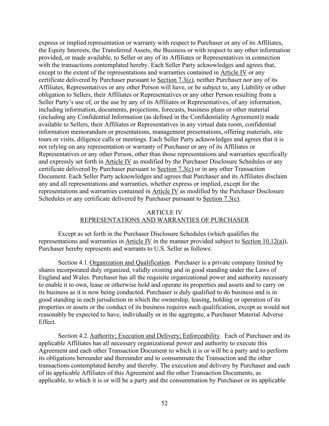 52 express or implied representation or warranty with respect to Purchaser or any of its Affiliates, the Equity Interests, the Transferred Assets, the Business or with respect to any other information provided, or made available, to Seller or any of its Affiliates or Representatives in connection with the transactions contemplated hereby. Each Seller Party acknowledges and agrees that, except to the extent of the representations and warranties contained in Article IV or any certificate delivered by Purchaser pursuant to Section 7.3(c), neither Purchaser nor any of its Affiliates, Representatives or any other Person will have, or be subject to, any Liability or other obligation to Sellers, their Affiliates or Representatives or any other Person resulting from a Seller Party’s use of, or the use by any of its Affiliates or Representatives, of any information, including information, documents, projections, forecasts, business plans or other material (including any Confidential Information (as defined in the Confidentiality Agreement)) made available to Sellers, their Affiliates or Representatives in any virtual data room, confidential information memorandum or presentations, management presentations, offering materials, site tours or visits, diligence calls or meetings. Each Seller Party acknowledges and agrees that it is not relying on any representation or warranty of Purchaser or any of its Affiliates or Representatives or any other Person, other than those representations and warranties specifically and expressly set forth in Article IV as modified by the Purchaser Disclosure Schedules or any certificate delivered by Purchaser pursuant to Section 7.3(c) or in any other Transaction Document. Each Seller Party acknowledges and agrees that Purchaser and its Affiliates disclaim any and all representations and warranties, whether express or implied, except for the representations and warranties contained in Article IV as modified by the Purchaser Disclosure Schedules or any certificate delivered by Purchaser pursuant to Section 7.3(c). ARTICLE IV REPRESENTATIONS AND WARRANTIES OF PURCHASER Except as set forth in the Purchaser Disclosure Schedules (which qualifies the representations and warranties in Article IV in the manner provided subject to Section 10.12(a)), Purchaser hereby represents and warrants to U.S. Seller as follows: Section 4.1. Organization and Qualification. Purchaser is a private company limited by shares incorporated duly organized, validly existing and in good standing under the Laws of England and Wales. Purchaser has all the requisite organizational power and authority necessary to enable it to own, lease or otherwise hold and operate its properties and assets and to carry on its business as it is now being conducted. Purchaser is duly qualified to do business and is in good standing in each jurisdiction in which the ownership, leasing, holding or operation of its properties or assets or the conduct of its business requires such qualification, except as would not reasonably be expected to have, individually or in the aggregate, a Purchaser Material Adverse Effect. Section 4.2. Authority; Execution and Delivery; Enforceability. Each of Purchaser and its applicable Affiliates has all necessary organizational power and authority to execute this Agreement and each other Transaction Document to which it is or will be a party and to perform its obligations hereunder and thereunder and to consummate the Transaction and the other transactions contemplated hereby and thereby. The execution and delivery by Purchaser and each of its applicable Affiliates of this Agreement and the other Transaction Documents, as applicable, to which it is or will be a party and the consummation by Purchaser or its applicable