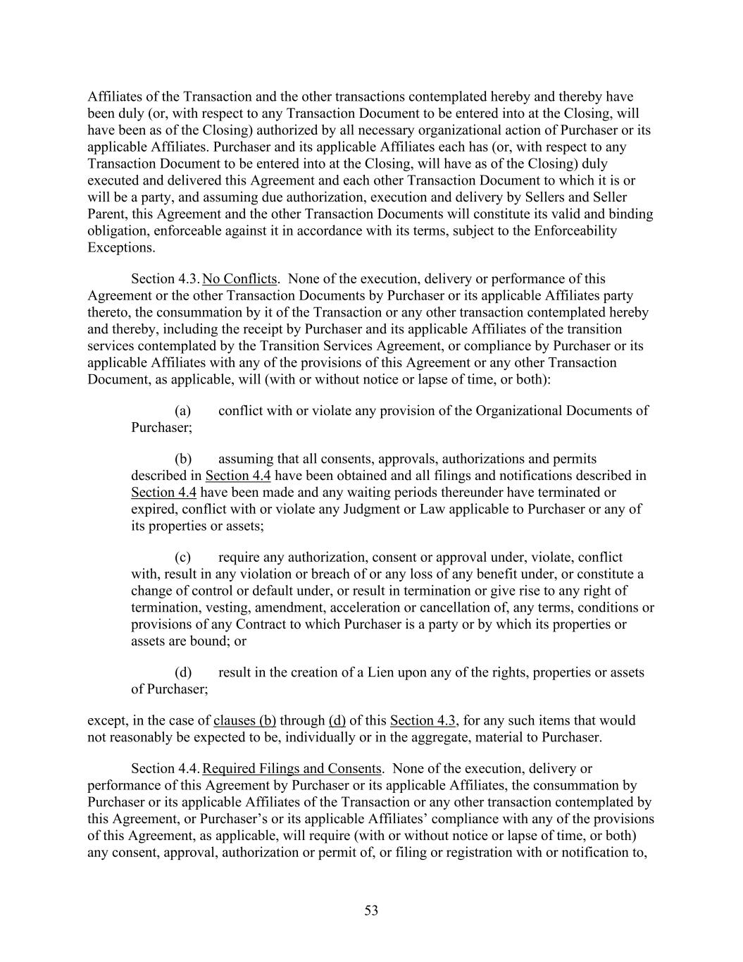 53 Affiliates of the Transaction and the other transactions contemplated hereby and thereby have been duly (or, with respect to any Transaction Document to be entered into at the Closing, will have been as of the Closing) authorized by all necessary organizational action of Purchaser or its applicable Affiliates. Purchaser and its applicable Affiliates each has (or, with respect to any Transaction Document to be entered into at the Closing, will have as of the Closing) duly executed and delivered this Agreement and each other Transaction Document to which it is or will be a party, and assuming due authorization, execution and delivery by Sellers and Seller Parent, this Agreement and the other Transaction Documents will constitute its valid and binding obligation, enforceable against it in accordance with its terms, subject to the Enforceability Exceptions. Section 4.3. No Conflicts. None of the execution, delivery or performance of this Agreement or the other Transaction Documents by Purchaser or its applicable Affiliates party thereto, the consummation by it of the Transaction or any other transaction contemplated hereby and thereby, including the receipt by Purchaser and its applicable Affiliates of the transition services contemplated by the Transition Services Agreement, or compliance by Purchaser or its applicable Affiliates with any of the provisions of this Agreement or any other Transaction Document, as applicable, will (with or without notice or lapse of time, or both): (a) conflict with or violate any provision of the Organizational Documents of Purchaser; (b) assuming that all consents, approvals, authorizations and permits described in Section 4.4 have been obtained and all filings and notifications described in Section 4.4 have been made and any waiting periods thereunder have terminated or expired, conflict with or violate any Judgment or Law applicable to Purchaser or any of its properties or assets; (c) require any authorization, consent or approval under, violate, conflict with, result in any violation or breach of or any loss of any benefit under, or constitute a change of control or default under, or result in termination or give rise to any right of termination, vesting, amendment, acceleration or cancellation of, any terms, conditions or provisions of any Contract to which Purchaser is a party or by which its properties or assets are bound; or (d) result in the creation of a Lien upon any of the rights, properties or assets of Purchaser; except, in the case of clauses (b) through (d) of this Section 4.3, for any such items that would not reasonably be expected to be, individually or in the aggregate, material to Purchaser. Section 4.4. Required Filings and Consents. None of the execution, delivery or performance of this Agreement by Purchaser or its applicable Affiliates, the consummation by Purchaser or its applicable Affiliates of the Transaction or any other transaction contemplated by this Agreement, or Purchaser’s or its applicable Affiliates’ compliance with any of the provisions of this Agreement, as applicable, will require (with or without notice or lapse of time, or both) any consent, approval, authorization or permit of, or filing or registration with or notification to,