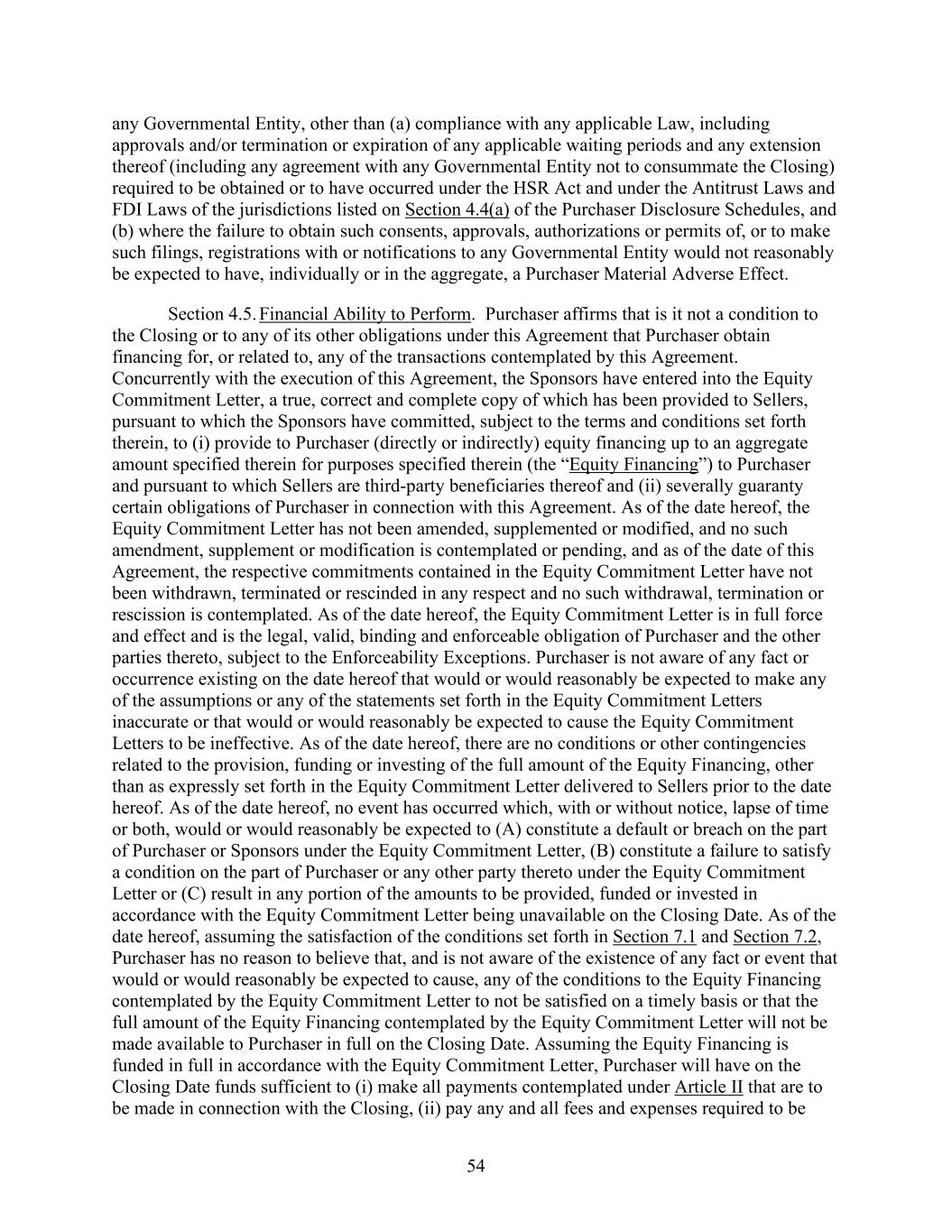 54 any Governmental Entity, other than (a) compliance with any applicable Law, including approvals and/or termination or expiration of any applicable waiting periods and any extension thereof (including any agreement with any Governmental Entity not to consummate the Closing) required to be obtained or to have occurred under the HSR Act and under the Antitrust Laws and FDI Laws of the jurisdictions listed on Section 4.4(a) of the Purchaser Disclosure Schedules, and (b) where the failure to obtain such consents, approvals, authorizations or permits of, or to make such filings, registrations with or notifications to any Governmental Entity would not reasonably be expected to have, individually or in the aggregate, a Purchaser Material Adverse Effect. Section 4.5. Financial Ability to Perform. Purchaser affirms that is it not a condition to the Closing or to any of its other obligations under this Agreement that Purchaser obtain financing for, or related to, any of the transactions contemplated by this Agreement. Concurrently with the execution of this Agreement, the Sponsors have entered into the Equity Commitment Letter, a true, correct and complete copy of which has been provided to Sellers, pursuant to which the Sponsors have committed, subject to the terms and conditions set forth therein, to (i) provide to Purchaser (directly or indirectly) equity financing up to an aggregate amount specified therein for purposes specified therein (the “Equity Financing”) to Purchaser and pursuant to which Sellers are third-party beneficiaries thereof and (ii) severally guaranty certain obligations of Purchaser in connection with this Agreement. As of the date hereof, the Equity Commitment Letter has not been amended, supplemented or modified, and no such amendment, supplement or modification is contemplated or pending, and as of the date of this Agreement, the respective commitments contained in the Equity Commitment Letter have not been withdrawn, terminated or rescinded in any respect and no such withdrawal, termination or rescission is contemplated. As of the date hereof, the Equity Commitment Letter is in full force and effect and is the legal, valid, binding and enforceable obligation of Purchaser and the other parties thereto, subject to the Enforceability Exceptions. Purchaser is not aware of any fact or occurrence existing on the date hereof that would or would reasonably be expected to make any of the assumptions or any of the statements set forth in the Equity Commitment Letters inaccurate or that would or would reasonably be expected to cause the Equity Commitment Letters to be ineffective. As of the date hereof, there are no conditions or other contingencies related to the provision, funding or investing of the full amount of the Equity Financing, other than as expressly set forth in the Equity Commitment Letter delivered to Sellers prior to the date hereof. As of the date hereof, no event has occurred which, with or without notice, lapse of time or both, would or would reasonably be expected to (A) constitute a default or breach on the part of Purchaser or Sponsors under the Equity Commitment Letter, (B) constitute a failure to satisfy a condition on the part of Purchaser or any other party thereto under the Equity Commitment Letter or (C) result in any portion of the amounts to be provided, funded or invested in accordance with the Equity Commitment Letter being unavailable on the Closing Date. As of the date hereof, assuming the satisfaction of the conditions set forth in Section 7.1 and Section 7.2, Purchaser has no reason to believe that, and is not aware of the existence of any fact or event that would or would reasonably be expected to cause, any of the conditions to the Equity Financing contemplated by the Equity Commitment Letter to not be satisfied on a timely basis or that the full amount of the Equity Financing contemplated by the Equity Commitment Letter will not be made available to Purchaser in full on the Closing Date. Assuming the Equity Financing is funded in full in accordance with the Equity Commitment Letter, Purchaser will have on the Closing Date funds sufficient to (i) make all payments contemplated under Article II that are to be made in connection with the Closing, (ii) pay any and all fees and expenses required to be
