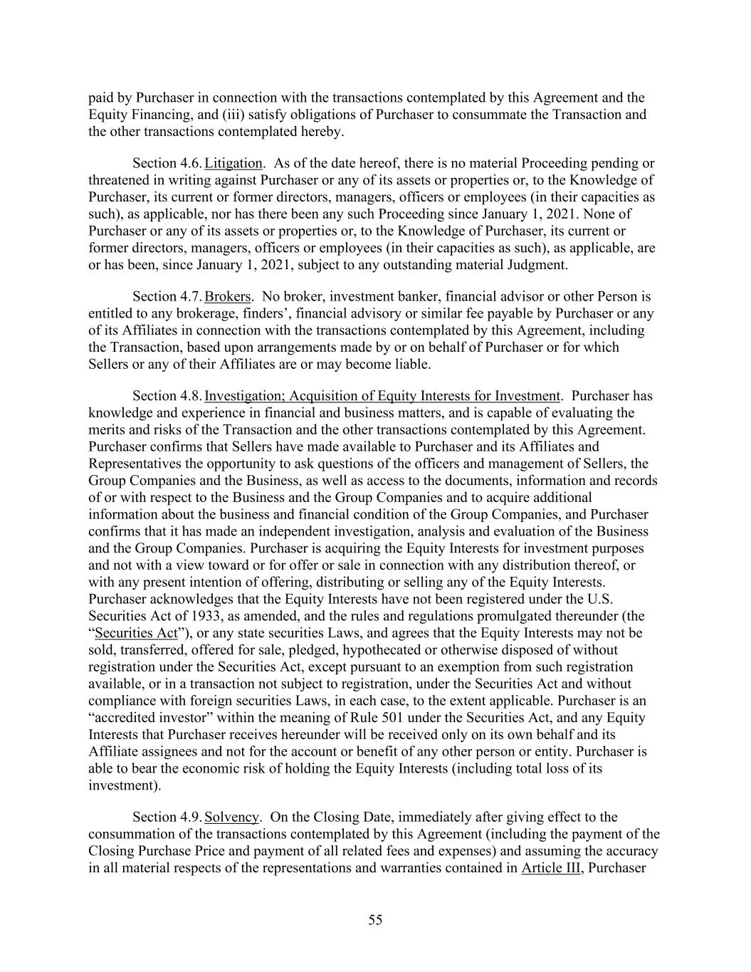 55 paid by Purchaser in connection with the transactions contemplated by this Agreement and the Equity Financing, and (iii) satisfy obligations of Purchaser to consummate the Transaction and the other transactions contemplated hereby. Section 4.6. Litigation. As of the date hereof, there is no material Proceeding pending or threatened in writing against Purchaser or any of its assets or properties or, to the Knowledge of Purchaser, its current or former directors, managers, officers or employees (in their capacities as such), as applicable, nor has there been any such Proceeding since January 1, 2021. None of Purchaser or any of its assets or properties or, to the Knowledge of Purchaser, its current or former directors, managers, officers or employees (in their capacities as such), as applicable, are or has been, since January 1, 2021, subject to any outstanding material Judgment. Section 4.7. Brokers. No broker, investment banker, financial advisor or other Person is entitled to any brokerage, finders’, financial advisory or similar fee payable by Purchaser or any of its Affiliates in connection with the transactions contemplated by this Agreement, including the Transaction, based upon arrangements made by or on behalf of Purchaser or for which Sellers or any of their Affiliates are or may become liable. Section 4.8. Investigation; Acquisition of Equity Interests for Investment. Purchaser has knowledge and experience in financial and business matters, and is capable of evaluating the merits and risks of the Transaction and the other transactions contemplated by this Agreement. Purchaser confirms that Sellers have made available to Purchaser and its Affiliates and Representatives the opportunity to ask questions of the officers and management of Sellers, the Group Companies and the Business, as well as access to the documents, information and records of or with respect to the Business and the Group Companies and to acquire additional information about the business and financial condition of the Group Companies, and Purchaser confirms that it has made an independent investigation, analysis and evaluation of the Business and the Group Companies. Purchaser is acquiring the Equity Interests for investment purposes and not with a view toward or for offer or sale in connection with any distribution thereof, or with any present intention of offering, distributing or selling any of the Equity Interests. Purchaser acknowledges that the Equity Interests have not been registered under the U.S. Securities Act of 1933, as amended, and the rules and regulations promulgated thereunder (the “Securities Act”), or any state securities Laws, and agrees that the Equity Interests may not be sold, transferred, offered for sale, pledged, hypothecated or otherwise disposed of without registration under the Securities Act, except pursuant to an exemption from such registration available, or in a transaction not subject to registration, under the Securities Act and without compliance with foreign securities Laws, in each case, to the extent applicable. Purchaser is an “accredited investor” within the meaning of Rule 501 under the Securities Act, and any Equity Interests that Purchaser receives hereunder will be received only on its own behalf and its Affiliate assignees and not for the account or benefit of any other person or entity. Purchaser is able to bear the economic risk of holding the Equity Interests (including total loss of its investment). Section 4.9. Solvency. On the Closing Date, immediately after giving effect to the consummation of the transactions contemplated by this Agreement (including the payment of the Closing Purchase Price and payment of all related fees and expenses) and assuming the accuracy in all material respects of the representations and warranties contained in Article III, Purchaser