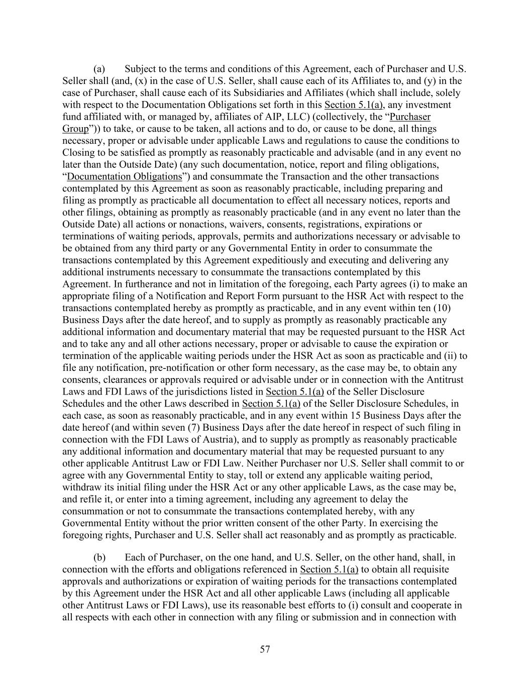 57 (a) Subject to the terms and conditions of this Agreement, each of Purchaser and U.S. Seller shall (and, (x) in the case of U.S. Seller, shall cause each of its Affiliates to, and (y) in the case of Purchaser, shall cause each of its Subsidiaries and Affiliates (which shall include, solely with respect to the Documentation Obligations set forth in this Section 5.1(a), any investment fund affiliated with, or managed by, affiliates of AIP, LLC) (collectively, the “Purchaser Group”)) to take, or cause to be taken, all actions and to do, or cause to be done, all things necessary, proper or advisable under applicable Laws and regulations to cause the conditions to Closing to be satisfied as promptly as reasonably practicable and advisable (and in any event no later than the Outside Date) (any such documentation, notice, report and filing obligations, “Documentation Obligations”) and consummate the Transaction and the other transactions contemplated by this Agreement as soon as reasonably practicable, including preparing and filing as promptly as practicable all documentation to effect all necessary notices, reports and other filings, obtaining as promptly as reasonably practicable (and in any event no later than the Outside Date) all actions or nonactions, waivers, consents, registrations, expirations or terminations of waiting periods, approvals, permits and authorizations necessary or advisable to be obtained from any third party or any Governmental Entity in order to consummate the transactions contemplated by this Agreement expeditiously and executing and delivering any additional instruments necessary to consummate the transactions contemplated by this Agreement. In furtherance and not in limitation of the foregoing, each Party agrees (i) to make an appropriate filing of a Notification and Report Form pursuant to the HSR Act with respect to the transactions contemplated hereby as promptly as practicable, and in any event within ten (10) Business Days after the date hereof, and to supply as promptly as reasonably practicable any additional information and documentary material that may be requested pursuant to the HSR Act and to take any and all other actions necessary, proper or advisable to cause the expiration or termination of the applicable waiting periods under the HSR Act as soon as practicable and (ii) to file any notification, pre-notification or other form necessary, as the case may be, to obtain any consents, clearances or approvals required or advisable under or in connection with the Antitrust Laws and FDI Laws of the jurisdictions listed in Section 5.1(a) of the Seller Disclosure Schedules and the other Laws described in Section 5.1(a) of the Seller Disclosure Schedules, in each case, as soon as reasonably practicable, and in any event within 15 Business Days after the date hereof (and within seven (7) Business Days after the date hereof in respect of such filing in connection with the FDI Laws of Austria), and to supply as promptly as reasonably practicable any additional information and documentary material that may be requested pursuant to any other applicable Antitrust Law or FDI Law. Neither Purchaser nor U.S. Seller shall commit to or agree with any Governmental Entity to stay, toll or extend any applicable waiting period, withdraw its initial filing under the HSR Act or any other applicable Laws, as the case may be, and refile it, or enter into a timing agreement, including any agreement to delay the consummation or not to consummate the transactions contemplated hereby, with any Governmental Entity without the prior written consent of the other Party. In exercising the foregoing rights, Purchaser and U.S. Seller shall act reasonably and as promptly as practicable. (b) Each of Purchaser, on the one hand, and U.S. Seller, on the other hand, shall, in connection with the efforts and obligations referenced in Section 5.1(a) to obtain all requisite approvals and authorizations or expiration of waiting periods for the transactions contemplated by this Agreement under the HSR Act and all other applicable Laws (including all applicable other Antitrust Laws or FDI Laws), use its reasonable best efforts to (i) consult and cooperate in all respects with each other in connection with any filing or submission and in connection with