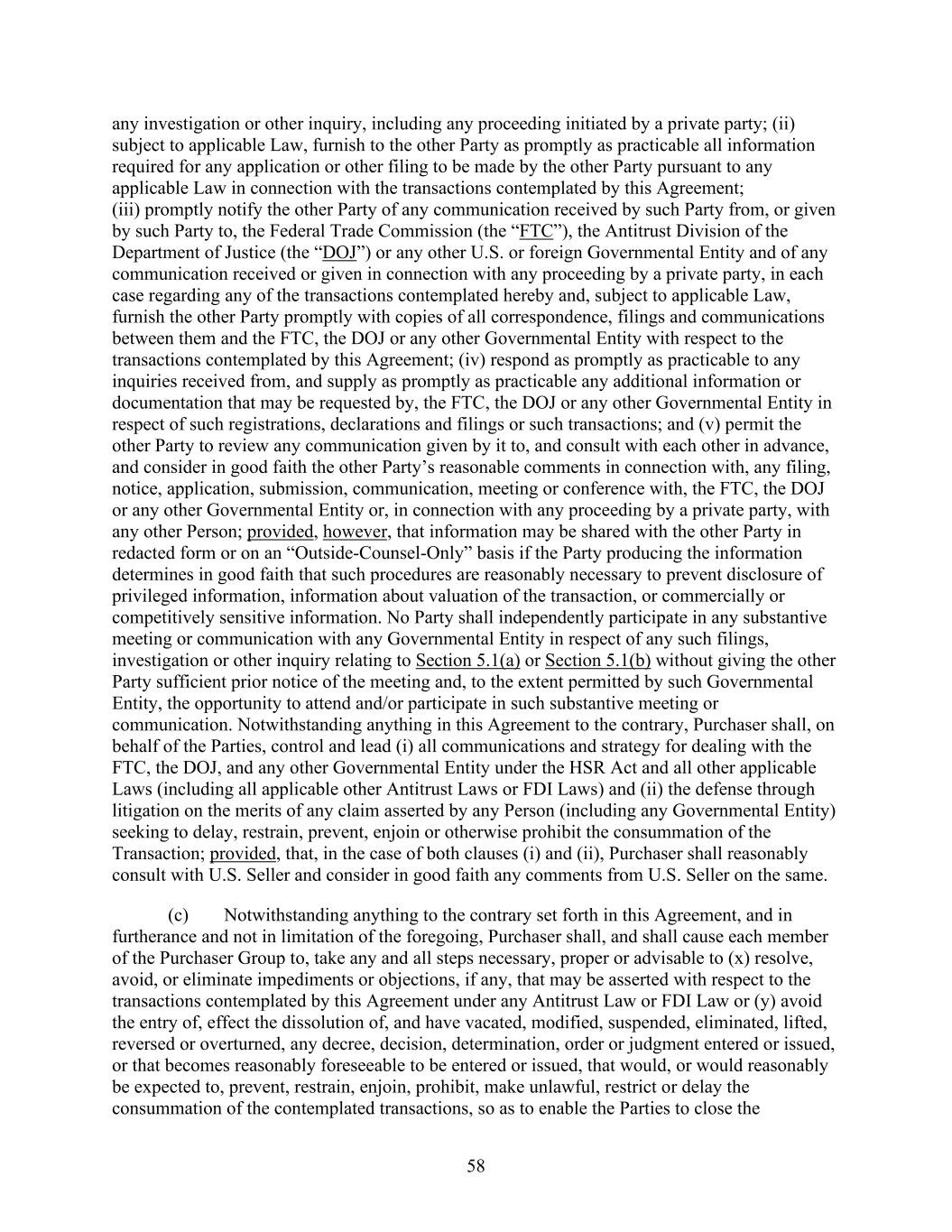 58 any investigation or other inquiry, including any proceeding initiated by a private party; (ii) subject to applicable Law, furnish to the other Party as promptly as practicable all information required for any application or other filing to be made by the other Party pursuant to any applicable Law in connection with the transactions contemplated by this Agreement; (iii) promptly notify the other Party of any communication received by such Party from, or given by such Party to, the Federal Trade Commission (the “FTC”), the Antitrust Division of the Department of Justice (the “DOJ”) or any other U.S. or foreign Governmental Entity and of any communication received or given in connection with any proceeding by a private party, in each case regarding any of the transactions contemplated hereby and, subject to applicable Law, furnish the other Party promptly with copies of all correspondence, filings and communications between them and the FTC, the DOJ or any other Governmental Entity with respect to the transactions contemplated by this Agreement; (iv) respond as promptly as practicable to any inquiries received from, and supply as promptly as practicable any additional information or documentation that may be requested by, the FTC, the DOJ or any other Governmental Entity in respect of such registrations, declarations and filings or such transactions; and (v) permit the other Party to review any communication given by it to, and consult with each other in advance, and consider in good faith the other Party’s reasonable comments in connection with, any filing, notice, application, submission, communication, meeting or conference with, the FTC, the DOJ or any other Governmental Entity or, in connection with any proceeding by a private party, with any other Person; provided, however, that information may be shared with the other Party in redacted form or on an “Outside-Counsel-Only” basis if the Party producing the information determines in good faith that such procedures are reasonably necessary to prevent disclosure of privileged information, information about valuation of the transaction, or commercially or competitively sensitive information. No Party shall independently participate in any substantive meeting or communication with any Governmental Entity in respect of any such filings, investigation or other inquiry relating to Section 5.1(a) or Section 5.1(b) without giving the other Party sufficient prior notice of the meeting and, to the extent permitted by such Governmental Entity, the opportunity to attend and/or participate in such substantive meeting or communication. Notwithstanding anything in this Agreement to the contrary, Purchaser shall, on behalf of the Parties, control and lead (i) all communications and strategy for dealing with the FTC, the DOJ, and any other Governmental Entity under the HSR Act and all other applicable Laws (including all applicable other Antitrust Laws or FDI Laws) and (ii) the defense through litigation on the merits of any claim asserted by any Person (including any Governmental Entity) seeking to delay, restrain, prevent, enjoin or otherwise prohibit the consummation of the Transaction; provided, that, in the case of both clauses (i) and (ii), Purchaser shall reasonably consult with U.S. Seller and consider in good faith any comments from U.S. Seller on the same. (c) Notwithstanding anything to the contrary set forth in this Agreement, and in furtherance and not in limitation of the foregoing, Purchaser shall, and shall cause each member of the Purchaser Group to, take any and all steps necessary, proper or advisable to (x) resolve, avoid, or eliminate impediments or objections, if any, that may be asserted with respect to the transactions contemplated by this Agreement under any Antitrust Law or FDI Law or (y) avoid the entry of, effect the dissolution of, and have vacated, modified, suspended, eliminated, lifted, reversed or overturned, any decree, decision, determination, order or judgment entered or issued, or that becomes reasonably foreseeable to be entered or issued, that would, or would reasonably be expected to, prevent, restrain, enjoin, prohibit, make unlawful, restrict or delay the consummation of the contemplated transactions, so as to enable the Parties to close the