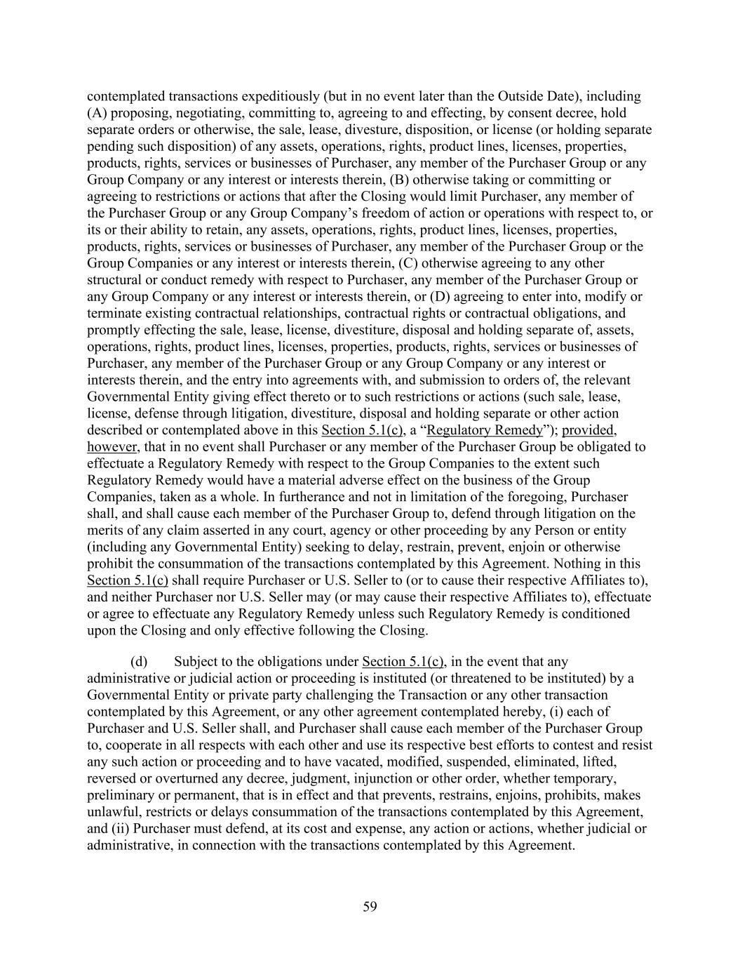 59 contemplated transactions expeditiously (but in no event later than the Outside Date), including (A) proposing, negotiating, committing to, agreeing to and effecting, by consent decree, hold separate orders or otherwise, the sale, lease, divesture, disposition, or license (or holding separate pending such disposition) of any assets, operations, rights, product lines, licenses, properties, products, rights, services or businesses of Purchaser, any member of the Purchaser Group or any Group Company or any interest or interests therein, (B) otherwise taking or committing or agreeing to restrictions or actions that after the Closing would limit Purchaser, any member of the Purchaser Group or any Group Company’s freedom of action or operations with respect to, or its or their ability to retain, any assets, operations, rights, product lines, licenses, properties, products, rights, services or businesses of Purchaser, any member of the Purchaser Group or the Group Companies or any interest or interests therein, (C) otherwise agreeing to any other structural or conduct remedy with respect to Purchaser, any member of the Purchaser Group or any Group Company or any interest or interests therein, or (D) agreeing to enter into, modify or terminate existing contractual relationships, contractual rights or contractual obligations, and promptly effecting the sale, lease, license, divestiture, disposal and holding separate of, assets, operations, rights, product lines, licenses, properties, products, rights, services or businesses of Purchaser, any member of the Purchaser Group or any Group Company or any interest or interests therein, and the entry into agreements with, and submission to orders of, the relevant Governmental Entity giving effect thereto or to such restrictions or actions (such sale, lease, license, defense through litigation, divestiture, disposal and holding separate or other action described or contemplated above in this Section 5.1(c), a “Regulatory Remedy”); provided, however, that in no event shall Purchaser or any member of the Purchaser Group be obligated to effectuate a Regulatory Remedy with respect to the Group Companies to the extent such Regulatory Remedy would have a material adverse effect on the business of the Group Companies, taken as a whole. In furtherance and not in limitation of the foregoing, Purchaser shall, and shall cause each member of the Purchaser Group to, defend through litigation on the merits of any claim asserted in any court, agency or other proceeding by any Person or entity (including any Governmental Entity) seeking to delay, restrain, prevent, enjoin or otherwise prohibit the consummation of the transactions contemplated by this Agreement. Nothing in this Section 5.1(c) shall require Purchaser or U.S. Seller to (or to cause their respective Affiliates to), and neither Purchaser nor U.S. Seller may (or may cause their respective Affiliates to), effectuate or agree to effectuate any Regulatory Remedy unless such Regulatory Remedy is conditioned upon the Closing and only effective following the Closing. (d) Subject to the obligations under Section 5.1(c), in the event that any administrative or judicial action or proceeding is instituted (or threatened to be instituted) by a Governmental Entity or private party challenging the Transaction or any other transaction contemplated by this Agreement, or any other agreement contemplated hereby, (i) each of Purchaser and U.S. Seller shall, and Purchaser shall cause each member of the Purchaser Group to, cooperate in all respects with each other and use its respective best efforts to contest and resist any such action or proceeding and to have vacated, modified, suspended, eliminated, lifted, reversed or overturned any decree, judgment, injunction or other order, whether temporary, preliminary or permanent, that is in effect and that prevents, restrains, enjoins, prohibits, makes unlawful, restricts or delays consummation of the transactions contemplated by this Agreement, and (ii) Purchaser must defend, at its cost and expense, any action or actions, whether judicial or administrative, in connection with the transactions contemplated by this Agreement.