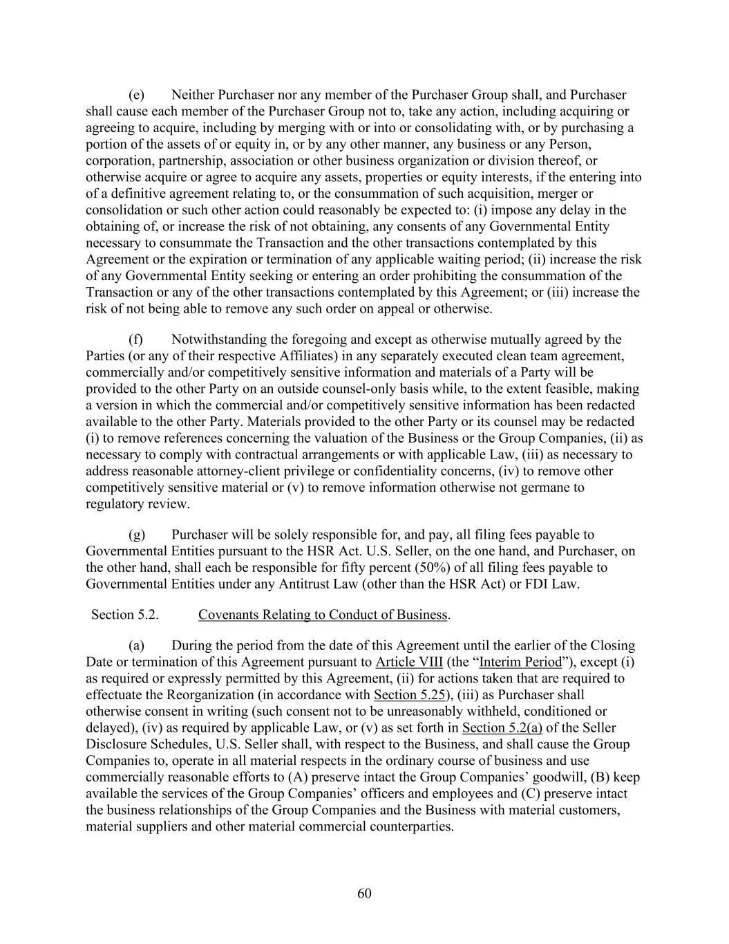 60 (e) Neither Purchaser nor any member of the Purchaser Group shall, and Purchaser shall cause each member of the Purchaser Group not to, take any action, including acquiring or agreeing to acquire, including by merging with or into or consolidating with, or by purchasing a portion of the assets of or equity in, or by any other manner, any business or any Person, corporation, partnership, association or other business organization or division thereof, or otherwise acquire or agree to acquire any assets, properties or equity interests, if the entering into of a definitive agreement relating to, or the consummation of such acquisition, merger or consolidation or such other action could reasonably be expected to: (i) impose any delay in the obtaining of, or increase the risk of not obtaining, any consents of any Governmental Entity necessary to consummate the Transaction and the other transactions contemplated by this Agreement or the expiration or termination of any applicable waiting period; (ii) increase the risk of any Governmental Entity seeking or entering an order prohibiting the consummation of the Transaction or any of the other transactions contemplated by this Agreement; or (iii) increase the risk of not being able to remove any such order on appeal or otherwise. (f) Notwithstanding the foregoing and except as otherwise mutually agreed by the Parties (or any of their respective Affiliates) in any separately executed clean team agreement, commercially and/or competitively sensitive information and materials of a Party will be provided to the other Party on an outside counsel-only basis while, to the extent feasible, making a version in which the commercial and/or competitively sensitive information has been redacted available to the other Party. Materials provided to the other Party or its counsel may be redacted (i) to remove references concerning the valuation of the Business or the Group Companies, (ii) as necessary to comply with contractual arrangements or with applicable Law, (iii) as necessary to address reasonable attorney-client privilege or confidentiality concerns, (iv) to remove other competitively sensitive material or (v) to remove information otherwise not germane to regulatory review. (g) Purchaser will be solely responsible for, and pay, all filing fees payable to Governmental Entities pursuant to the HSR Act. U.S. Seller, on the one hand, and Purchaser, on the other hand, shall each be responsible for fifty percent (50%) of all filing fees payable to Governmental Entities under any Antitrust Law (other than the HSR Act) or FDI Law. Section 5.2. Covenants Relating to Conduct of Business. (a) During the period from the date of this Agreement until the earlier of the Closing Date or termination of this Agreement pursuant to Article VIII (the “Interim Period”), except (i) as required or expressly permitted by this Agreement, (ii) for actions taken that are required to effectuate the Reorganization (in accordance with Section 5.25), (iii) as Purchaser shall otherwise consent in writing (such consent not to be unreasonably withheld, conditioned or delayed), (iv) as required by applicable Law, or (v) as set forth in Section 5.2(a) of the Seller Disclosure Schedules, U.S. Seller shall, with respect to the Business, and shall cause the Group Companies to, operate in all material respects in the ordinary course of business and use commercially reasonable efforts to (A) preserve intact the Group Companies’ goodwill, (B) keep available the services of the Group Companies’ officers and employees and (C) preserve intact the business relationships of the Group Companies and the Business with material customers, material suppliers and other material commercial counterparties.