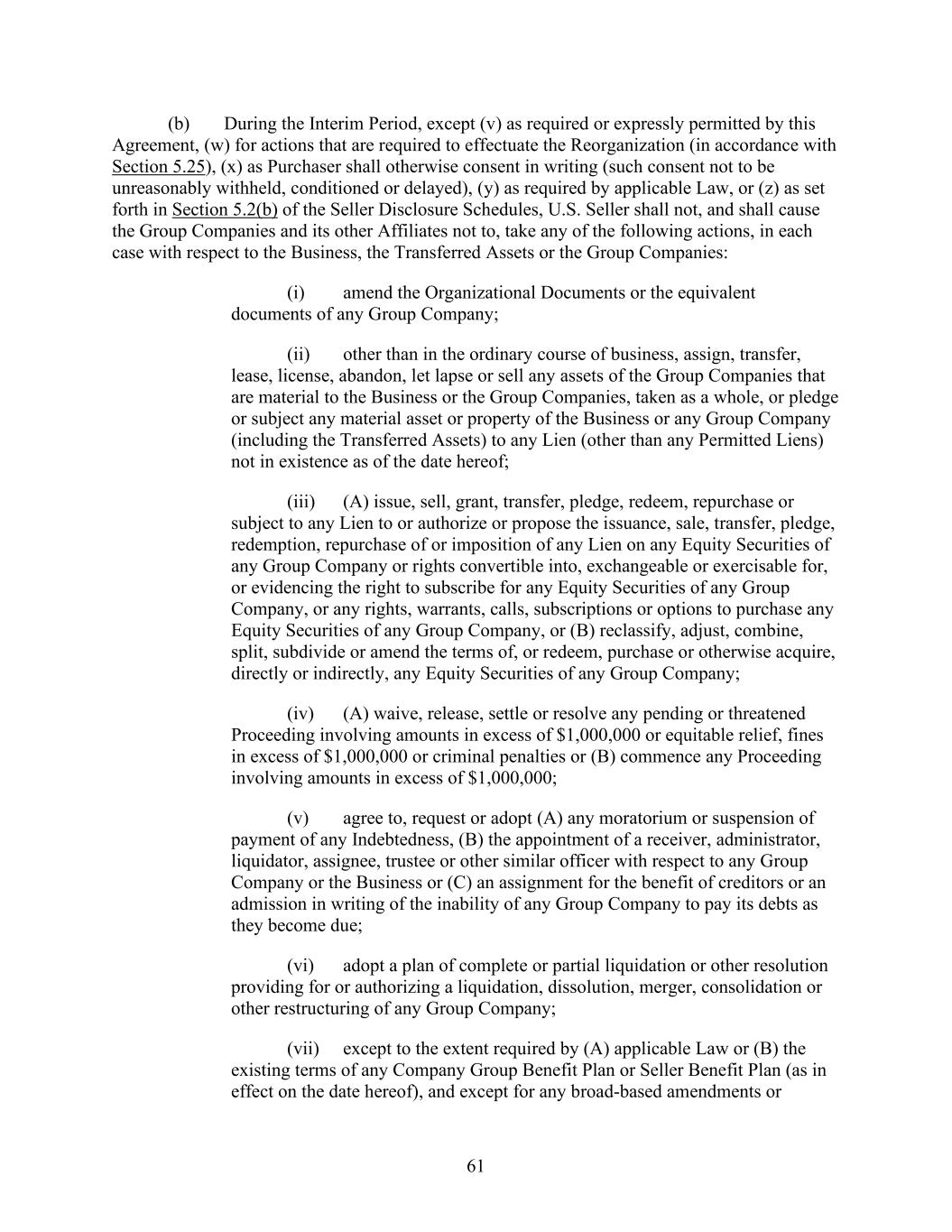61 (b) During the Interim Period, except (v) as required or expressly permitted by this Agreement, (w) for actions that are required to effectuate the Reorganization (in accordance with Section 5.25), (x) as Purchaser shall otherwise consent in writing (such consent not to be unreasonably withheld, conditioned or delayed), (y) as required by applicable Law, or (z) as set forth in Section 5.2(b) of the Seller Disclosure Schedules, U.S. Seller shall not, and shall cause the Group Companies and its other Affiliates not to, take any of the following actions, in each case with respect to the Business, the Transferred Assets or the Group Companies: (i) amend the Organizational Documents or the equivalent documents of any Group Company; (ii) other than in the ordinary course of business, assign, transfer, lease, license, abandon, let lapse or sell any assets of the Group Companies that are material to the Business or the Group Companies, taken as a whole, or pledge or subject any material asset or property of the Business or any Group Company (including the Transferred Assets) to any Lien (other than any Permitted Liens) not in existence as of the date hereof; (iii) (A) issue, sell, grant, transfer, pledge, redeem, repurchase or subject to any Lien to or authorize or propose the issuance, sale, transfer, pledge, redemption, repurchase of or imposition of any Lien on any Equity Securities of any Group Company or rights convertible into, exchangeable or exercisable for, or evidencing the right to subscribe for any Equity Securities of any Group Company, or any rights, warrants, calls, subscriptions or options to purchase any Equity Securities of any Group Company, or (B) reclassify, adjust, combine, split, subdivide or amend the terms of, or redeem, purchase or otherwise acquire, directly or indirectly, any Equity Securities of any Group Company; (iv) (A) waive, release, settle or resolve any pending or threatened Proceeding involving amounts in excess of $1,000,000 or equitable relief, fines in excess of $1,000,000 or criminal penalties or (B) commence any Proceeding involving amounts in excess of $1,000,000; (v) agree to, request or adopt (A) any moratorium or suspension of payment of any Indebtedness, (B) the appointment of a receiver, administrator, liquidator, assignee, trustee or other similar officer with respect to any Group Company or the Business or (C) an assignment for the benefit of creditors or an admission in writing of the inability of any Group Company to pay its debts as they become due; (vi) adopt a plan of complete or partial liquidation or other resolution providing for or authorizing a liquidation, dissolution, merger, consolidation or other restructuring of any Group Company; (vii) except to the extent required by (A) applicable Law or (B) the existing terms of any Company Group Benefit Plan or Seller Benefit Plan (as in effect on the date hereof), and except for any broad-based amendments or