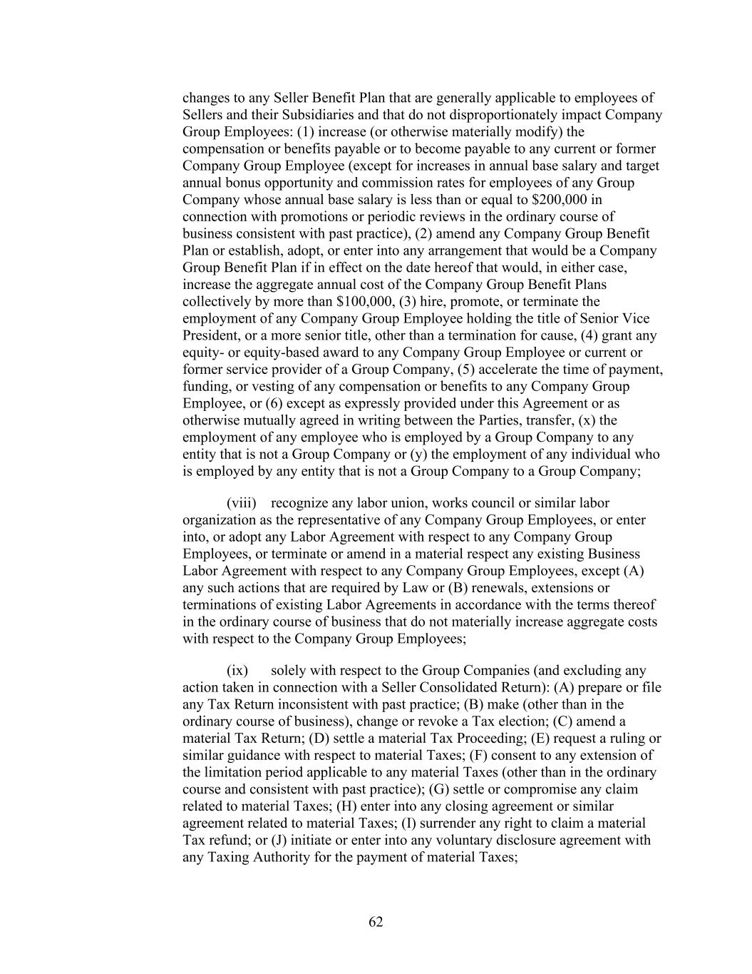 62 changes to any Seller Benefit Plan that are generally applicable to employees of Sellers and their Subsidiaries and that do not disproportionately impact Company Group Employees: (1) increase (or otherwise materially modify) the compensation or benefits payable or to become payable to any current or former Company Group Employee (except for increases in annual base salary and target annual bonus opportunity and commission rates for employees of any Group Company whose annual base salary is less than or equal to $200,000 in connection with promotions or periodic reviews in the ordinary course of business consistent with past practice), (2) amend any Company Group Benefit Plan or establish, adopt, or enter into any arrangement that would be a Company Group Benefit Plan if in effect on the date hereof that would, in either case, increase the aggregate annual cost of the Company Group Benefit Plans collectively by more than $100,000, (3) hire, promote, or terminate the employment of any Company Group Employee holding the title of Senior Vice President, or a more senior title, other than a termination for cause, (4) grant any equity- or equity-based award to any Company Group Employee or current or former service provider of a Group Company, (5) accelerate the time of payment, funding, or vesting of any compensation or benefits to any Company Group Employee, or (6) except as expressly provided under this Agreement or as otherwise mutually agreed in writing between the Parties, transfer, (x) the employment of any employee who is employed by a Group Company to any entity that is not a Group Company or (y) the employment of any individual who is employed by any entity that is not a Group Company to a Group Company; (viii) recognize any labor union, works council or similar labor organization as the representative of any Company Group Employees, or enter into, or adopt any Labor Agreement with respect to any Company Group Employees, or terminate or amend in a material respect any existing Business Labor Agreement with respect to any Company Group Employees, except (A) any such actions that are required by Law or (B) renewals, extensions or terminations of existing Labor Agreements in accordance with the terms thereof in the ordinary course of business that do not materially increase aggregate costs with respect to the Company Group Employees; (ix) solely with respect to the Group Companies (and excluding any action taken in connection with a Seller Consolidated Return): (A) prepare or file any Tax Return inconsistent with past practice; (B) make (other than in the ordinary course of business), change or revoke a Tax election; (C) amend a material Tax Return; (D) settle a material Tax Proceeding; (E) request a ruling or similar guidance with respect to material Taxes; (F) consent to any extension of the limitation period applicable to any material Taxes (other than in the ordinary course and consistent with past practice); (G) settle or compromise any claim related to material Taxes; (H) enter into any closing agreement or similar agreement related to material Taxes; (I) surrender any right to claim a material Tax refund; or (J) initiate or enter into any voluntary disclosure agreement with any Taxing Authority for the payment of material Taxes;