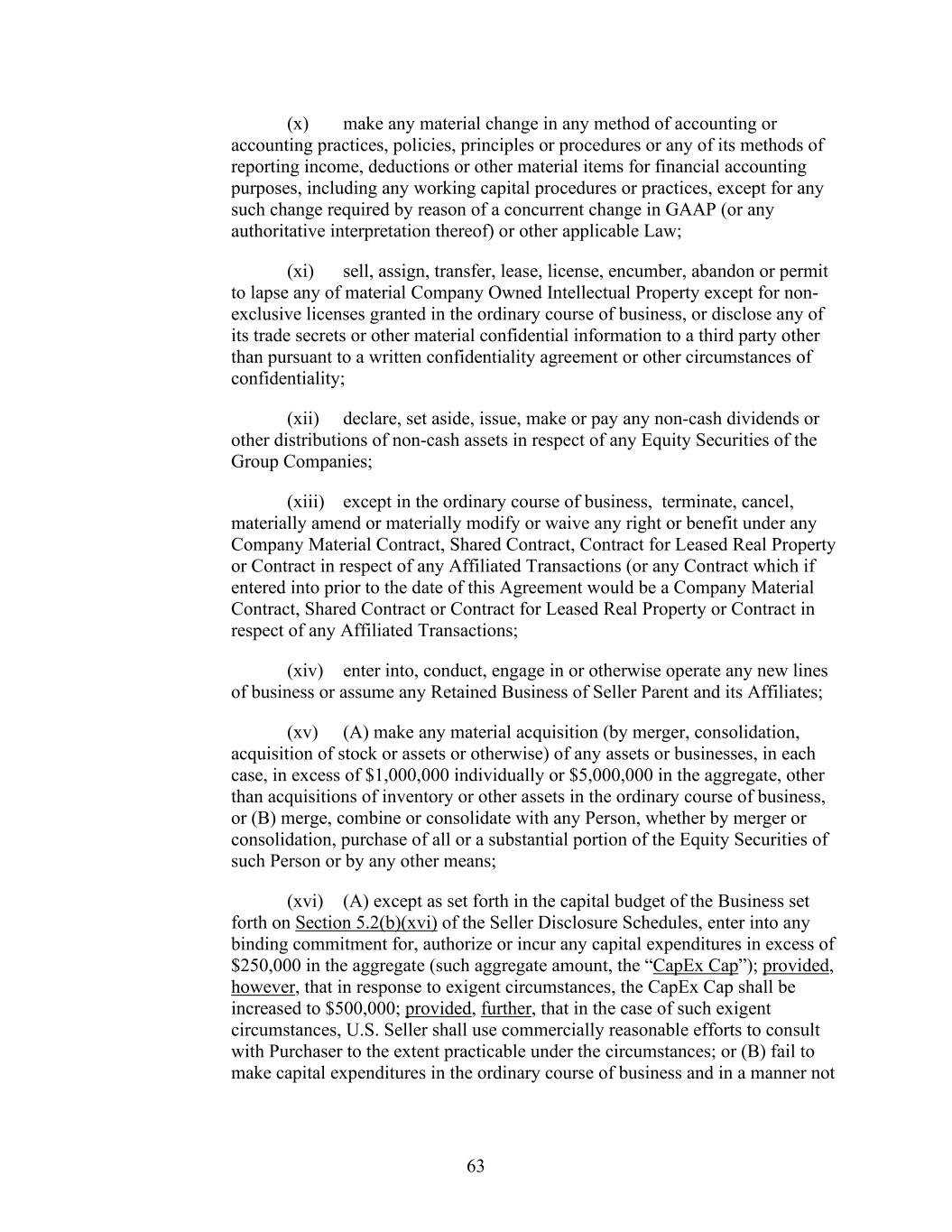 63 (x) make any material change in any method of accounting or accounting practices, policies, principles or procedures or any of its methods of reporting income, deductions or other material items for financial accounting purposes, including any working capital procedures or practices, except for any such change required by reason of a concurrent change in GAAP (or any authoritative interpretation thereof) or other applicable Law; (xi) sell, assign, transfer, lease, license, encumber, abandon or permit to lapse any of material Company Owned Intellectual Property except for non- exclusive licenses granted in the ordinary course of business, or disclose any of its trade secrets or other material confidential information to a third party other than pursuant to a written confidentiality agreement or other circumstances of confidentiality; (xii) declare, set aside, issue, make or pay any non-cash dividends or other distributions of non-cash assets in respect of any Equity Securities of the Group Companies; (xiii) except in the ordinary course of business, terminate, cancel, materially amend or materially modify or waive any right or benefit under any Company Material Contract, Shared Contract, Contract for Leased Real Property or Contract in respect of any Affiliated Transactions (or any Contract which if entered into prior to the date of this Agreement would be a Company Material Contract, Shared Contract or Contract for Leased Real Property or Contract in respect of any Affiliated Transactions; (xiv) enter into, conduct, engage in or otherwise operate any new lines of business or assume any Retained Business of Seller Parent and its Affiliates; (xv) (A) make any material acquisition (by merger, consolidation, acquisition of stock or assets or otherwise) of any assets or businesses, in each case, in excess of $1,000,000 individually or $5,000,000 in the aggregate, other than acquisitions of inventory or other assets in the ordinary course of business, or (B) merge, combine or consolidate with any Person, whether by merger or consolidation, purchase of all or a substantial portion of the Equity Securities of such Person or by any other means; (xvi) (A) except as set forth in the capital budget of the Business set forth on Section 5.2(b)(xvi) of the Seller Disclosure Schedules, enter into any binding commitment for, authorize or incur any capital expenditures in excess of $250,000 in the aggregate (such aggregate amount, the “CapEx Cap”); provided, however, that in response to exigent circumstances, the CapEx Cap shall be increased to $500,000; provided, further, that in the case of such exigent circumstances, U.S. Seller shall use commercially reasonable efforts to consult with Purchaser to the extent practicable under the circumstances; or (B) fail to make capital expenditures in the ordinary course of business and in a manner not