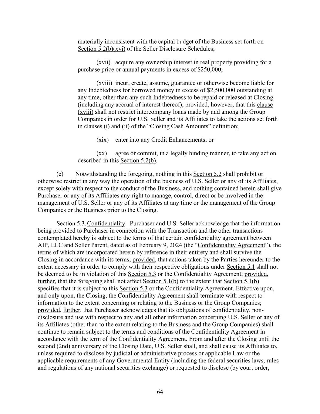64 materially inconsistent with the capital budget of the Business set forth on Section 5.2(b)(xvi) of the Seller Disclosure Schedules; (xvii) acquire any ownership interest in real property providing for a purchase price or annual payments in excess of $250,000; (xviii) incur, create, assume, guarantee or otherwise become liable for any Indebtedness for borrowed money in excess of $2,500,000 outstanding at any time, other than any such Indebtedness to be repaid or released at Closing (including any accrual of interest thereof); provided, however, that this clause (xviii) shall not restrict intercompany loans made by and among the Group Companies in order for U.S. Seller and its Affiliates to take the actions set forth in clauses (i) and (ii) of the “Closing Cash Amounts” definition; (xix) enter into any Credit Enhancements; or (xx) agree or commit, in a legally binding manner, to take any action described in this Section 5.2(b). (c) Notwithstanding the foregoing, nothing in this Section 5.2 shall prohibit or otherwise restrict in any way the operation of the business of U.S. Seller or any of its Affiliates, except solely with respect to the conduct of the Business, and nothing contained herein shall give Purchaser or any of its Affiliates any right to manage, control, direct or be involved in the management of U.S. Seller or any of its Affiliates at any time or the management of the Group Companies or the Business prior to the Closing. Section 5.3. Confidentiality. Purchaser and U.S. Seller acknowledge that the information being provided to Purchaser in connection with the Transaction and the other transactions contemplated hereby is subject to the terms of that certain confidentiality agreement between AIP, LLC and Seller Parent, dated as of February 9, 2024 (the “Confidentiality Agreement”), the terms of which are incorporated herein by reference in their entirety and shall survive the Closing in accordance with its terms; provided, that actions taken by the Parties hereunder to the extent necessary in order to comply with their respective obligations under Section 5.1 shall not be deemed to be in violation of this Section 5.3 or the Confidentiality Agreement; provided, further, that the foregoing shall not affect Section 5.1(b) to the extent that Section 5.1(b) specifies that it is subject to this Section 5.3 or the Confidentiality Agreement. Effective upon, and only upon, the Closing, the Confidentiality Agreement shall terminate with respect to information to the extent concerning or relating to the Business or the Group Companies; provided, further, that Purchaser acknowledges that its obligations of confidentiality, non- disclosure and use with respect to any and all other information concerning U.S. Seller or any of its Affiliates (other than to the extent relating to the Business and the Group Companies) shall continue to remain subject to the terms and conditions of the Confidentiality Agreement in accordance with the term of the Confidentiality Agreement. From and after the Closing until the second (2nd) anniversary of the Closing Date, U.S. Seller shall, and shall cause its Affiliates to, unless required to disclose by judicial or administrative process or applicable Law or the applicable requirements of any Governmental Entity (including the federal securities laws, rules and regulations of any national securities exchange) or requested to disclose (by court order,